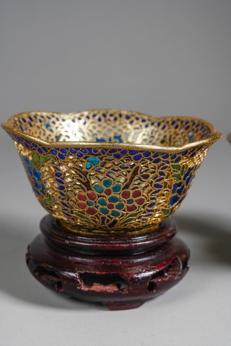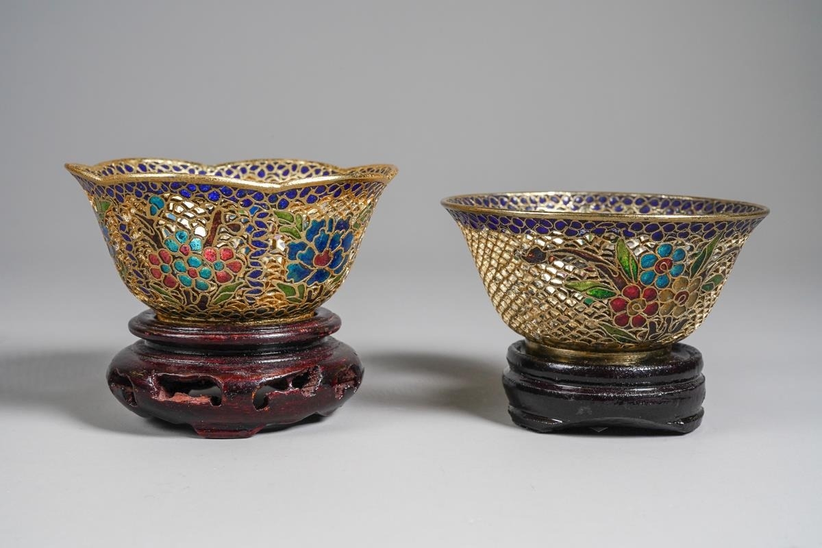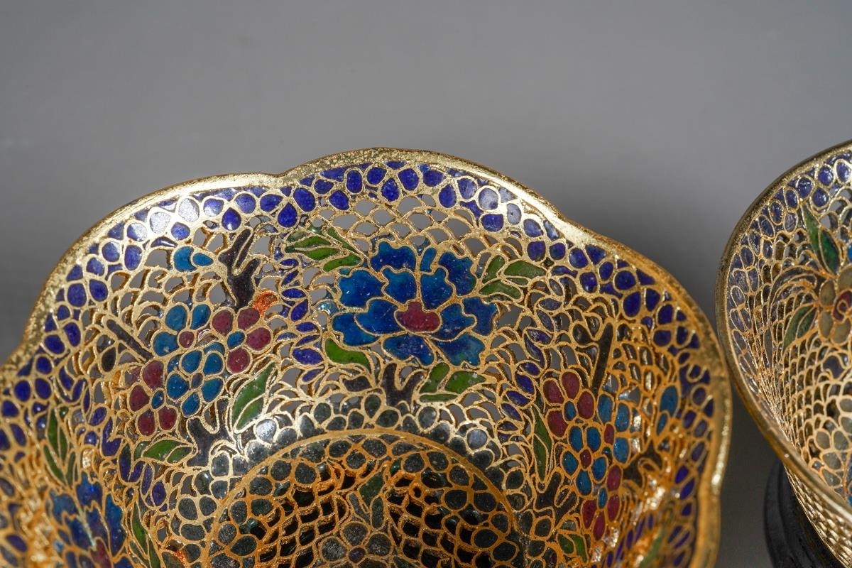 Two modern Chinese gilt metal plique a jour bowls, both with fish scale and flower decoration, the fish scales undecorated, both with wooden stands, the wavy rimmed bowl diameter 8cm x height 4cm and the other diameter 7.7cm x height 4cm (4)