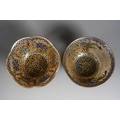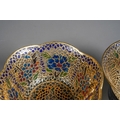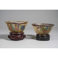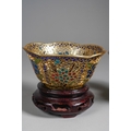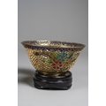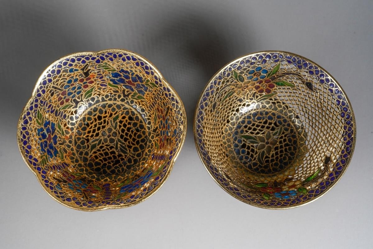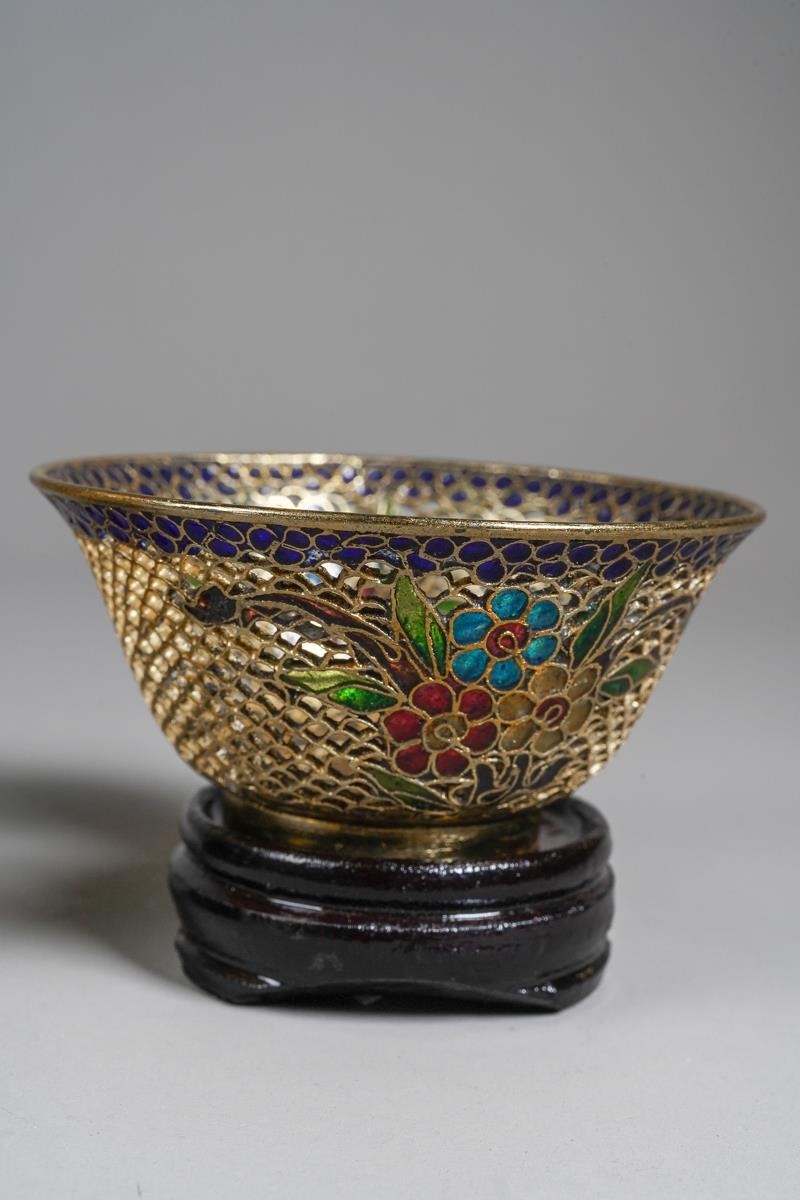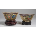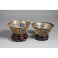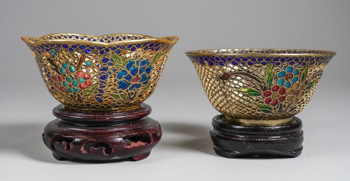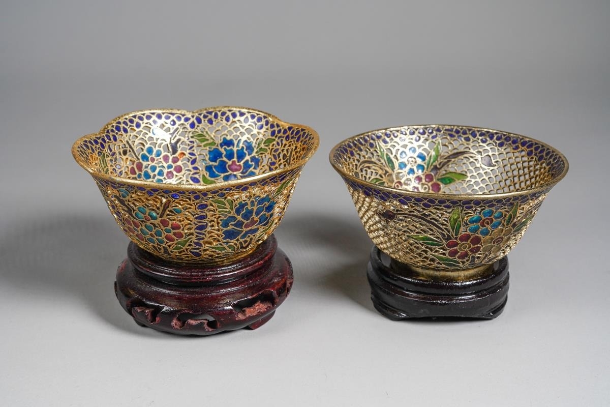 Two modern Chinese gilt metal plique a jour bowls, both with fish scale and flower decoration, the fish scales undecorated, both with wooden stands, the wavy rimmed bowl diameter 8cm x height 4cm and the other diameter 7.7cm x height 4cm (4)