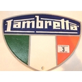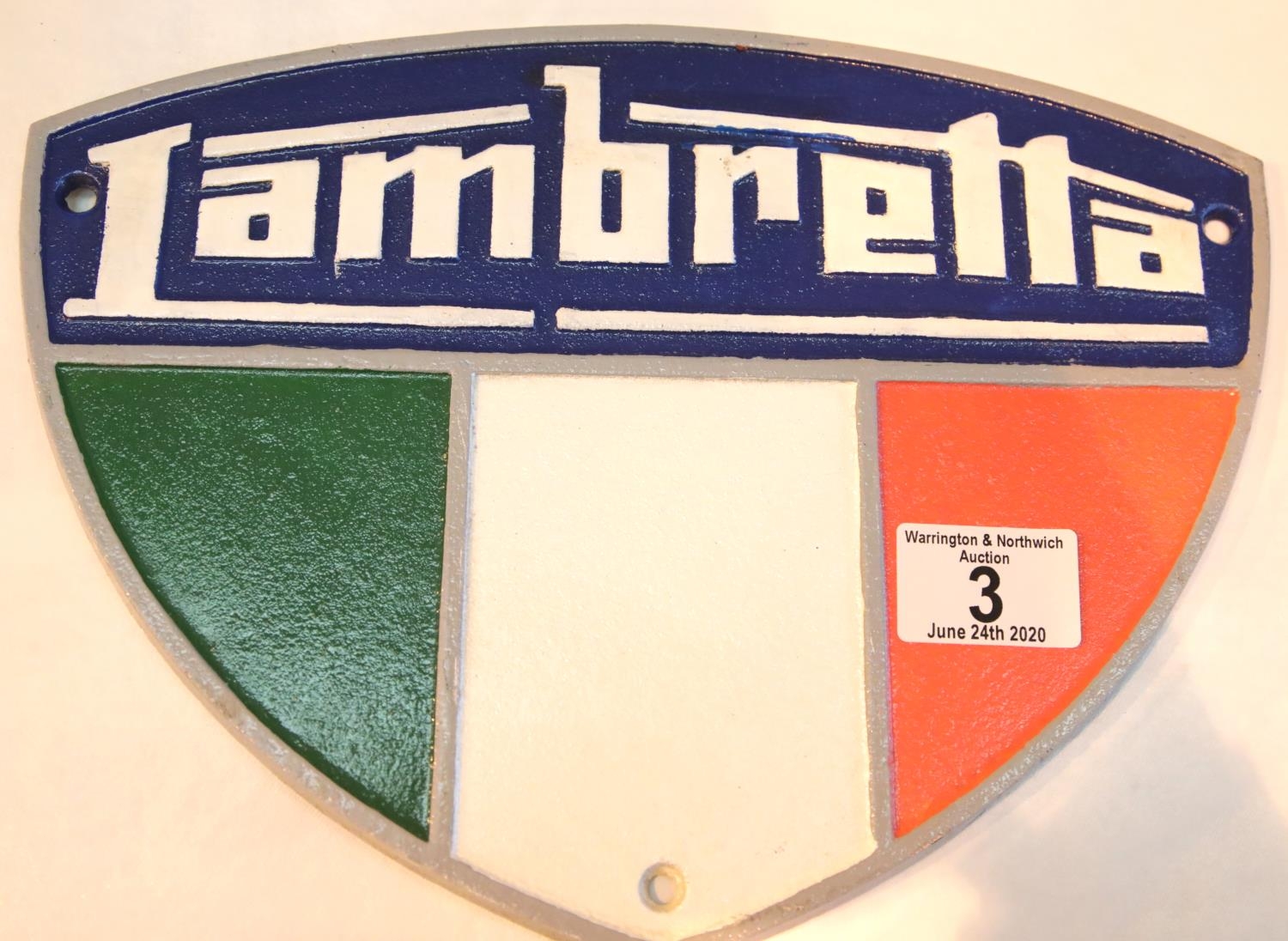 Cast iron Lambretta sign, W: 28 cm. P&P Group 2 (£18+VAT for the first lot and £2+VAT for subsequent lots)