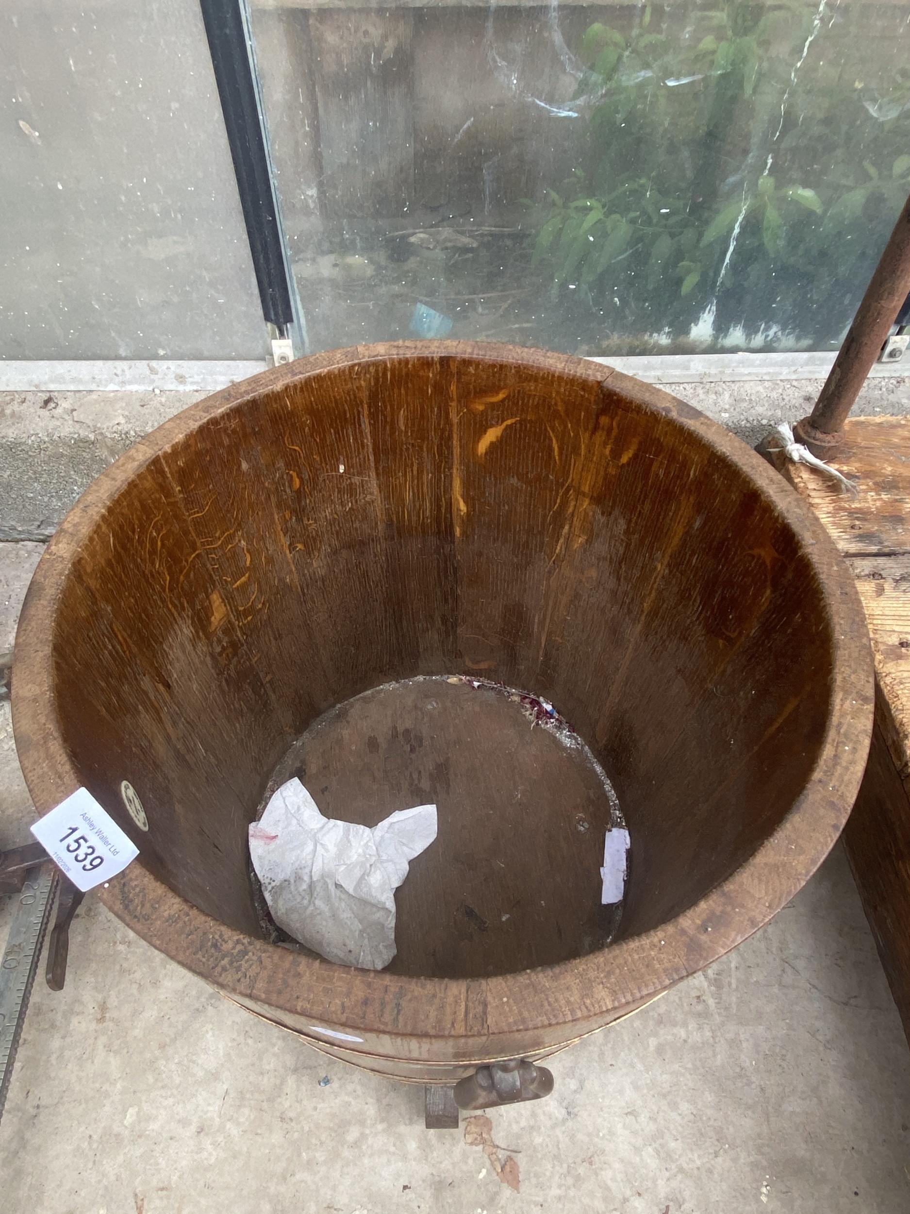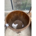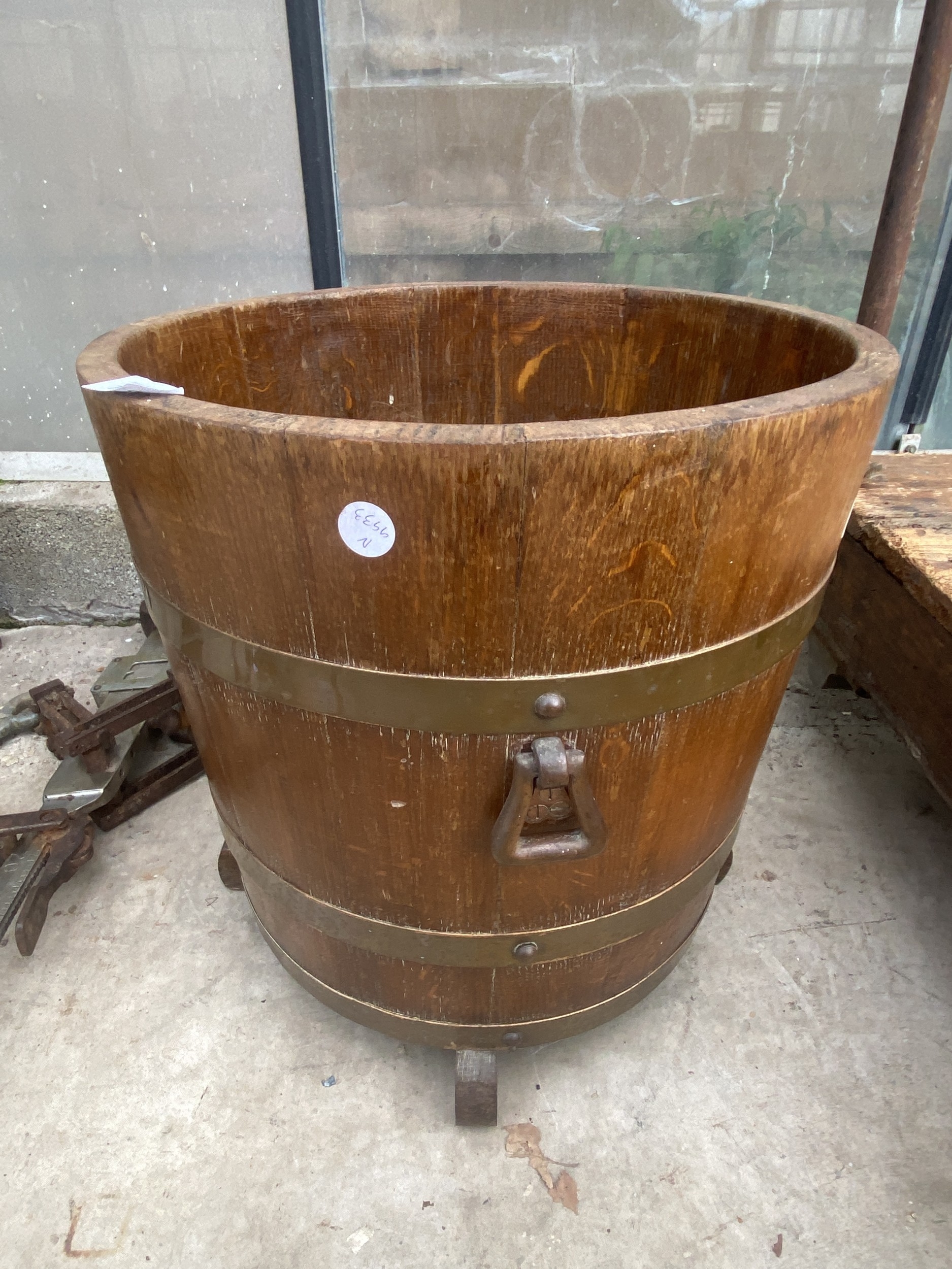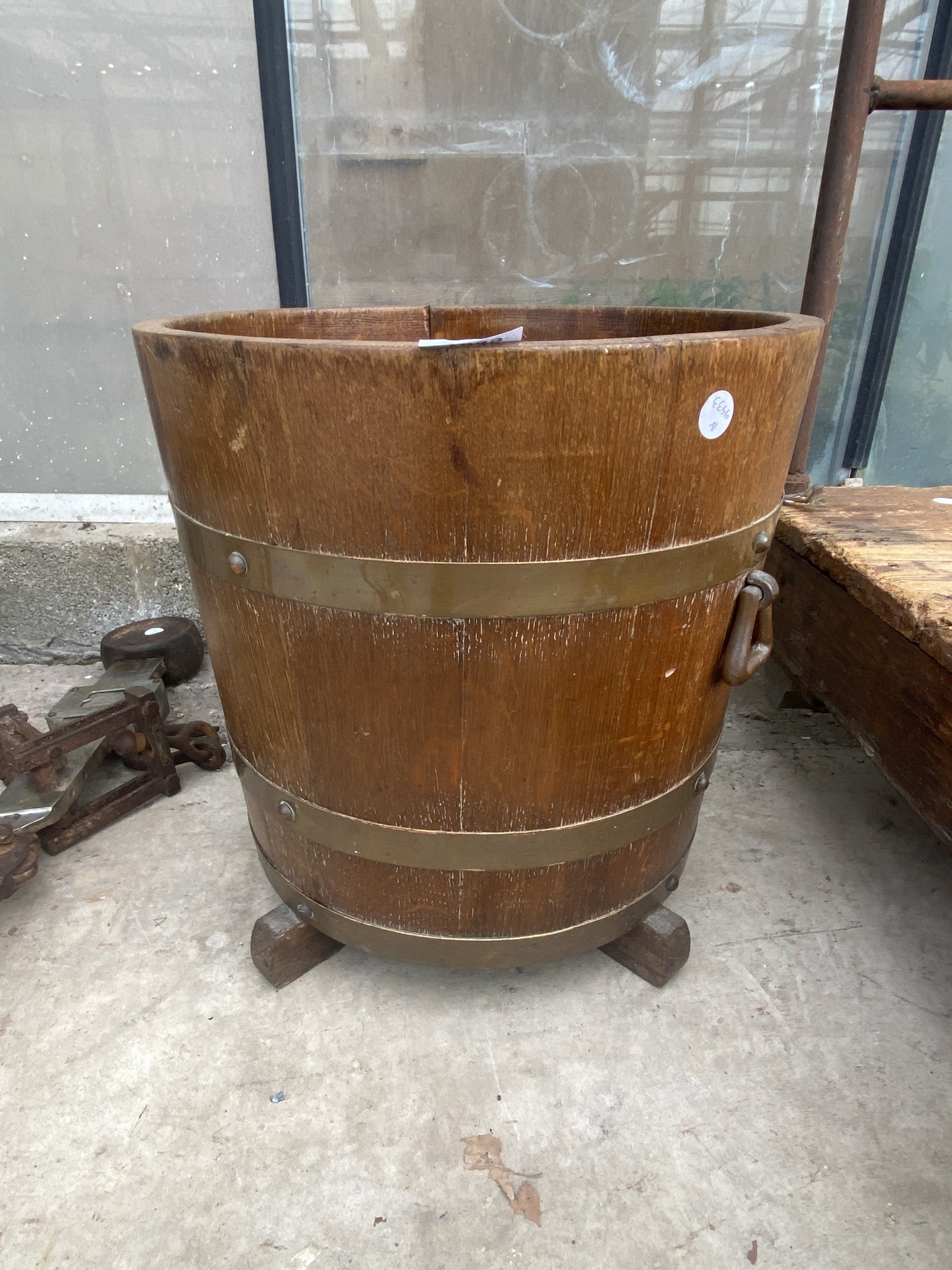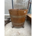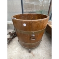 AN OAK AND BRASS BANDED LOG BUCKET