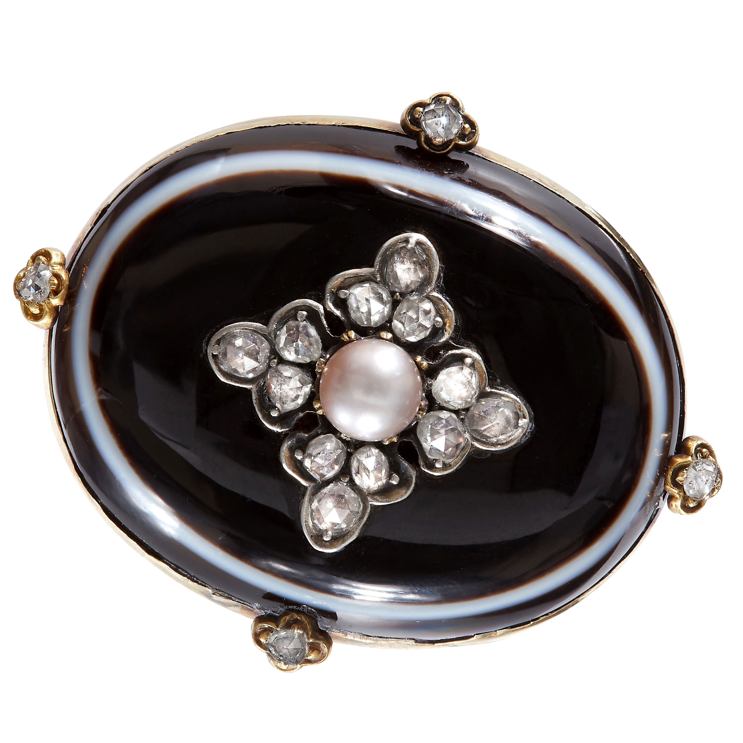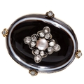 ANTIQUE AGATE DIAMOND AND PEARL BROOCH, Set to the center with a pearl on a diamond cluster background, on top of a cabochon cut agate. The surmount of the agate accentuated with 4 diamonds. W. 4.2 cm. 17.6 cm.