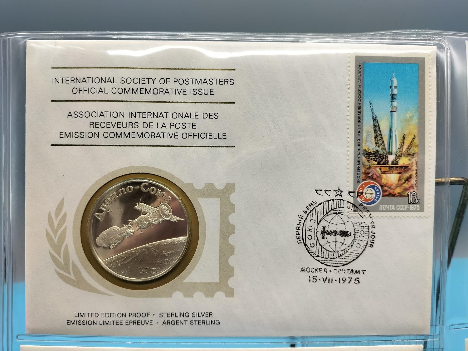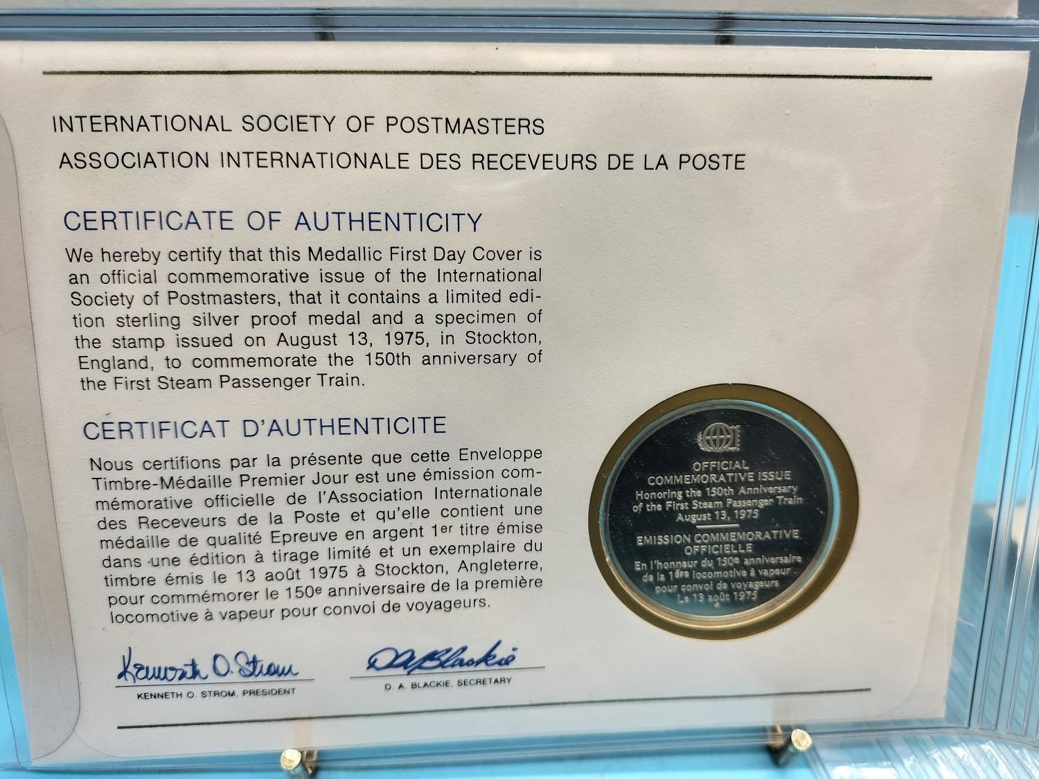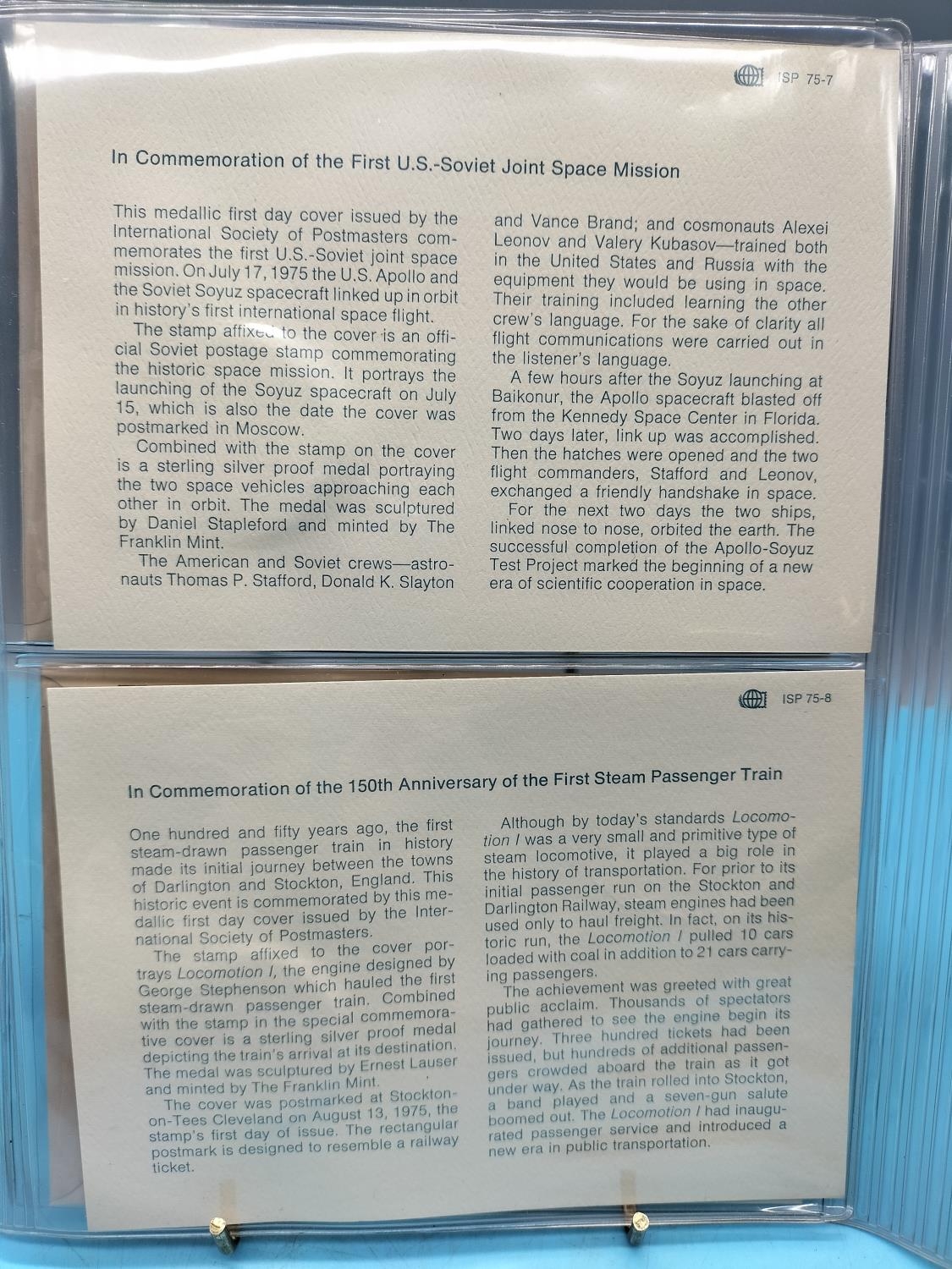 1975 International Society of Postmasters Official Commemorative Issue First Day Covers with Sterling Silver Coins (2) for 'First US - Soviet Joint Space Mission' and '150th Anniversary of the First Steam Passenger Train'.