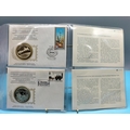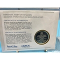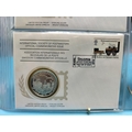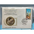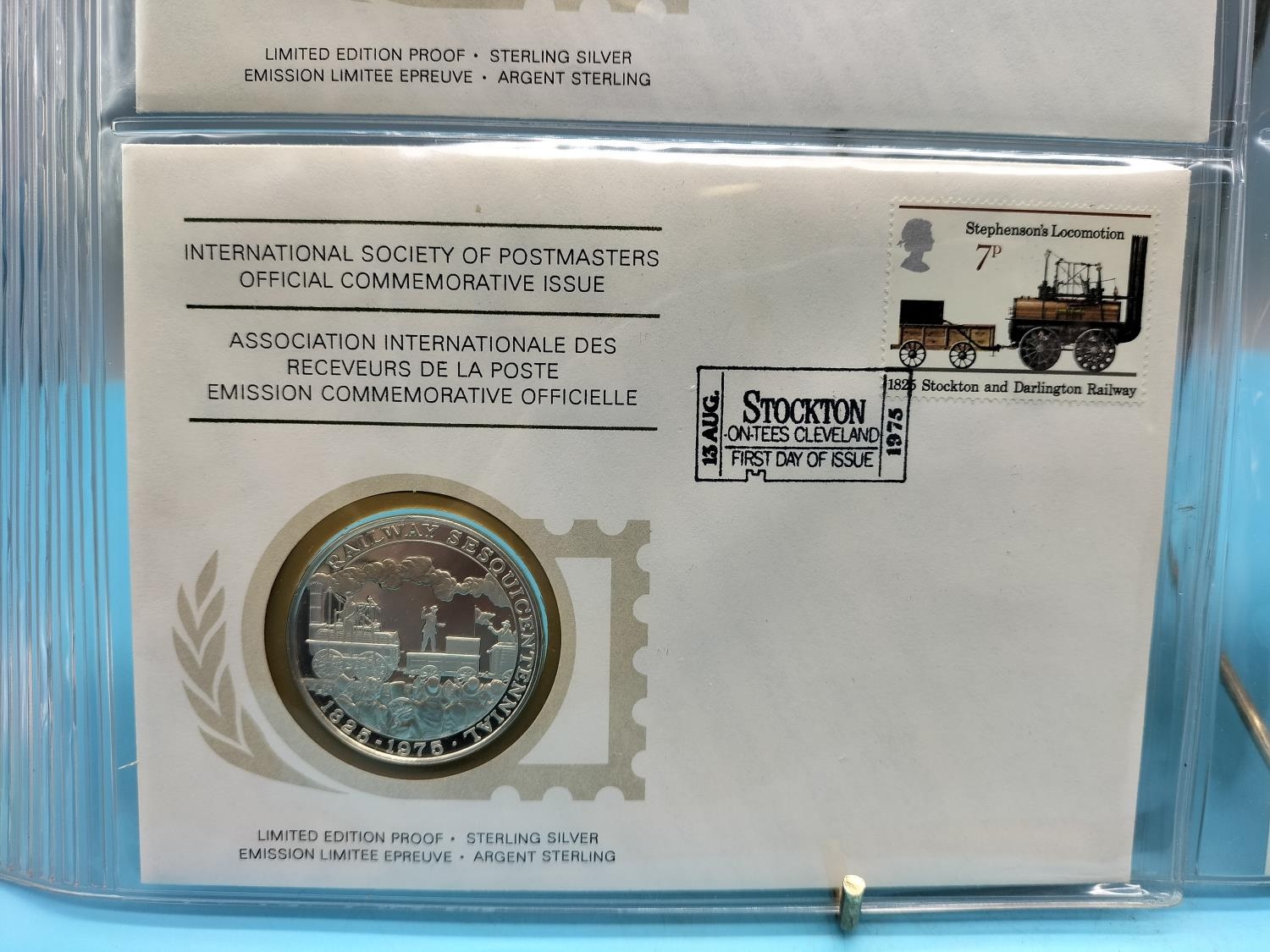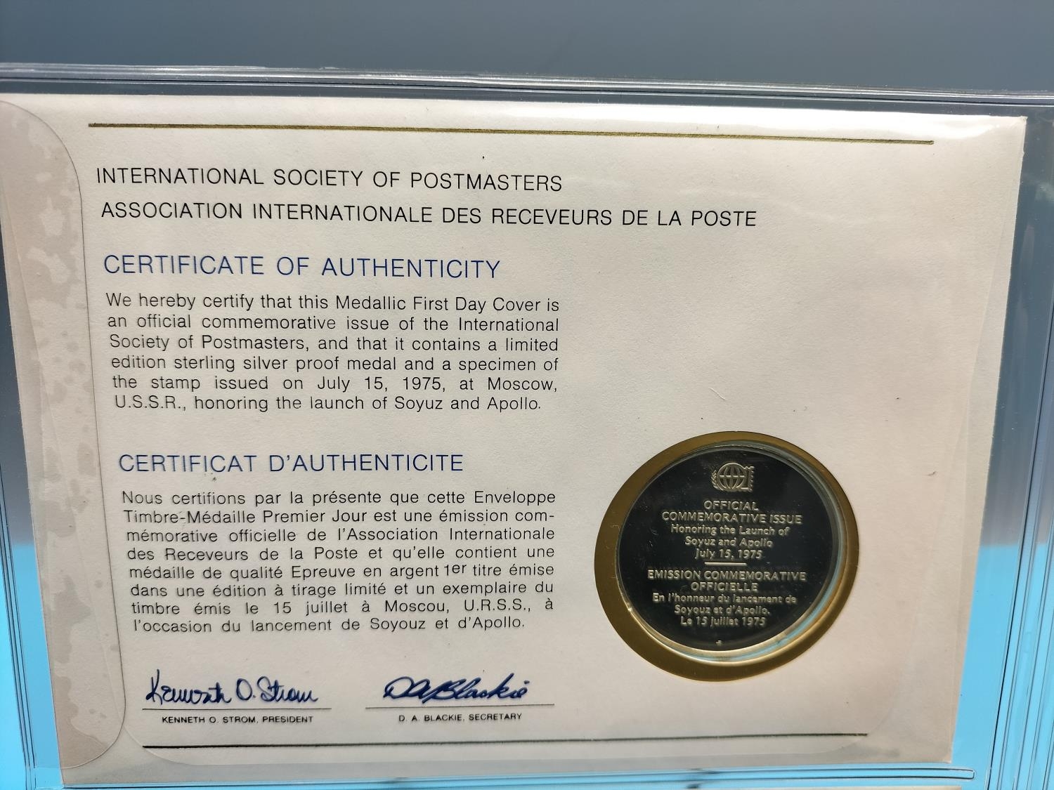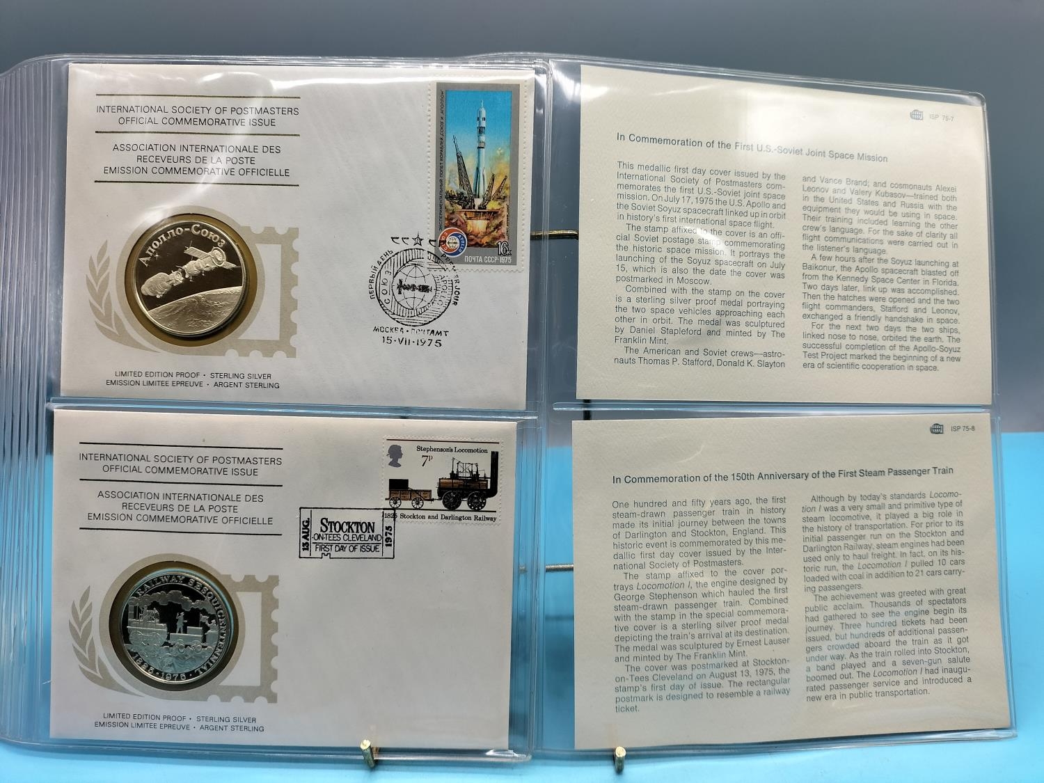 1975 International Society of Postmasters Official Commemorative Issue First Day Covers with Sterling Silver Coins (2) for 'First US - Soviet Joint Space Mission' and '150th Anniversary of the First Steam Passenger Train'.