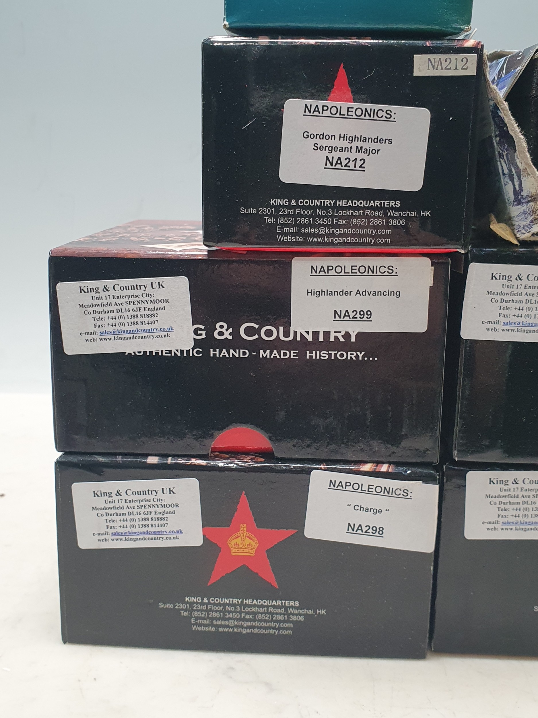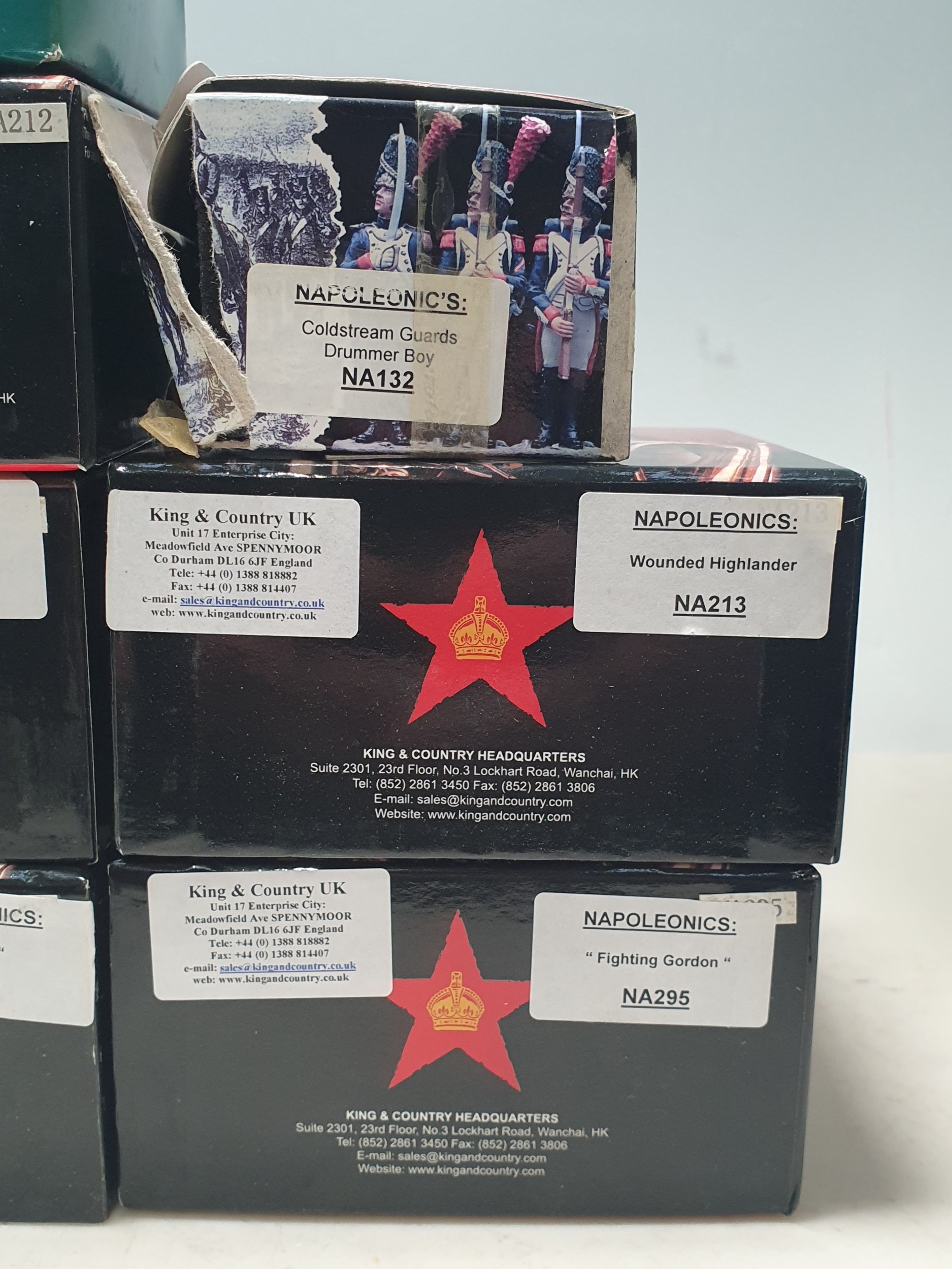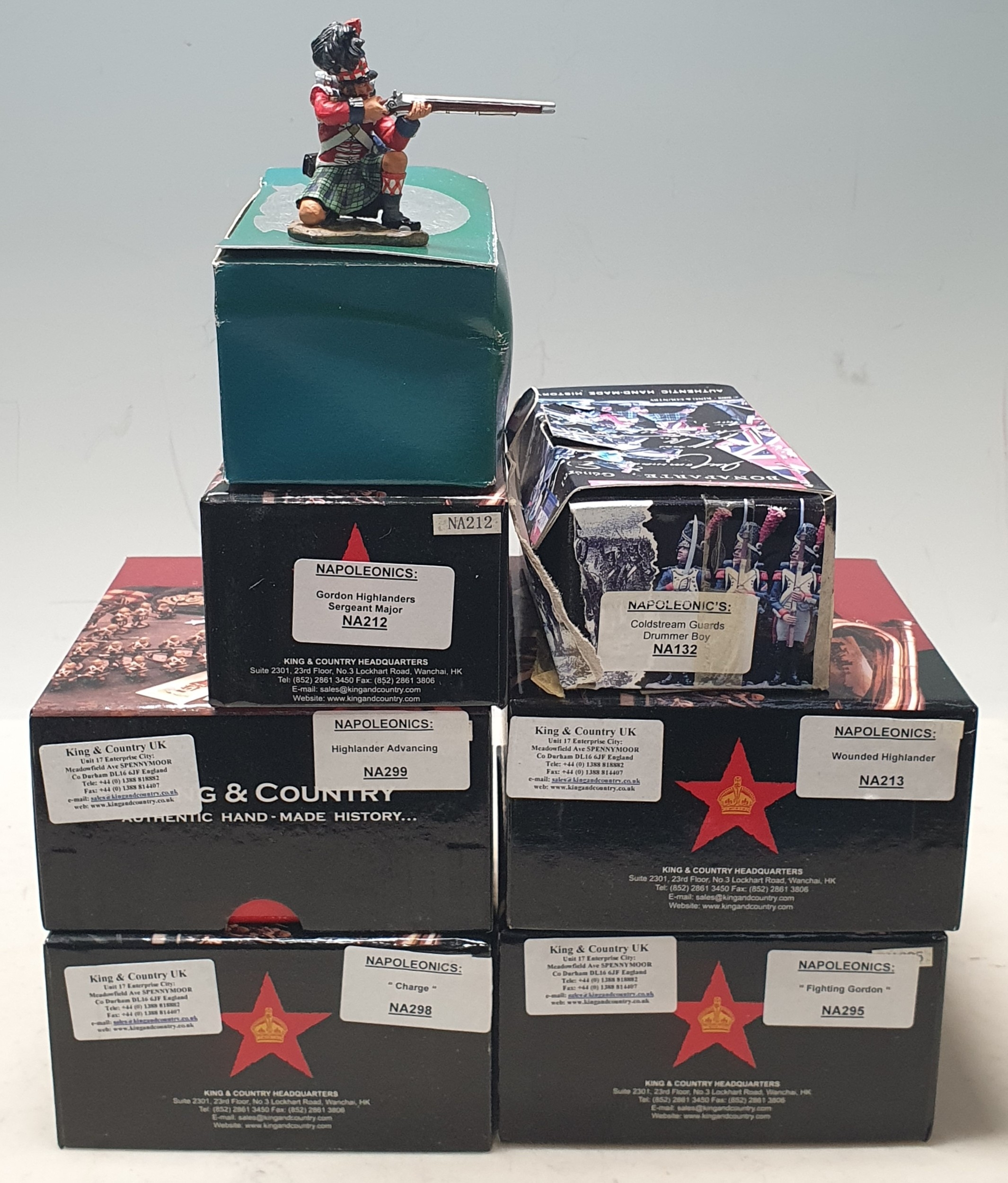 Seven boxed King & Country Napoleonics Military Figures comprising NA295 'Fighting Gordon', NA213 Wounded Highlander, NA299 Highlander Advancing, NA298 'Charge', NA132 Coldstream Guards Drummer Boy, NA212 Gordon Highlanders Sergeant Major and NA50 Black Watch Highlander Kneeling Firing, boxes condition varios from Nr M to poor