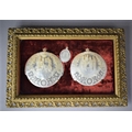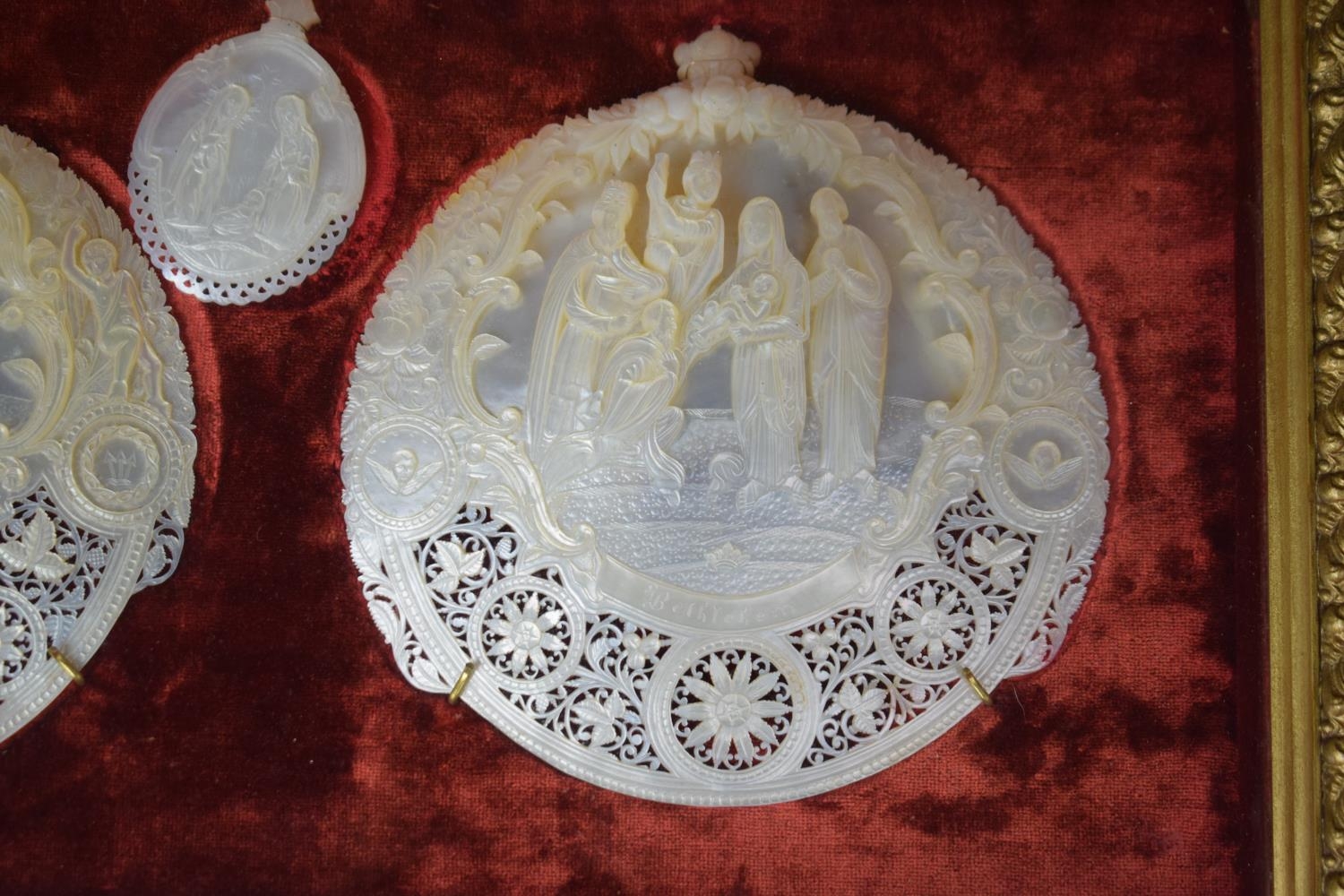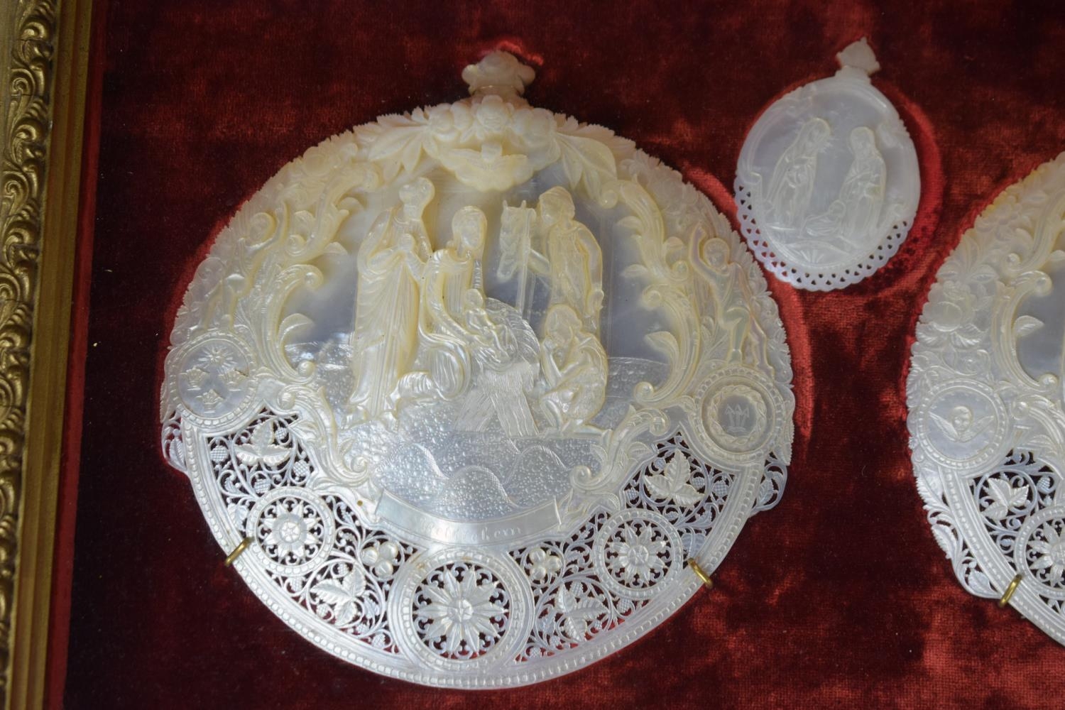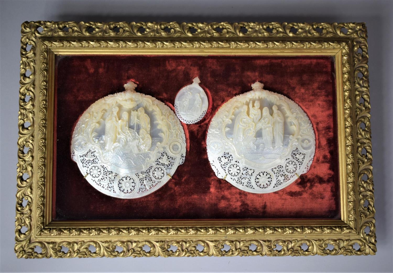 A Gilt Framed Collection of Three Mother of Pearl Carved and Pierced Shells Depicting Religious Nativity Scenes, 18cm Diameter