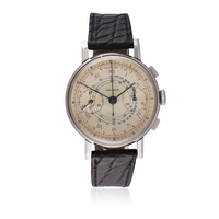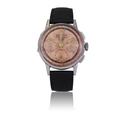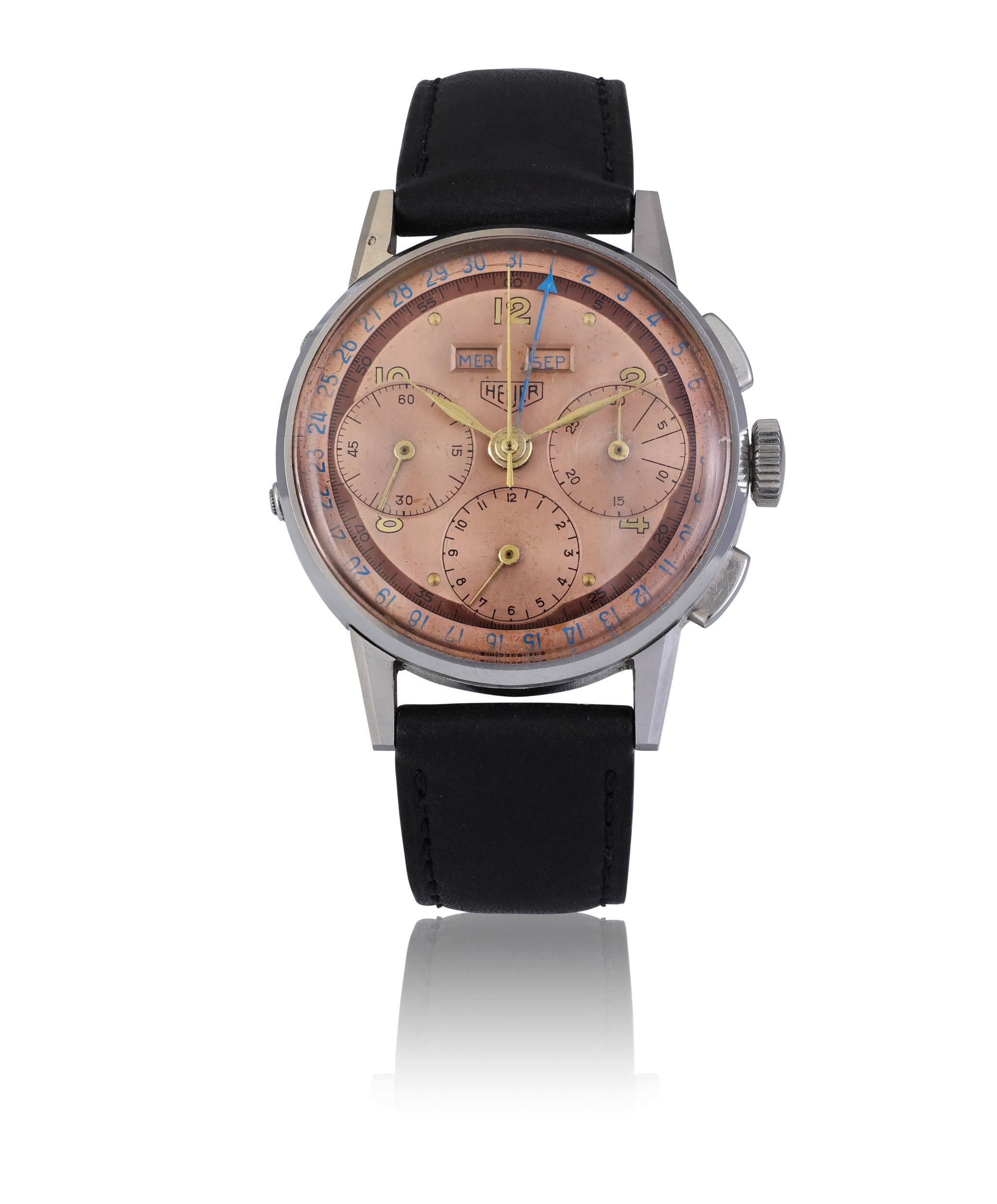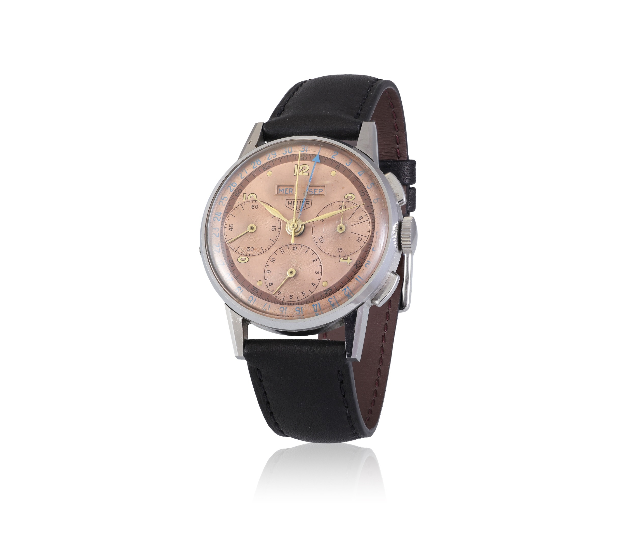 HEUER TRIPLE DATE CHRONOGRAPH, SALMON DIAL An very well-preserved, probably unpolished stainless steel chronograph triple date calendar wristwatch with salmon dial and Portuguese hallmark Year : Circa 1950 Dial : Salmon with gilt arabic numerals and point hour markers, three register Chonograph. Original feuille hands and blue painted hand pointing the date. Caliber : Heuer signed Valjoux 72 ; numbered 500724 Case : 61468 Bracelet : Leather Strap with steel pin buckle. Dimensions : Ø 35 mm. Signature : Dial, case and movement