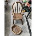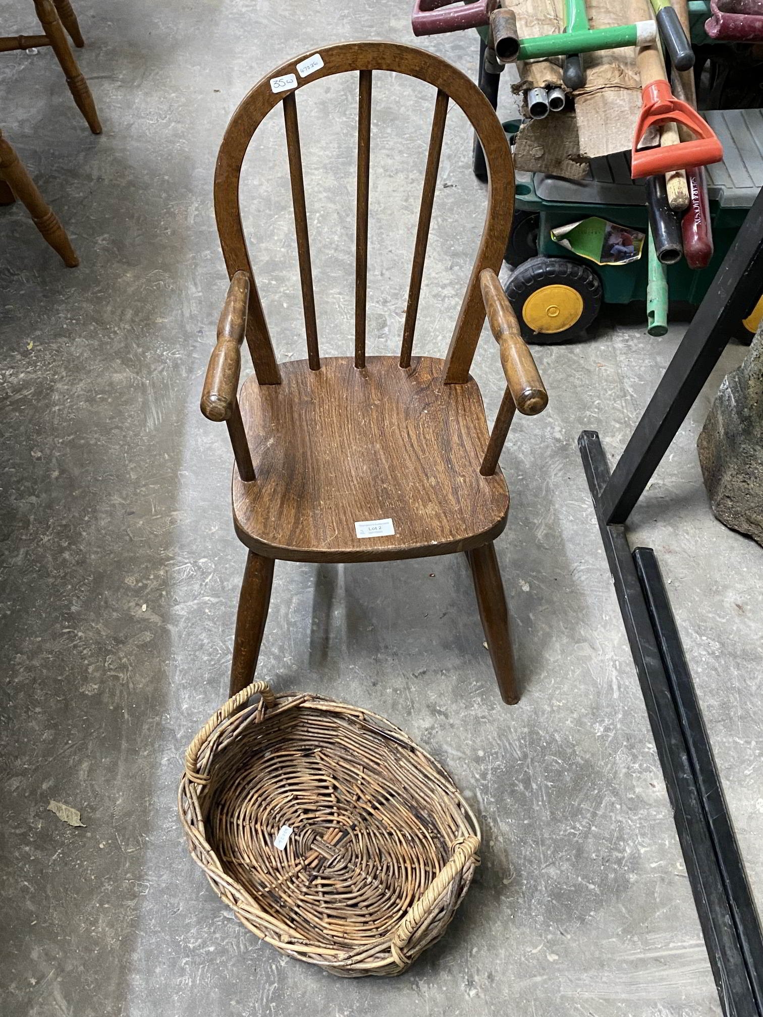 Child's oak Windsor chair 35W and a wicker basket