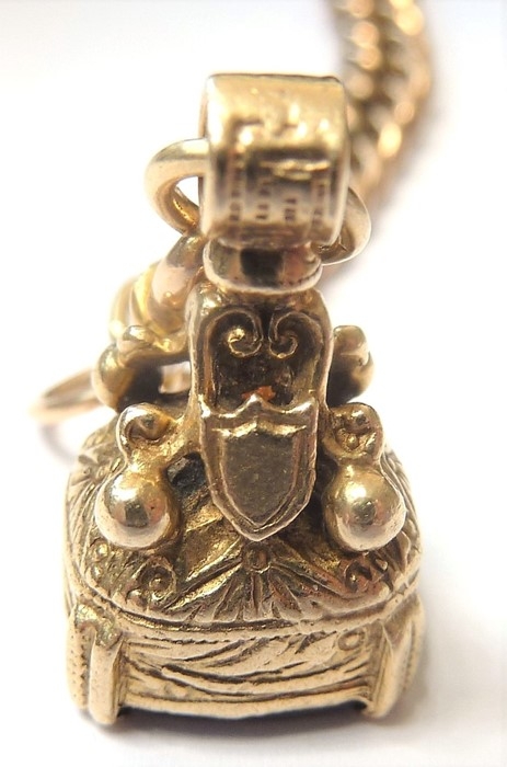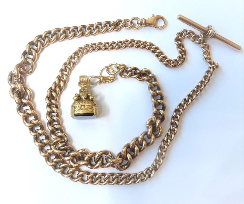 The chain is unusual in that roughly in the middle of the chain it has the T-bar and the links seem to graduate away bigger (please see image). There have been some small minor repairs towards the end of the chain where it links up to the fob; the fob is also hallmarked 9 carat. As is to be expected there is some wear to the links although the main chain appears strong, there is some minor scratching and some old repairs (please see close-up images). The total weight is approx. 25.9g; length 53cm)