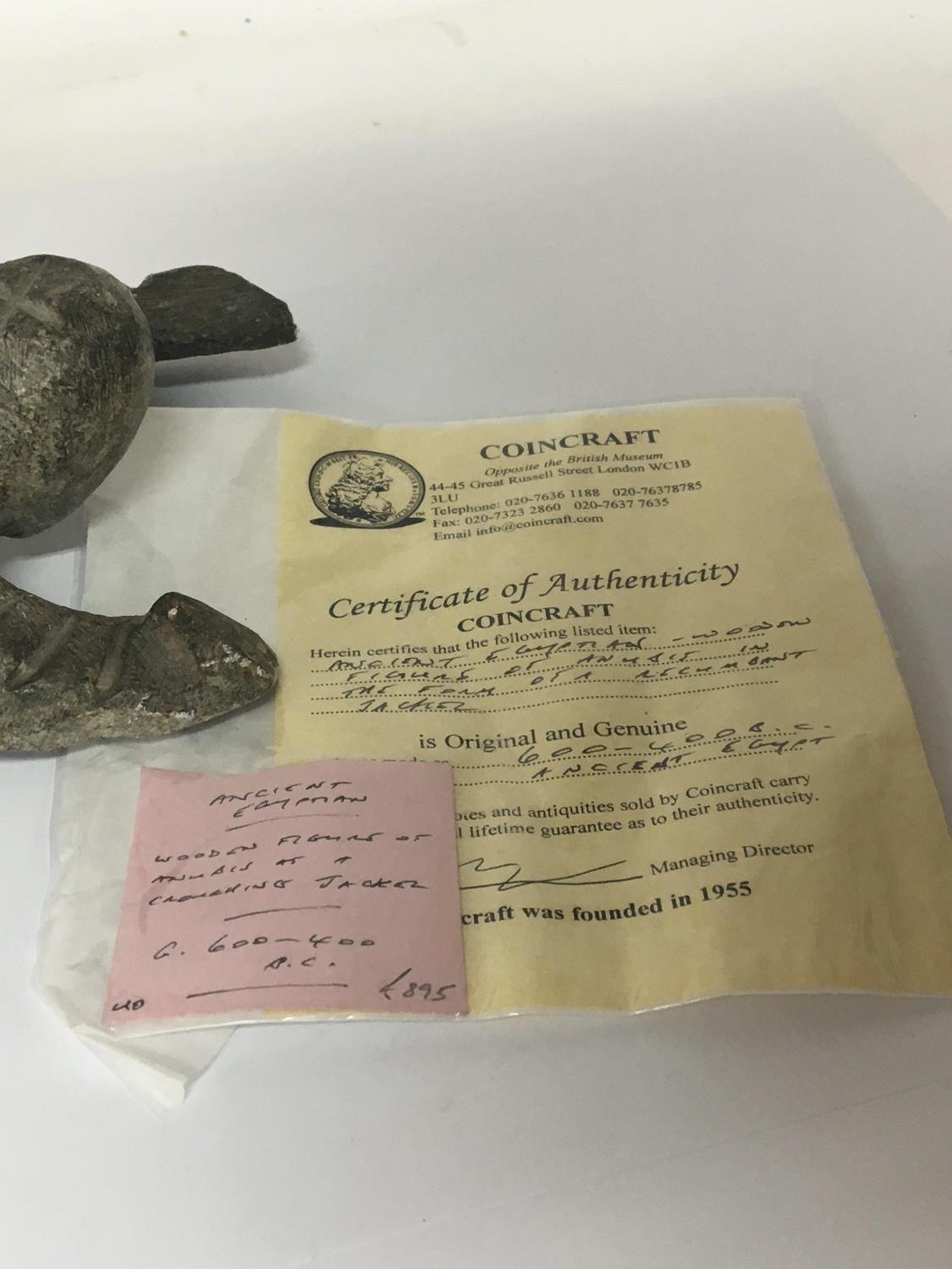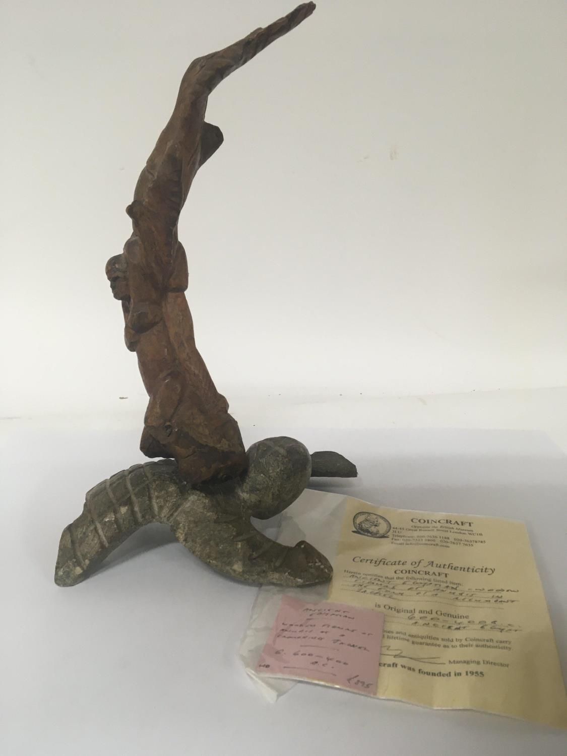 An interesting Ancient Egyptian wooden carving on a carved stone base 600-400 BC with certificate of Authenticity from Coincraft Great Russell Street London cost £895. Height 29cm