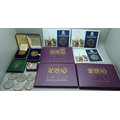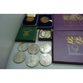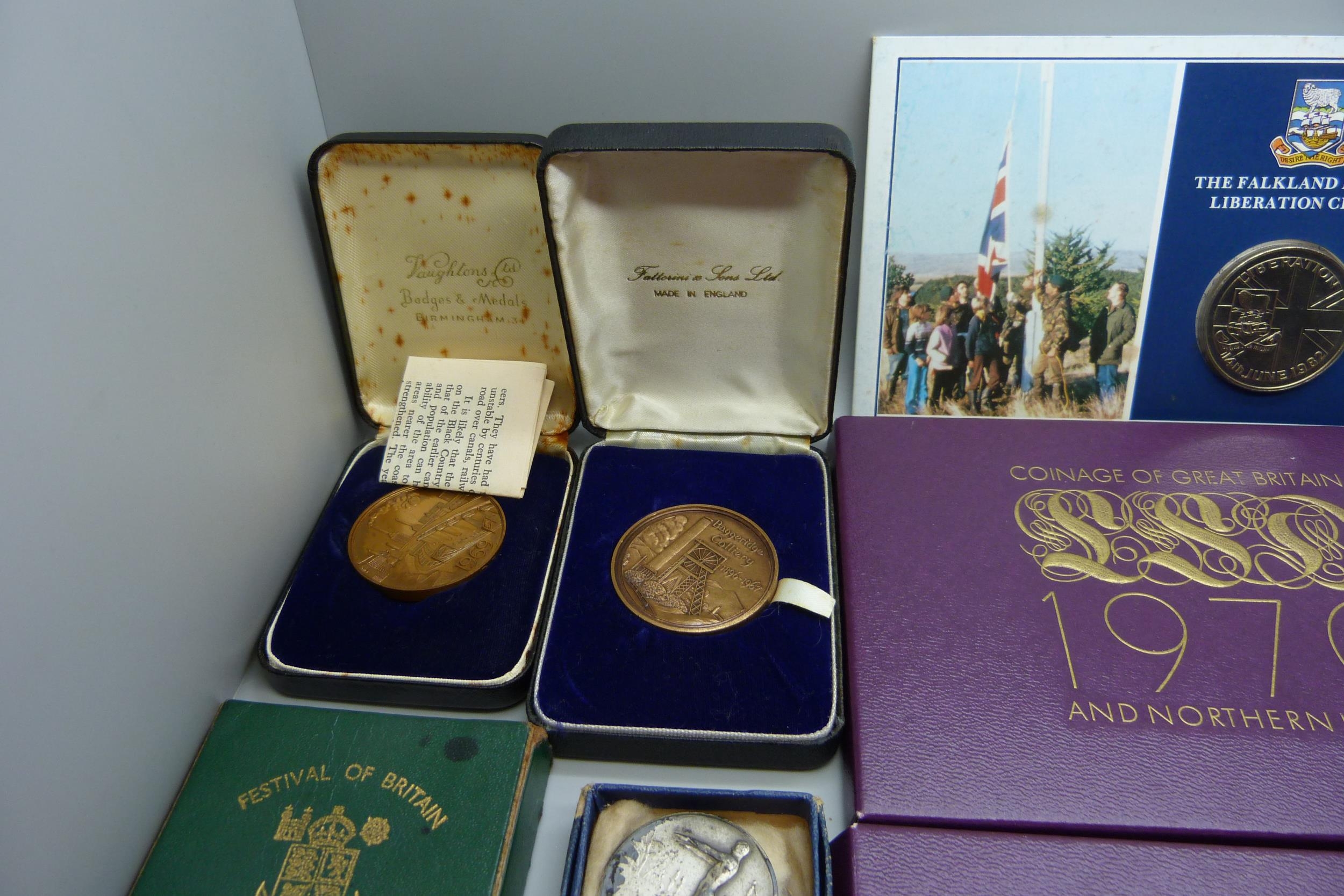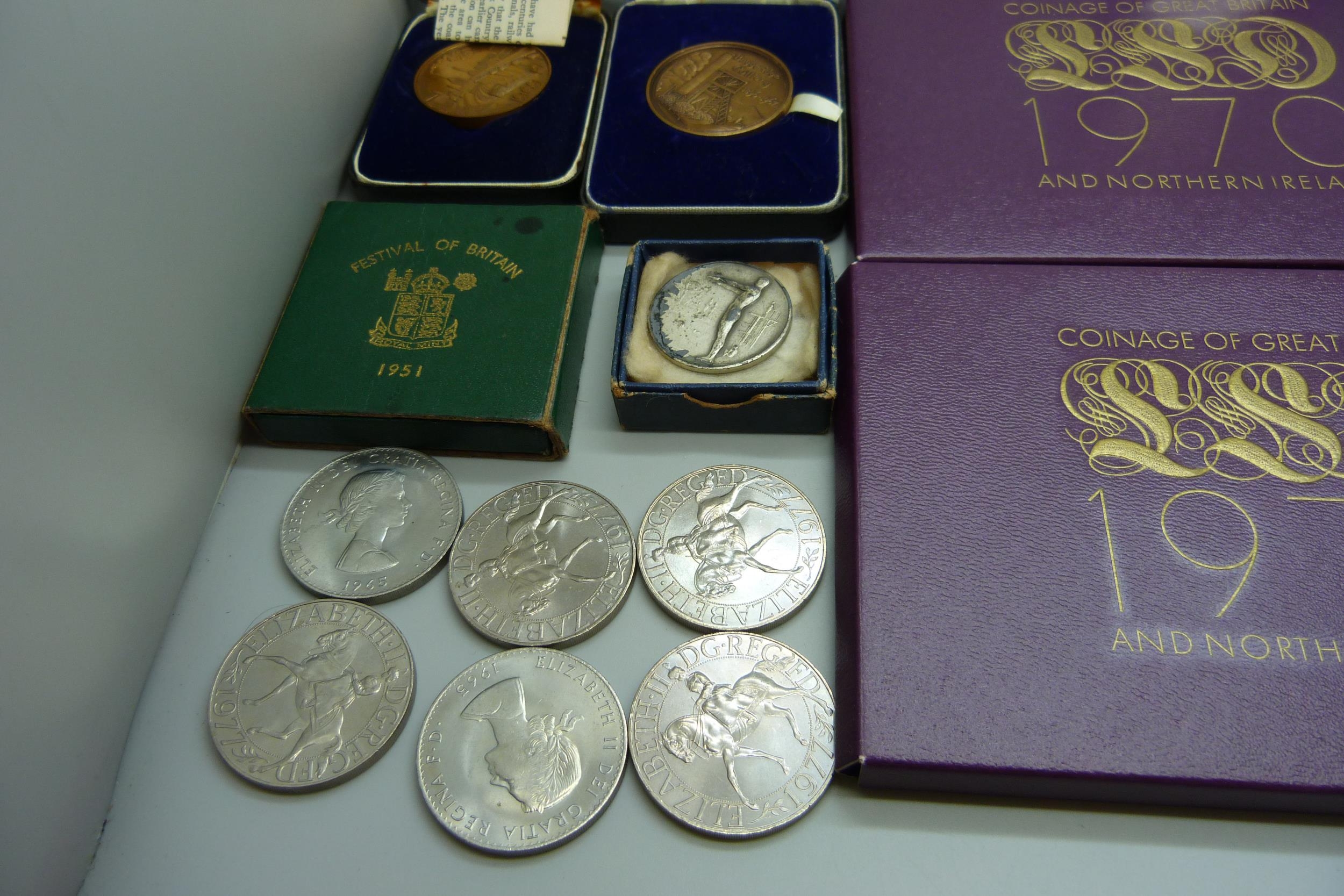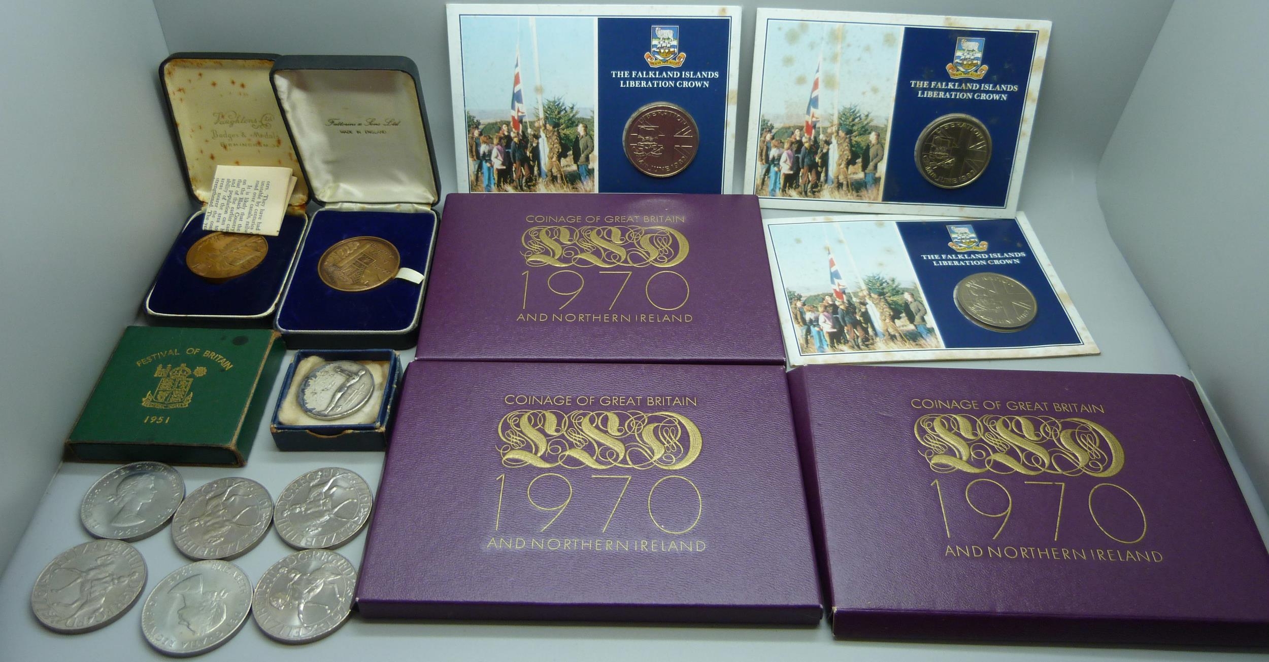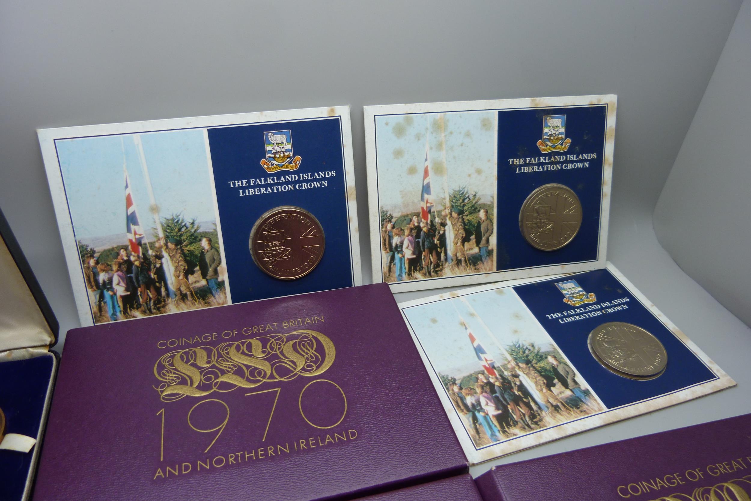 Three 1970 coin sets, three Falkland Island crowns, other crowns, etc.