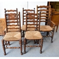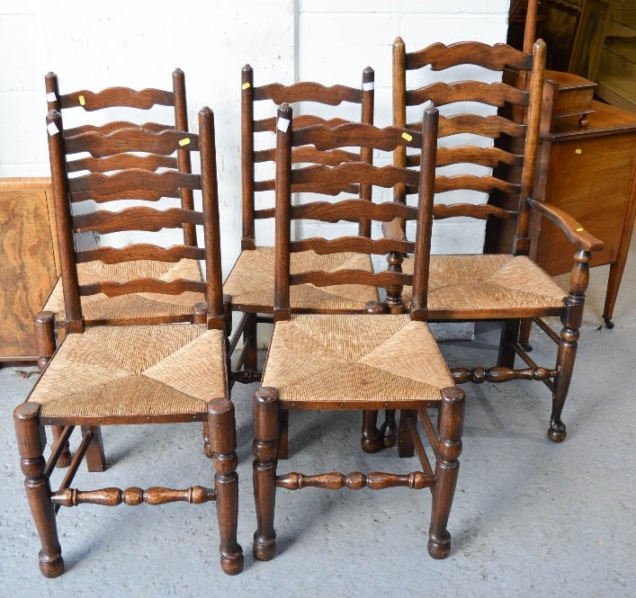 Four 19th century ladder back chairs and one carver, with rush seats.