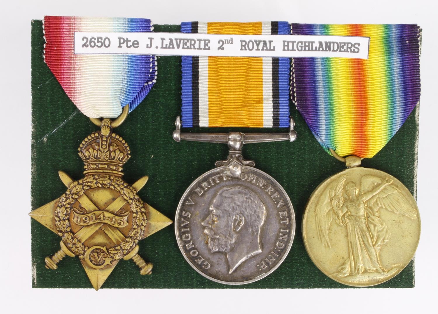 1915 Star Trio to 2650 Pte J Laverie R.Highlanders. Served with 2nd Bn. Entitled to the Silver War Badge for Wounds 19/5/1915. (3)