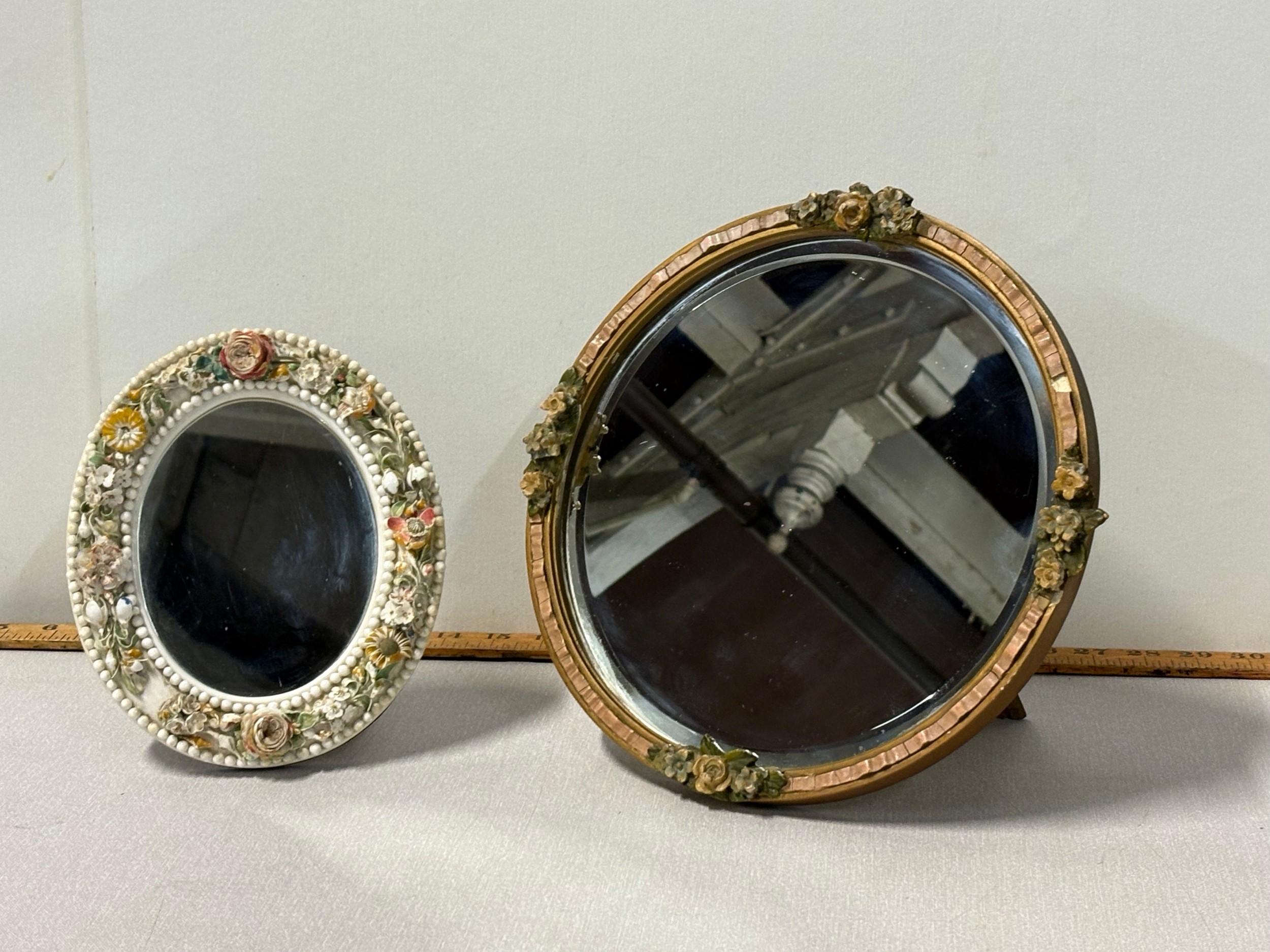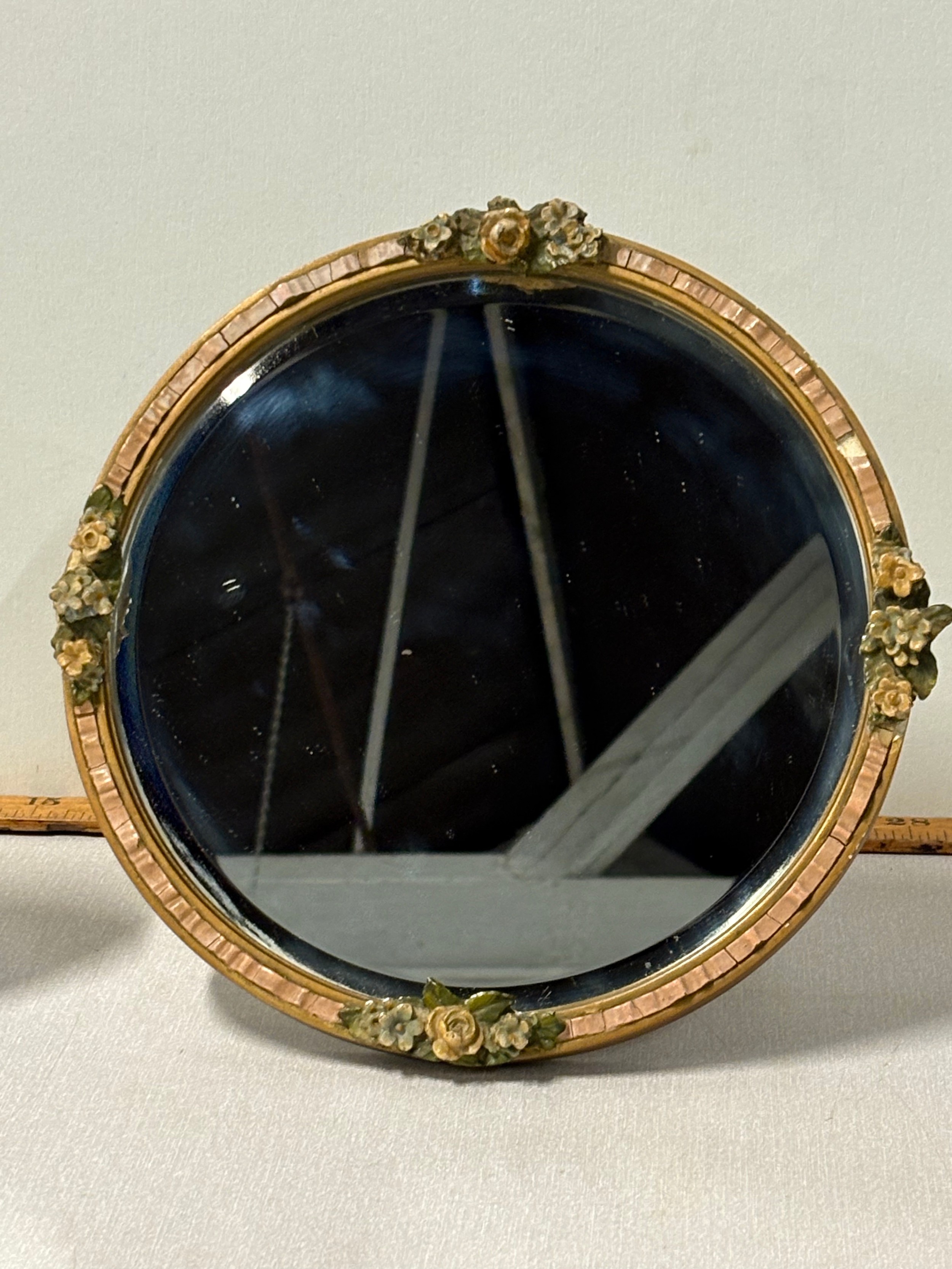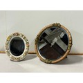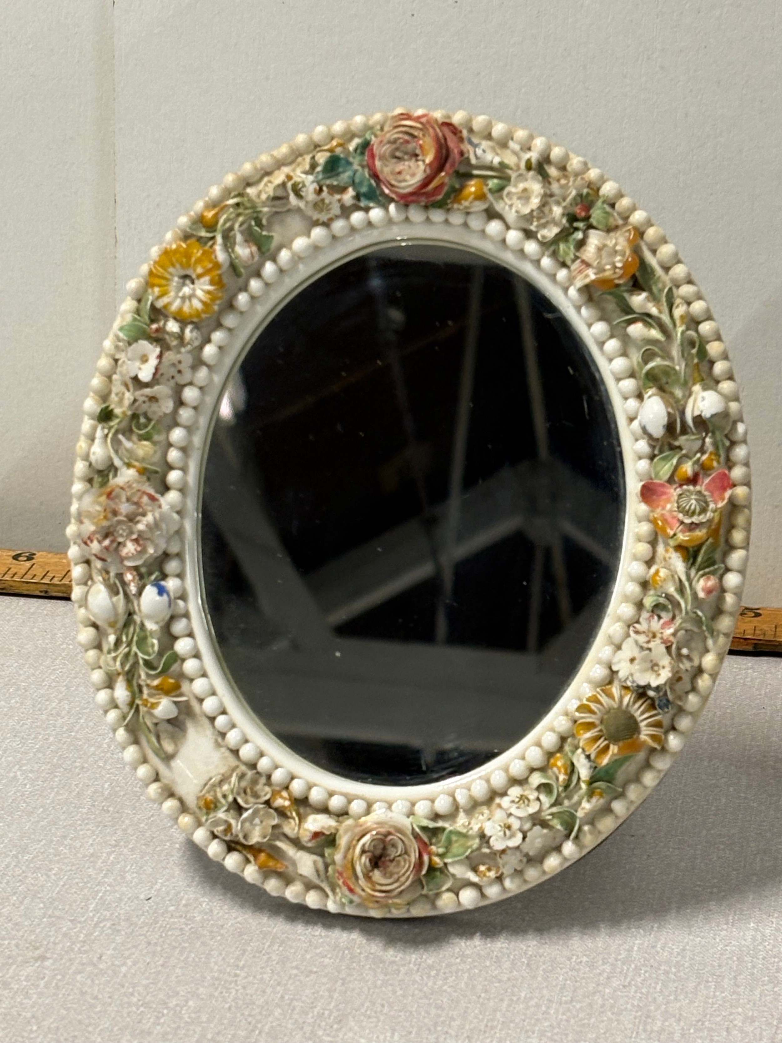 in the white, applied with a continuous band of flowers between beaded rims, underglaze blue mark -- 8" x 7" approx, along with round barbola mirror
