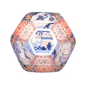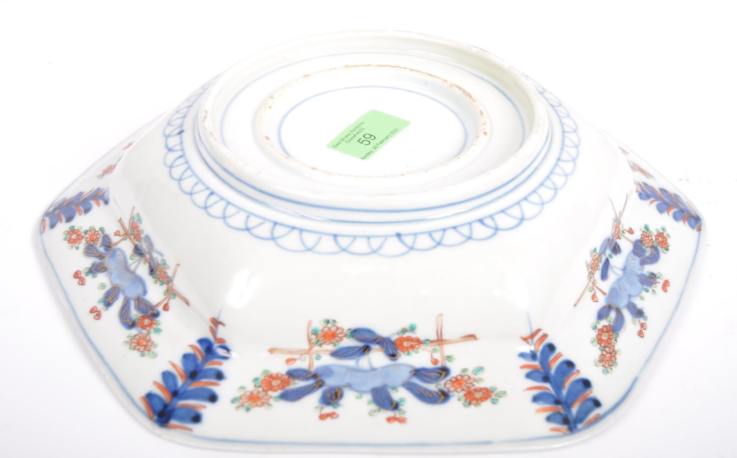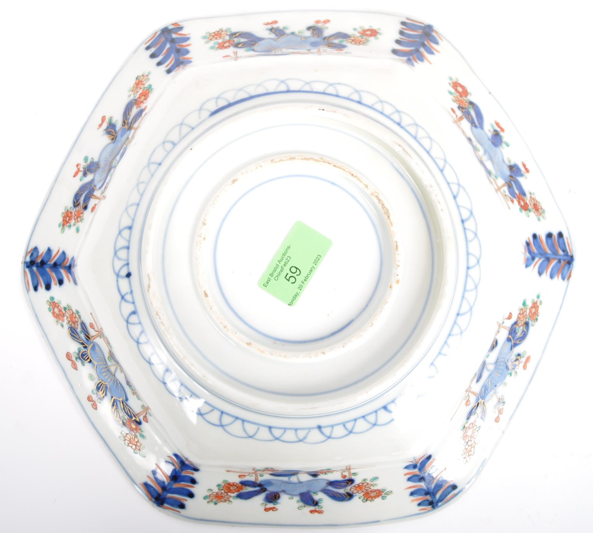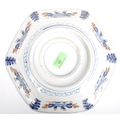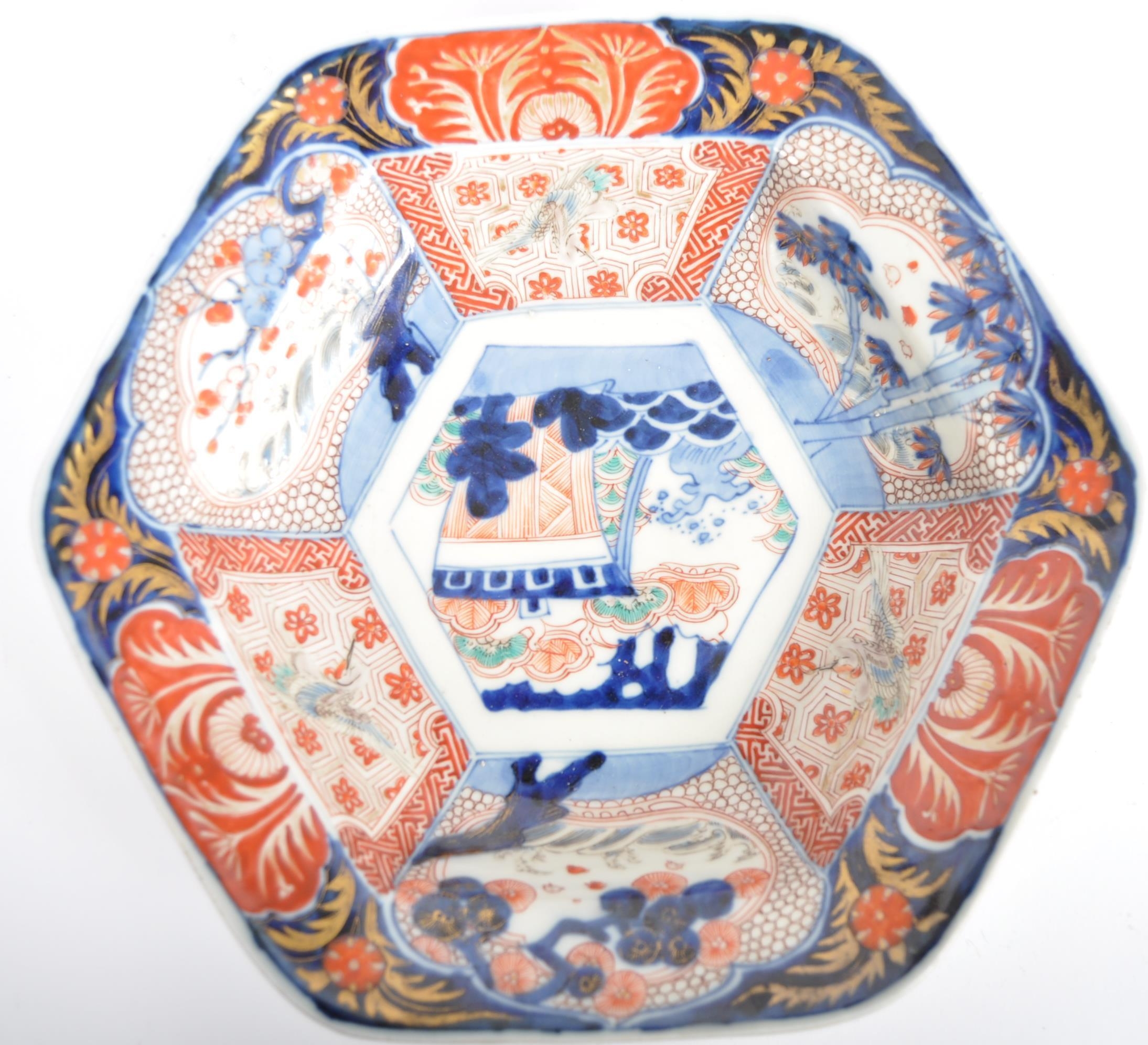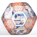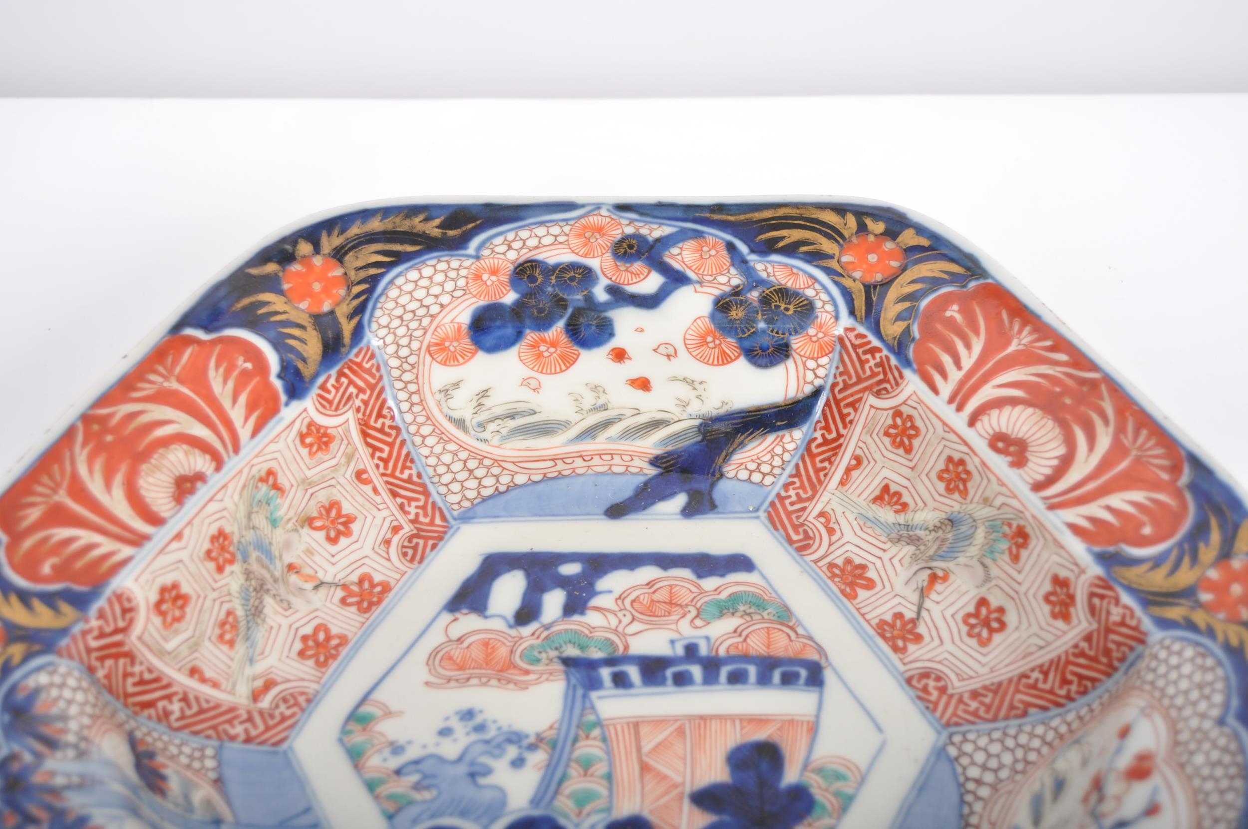 A Japanese 19th century Meiji Period large Imari hexagonal centrepiece bowl. The bowl depicting traditional landscape scenes with floral motifs and birds. Diameter 29cm.