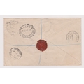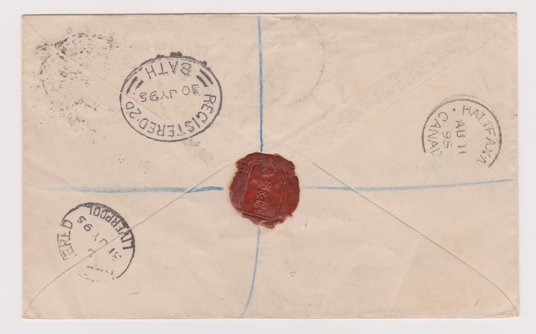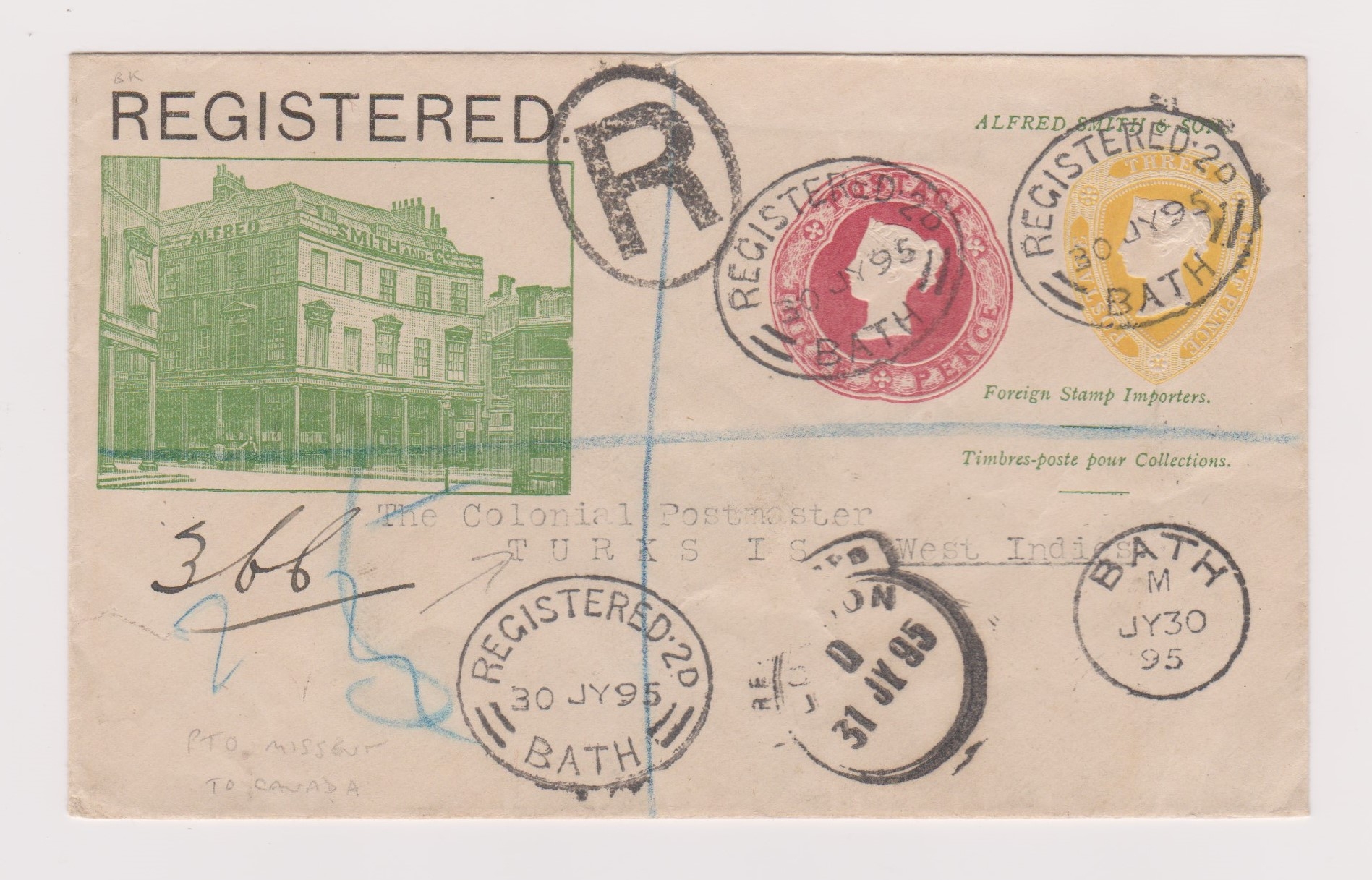 Great Britain 1895-Illustrated stamp dealers registered envelope posted to West Indies cancelled registered 2d Bath 30.7.1895 on yellow 3.1/2d and red 3d postage cancelled in transit Bath, London, Liverpool and Halifax Canada