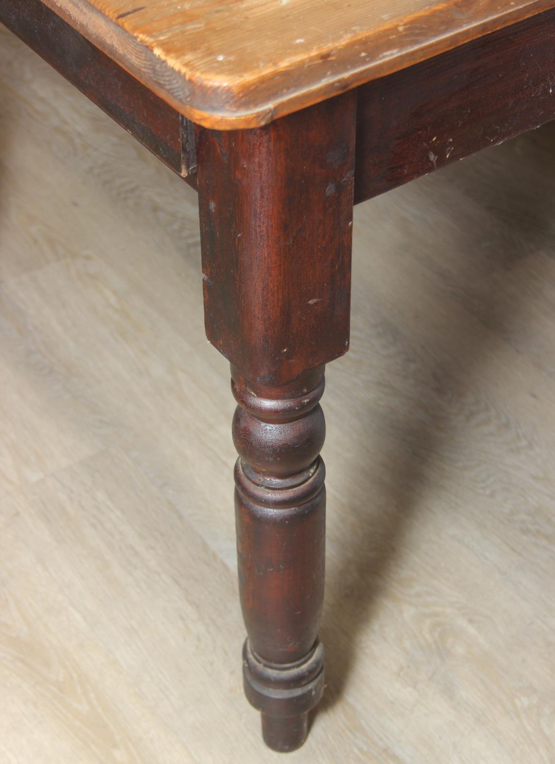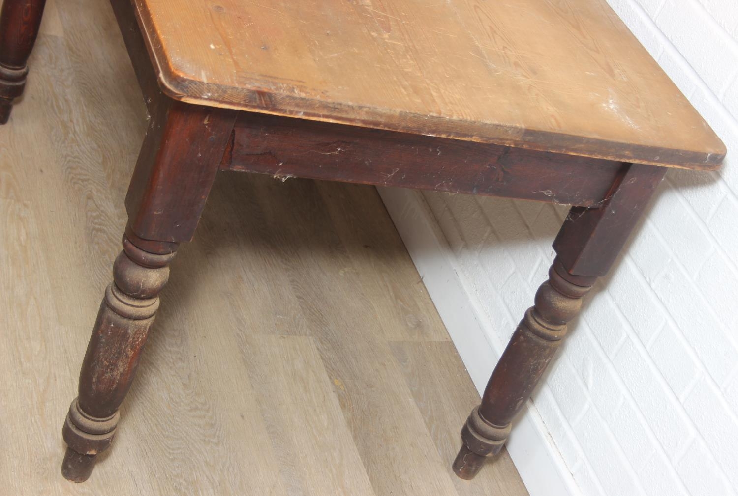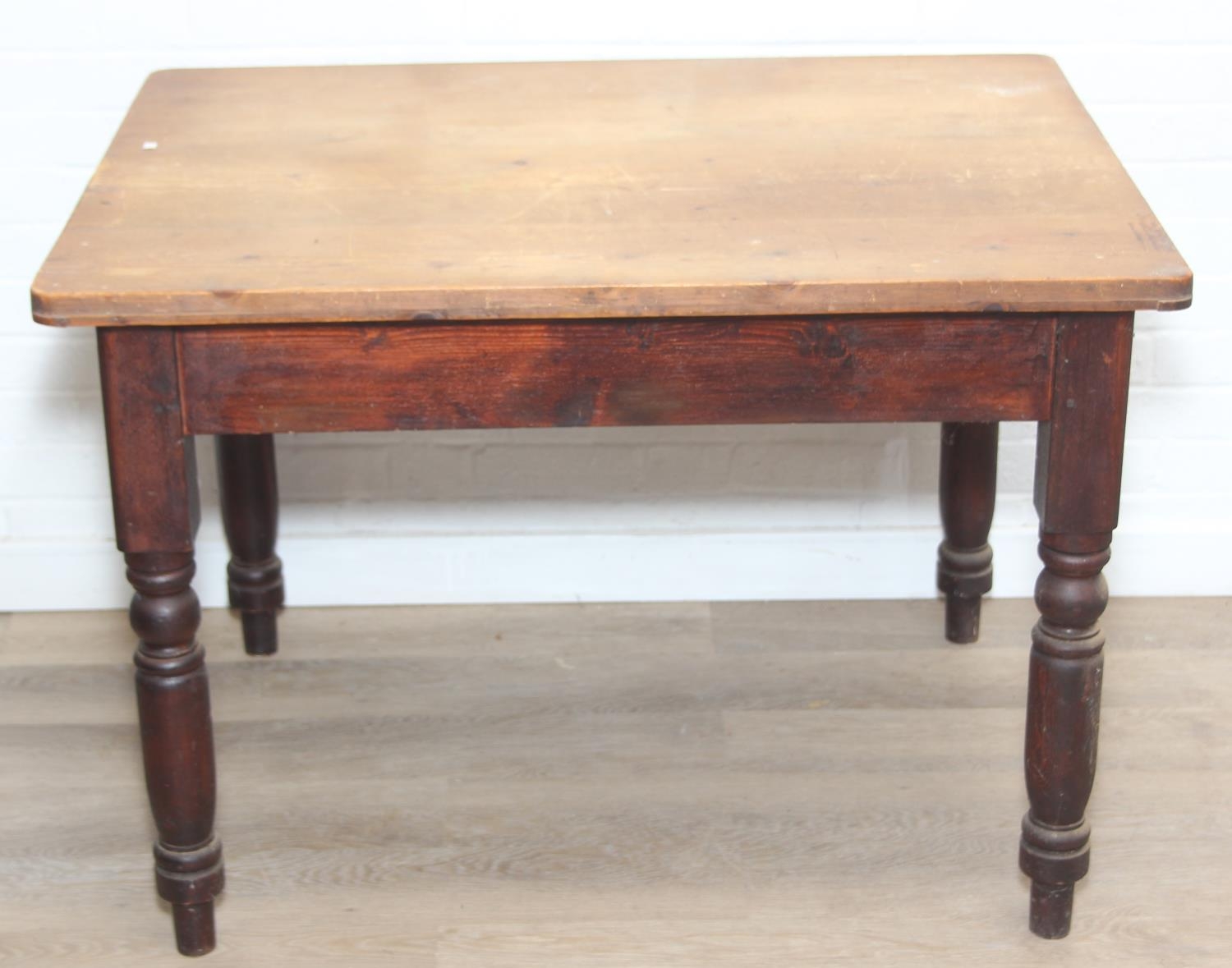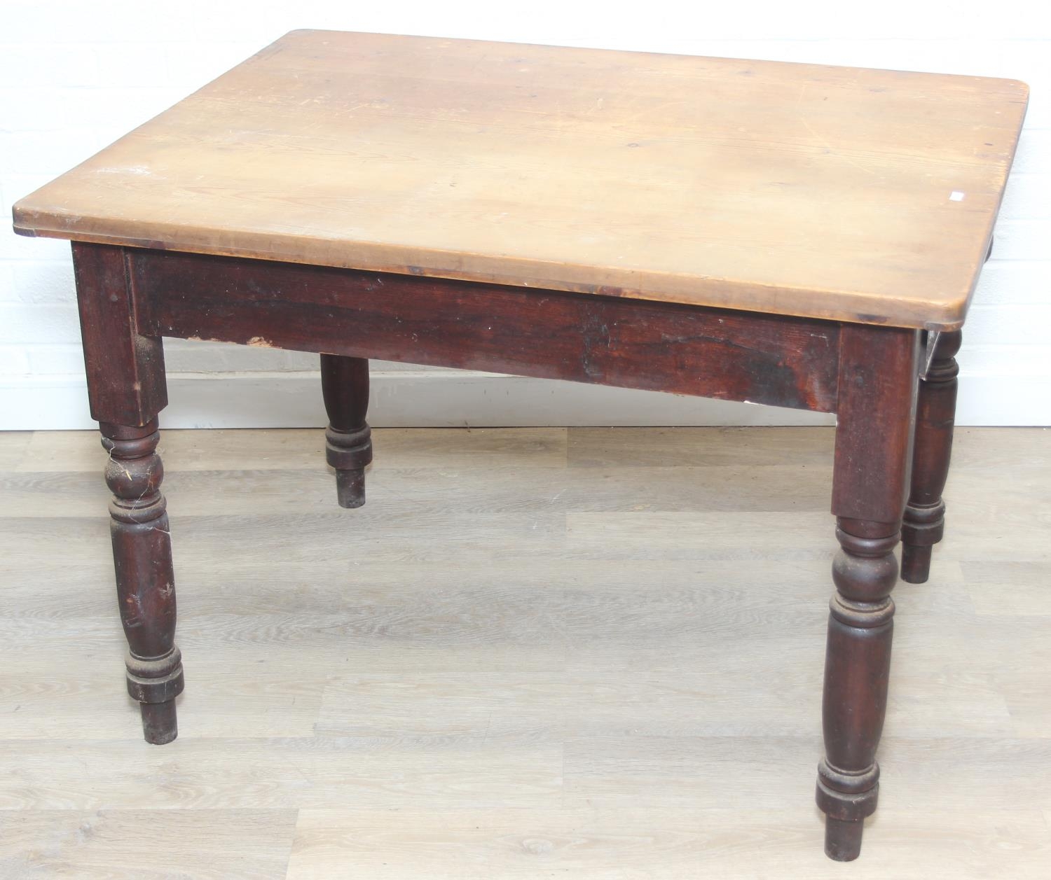 A Victorian scrub topped pine table with turned legs and drawer, 107cm x 81cm x 74cm