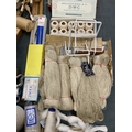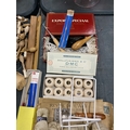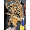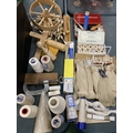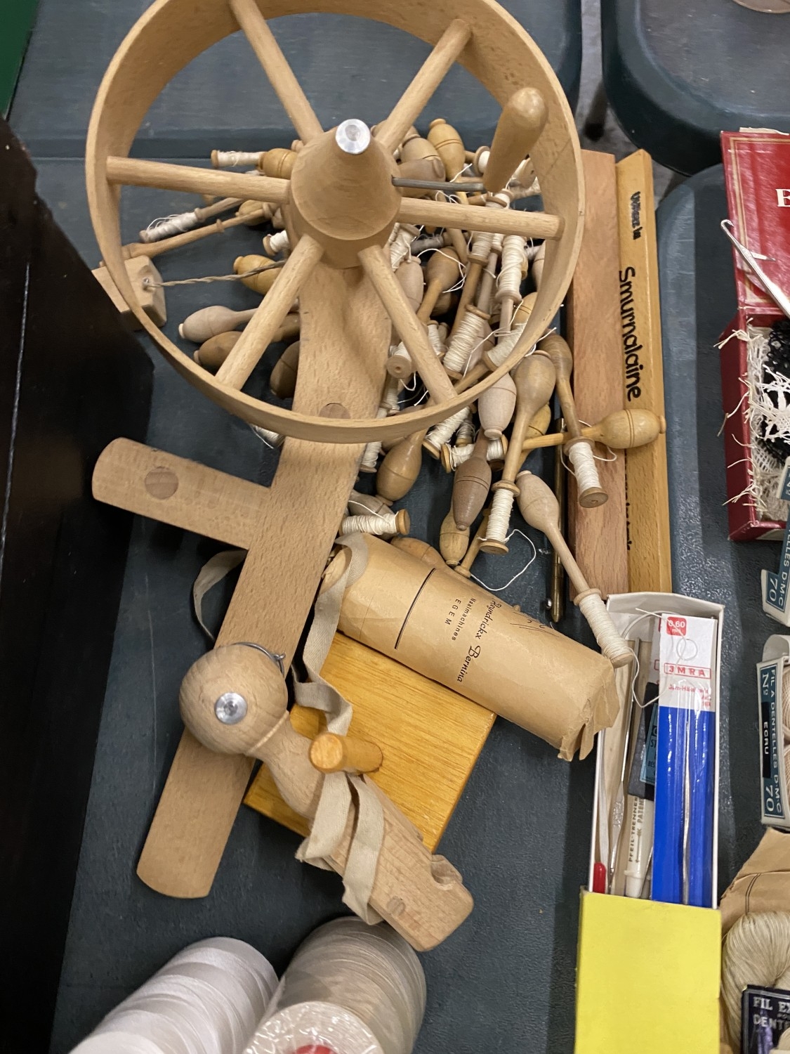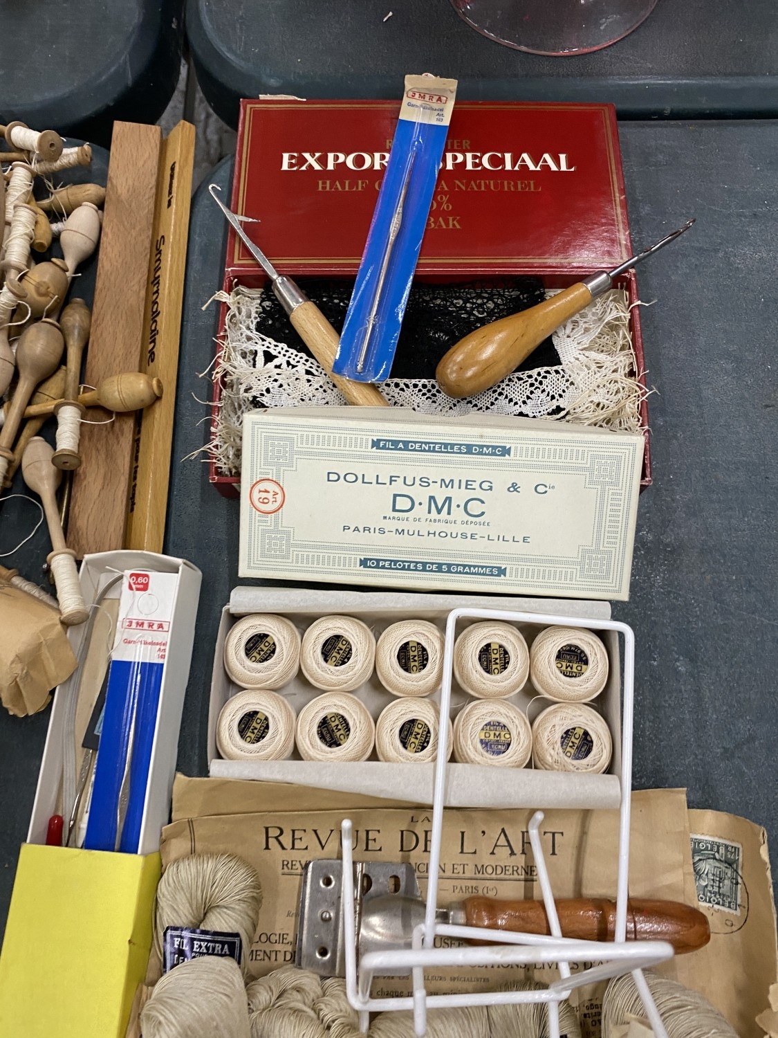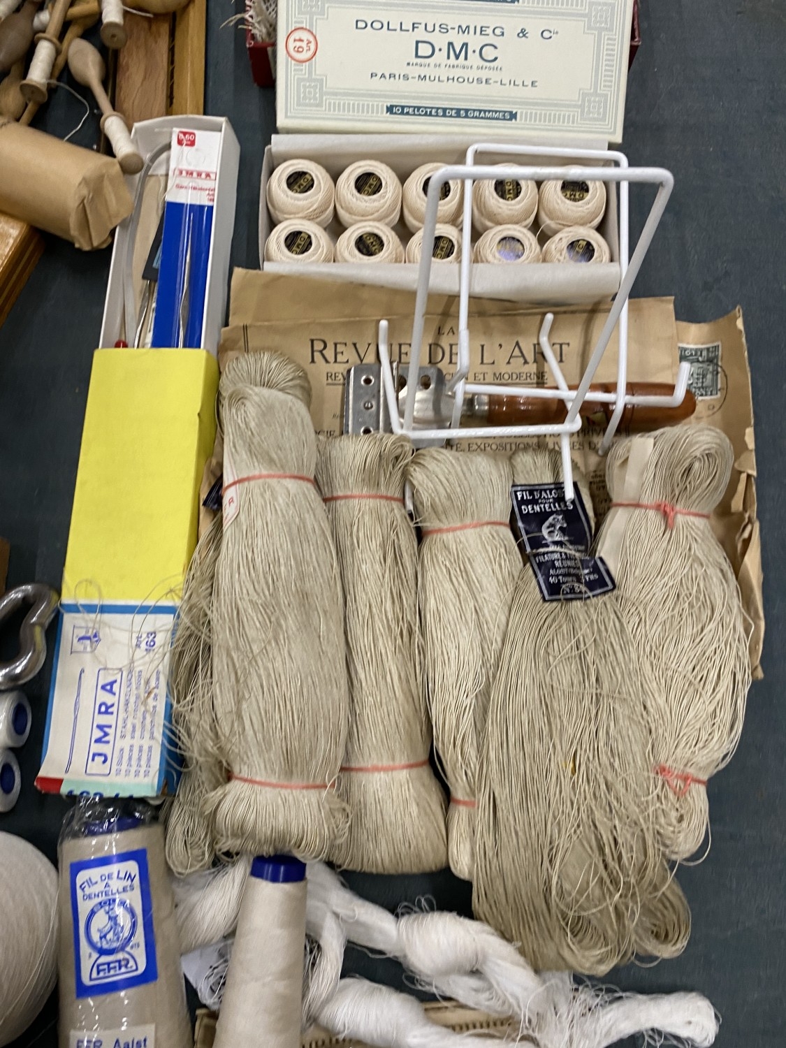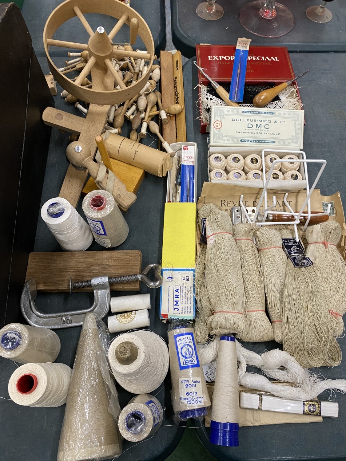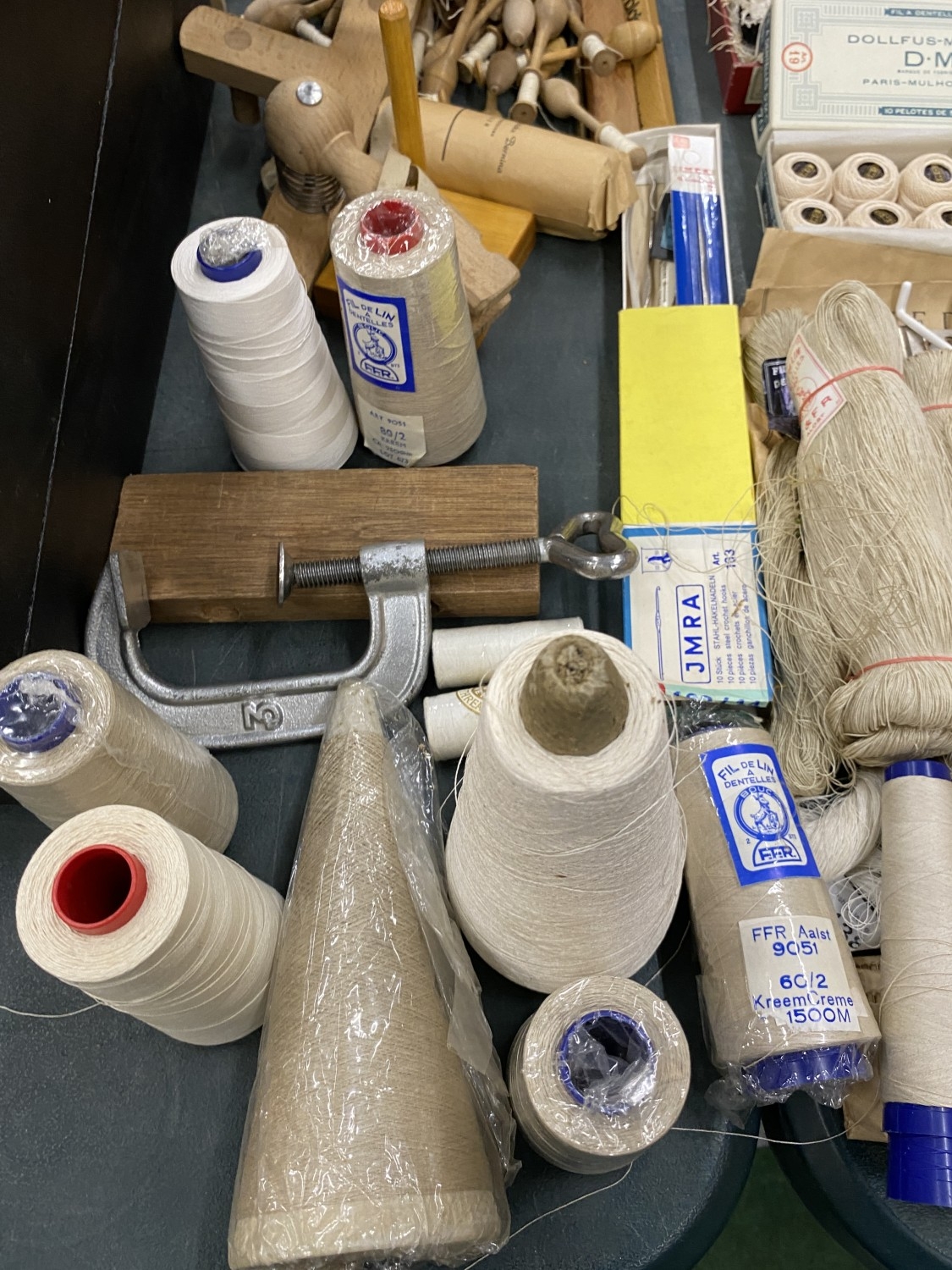 A LARGE QUANTITY OF LACE MAKING EQUIPMENT TO INCLUDE A LOOM, BOBBINS, THREADS, NEEDLES, TOOLS, ETC