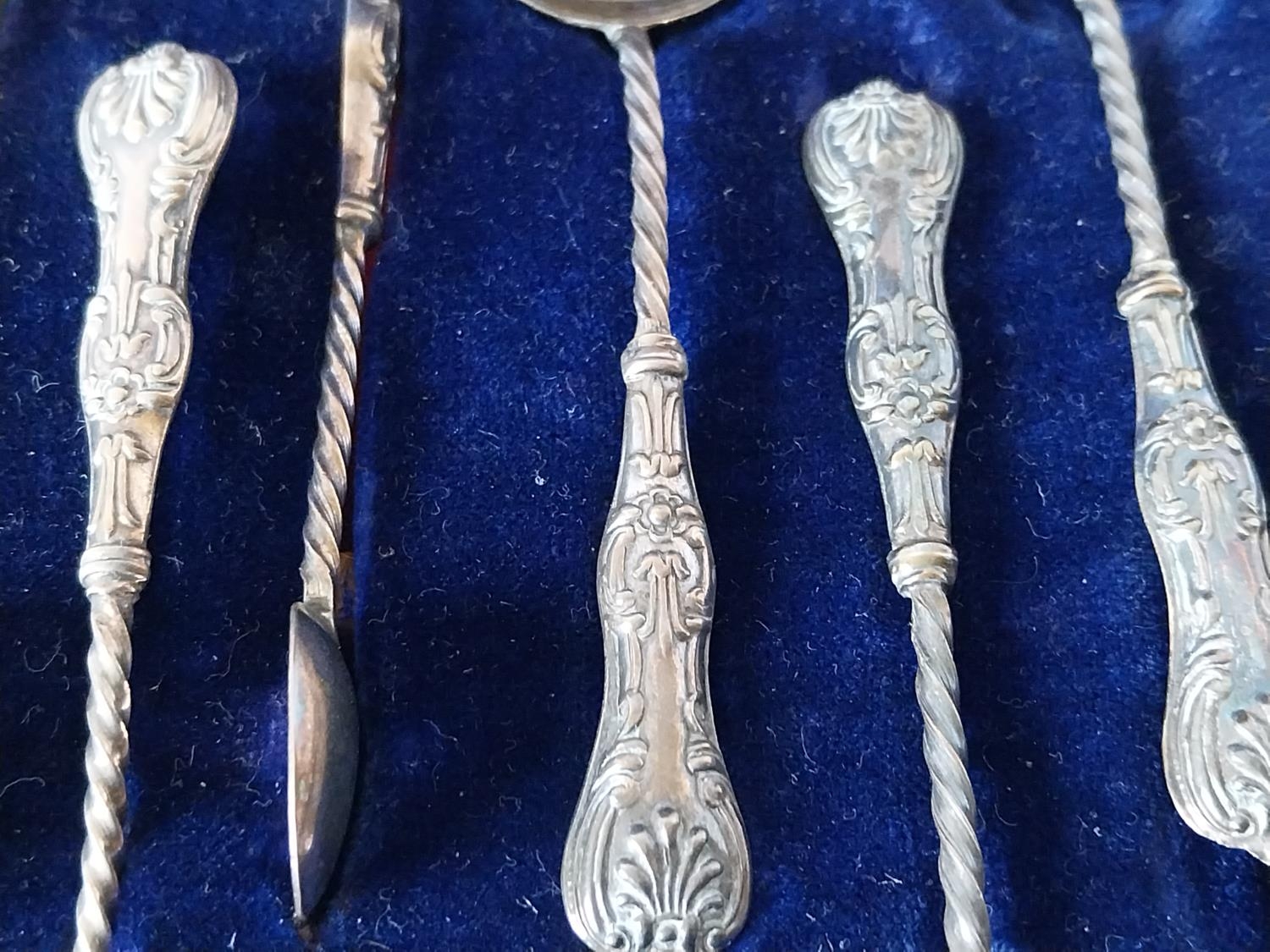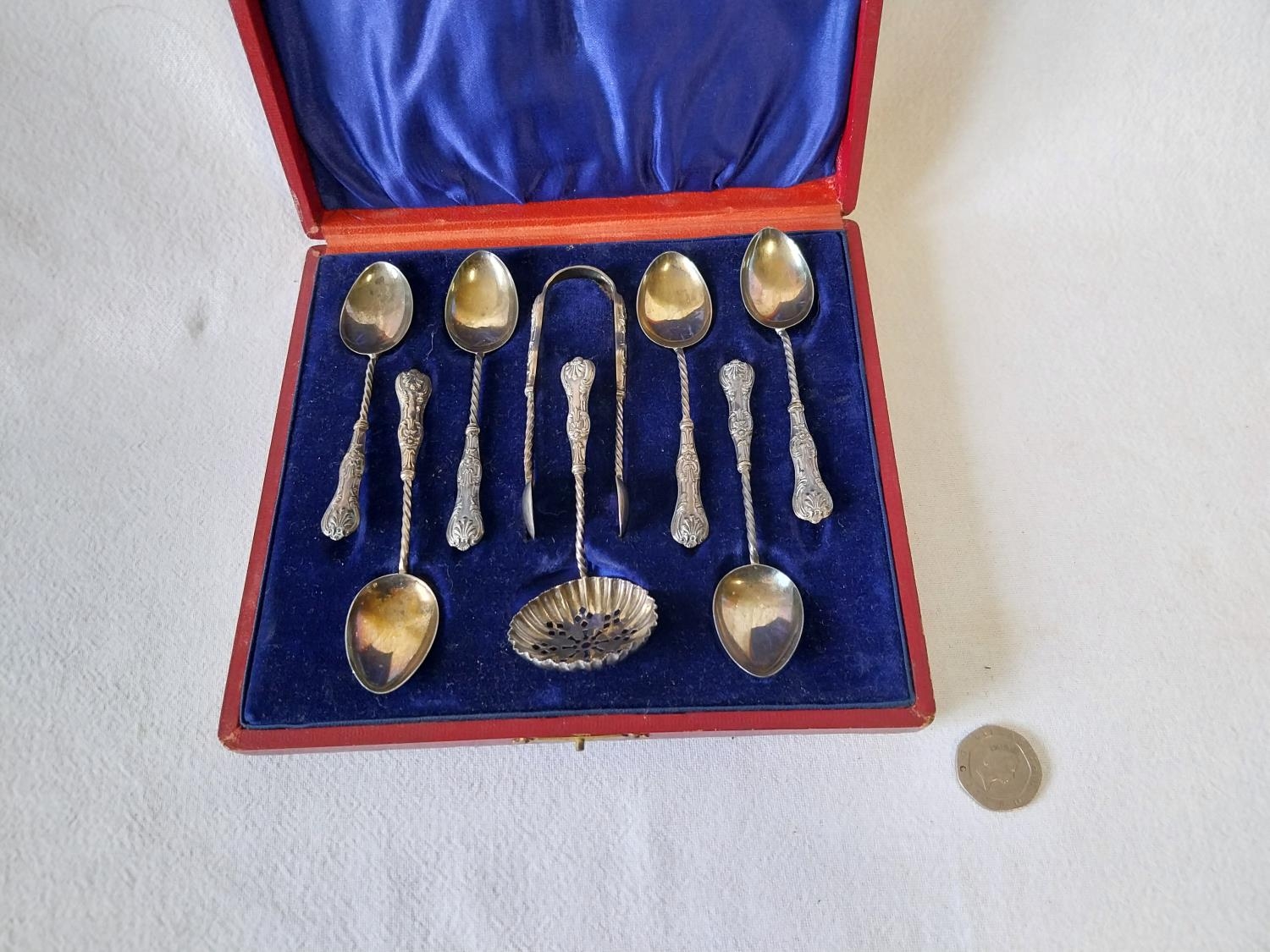 HM silver tea set 6 spoons sugar tongs & strainer by William Devenport c1898