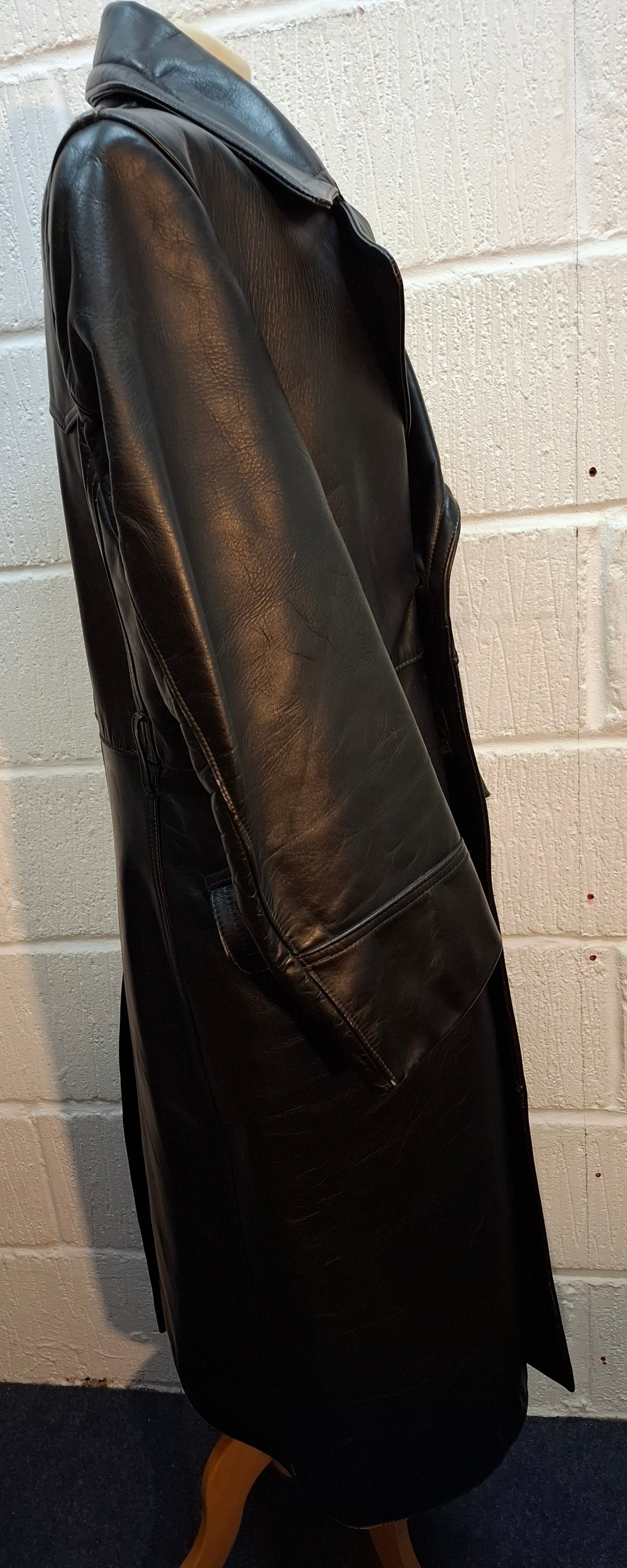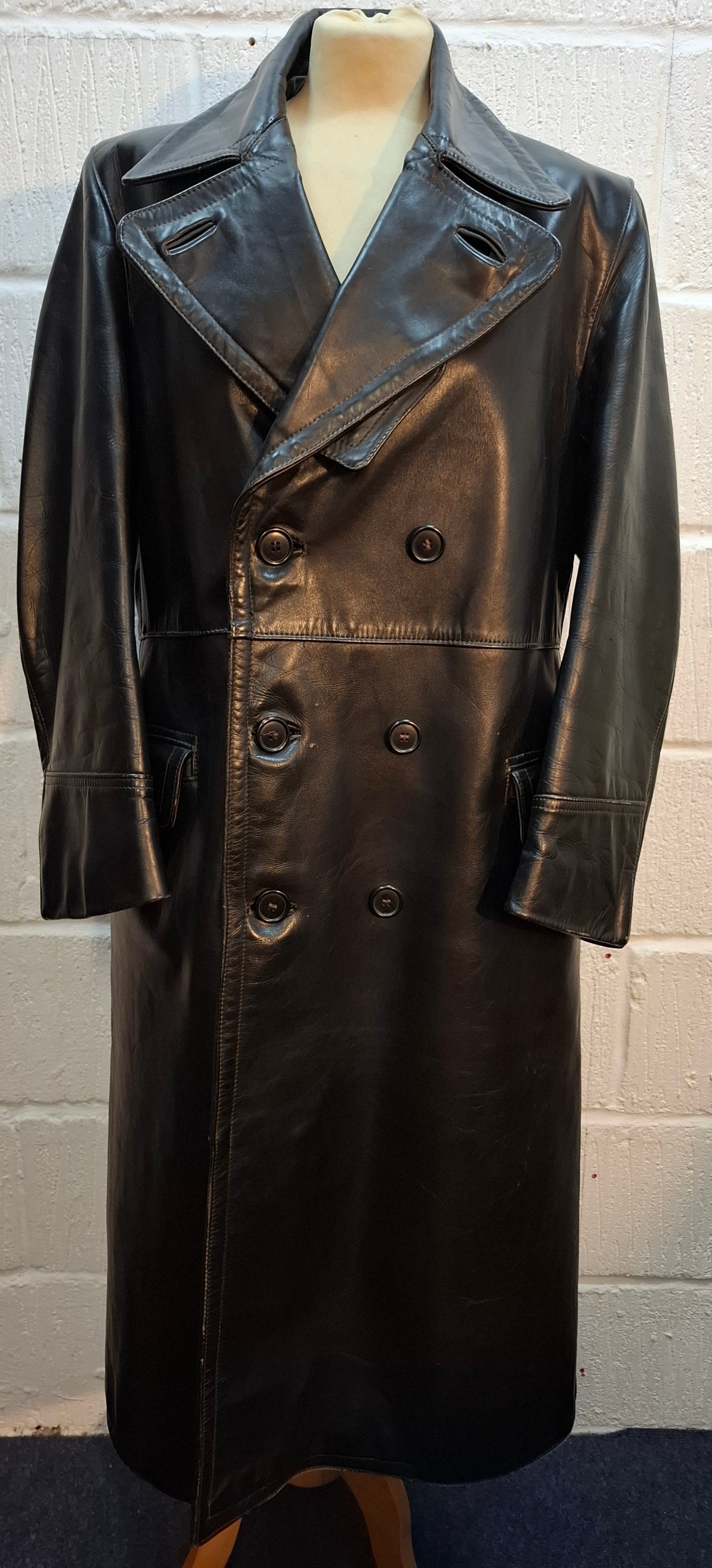 A pre-1950's German URZO Lederen Kleding full length leather motorcycle coat, no belt. Location:Rail