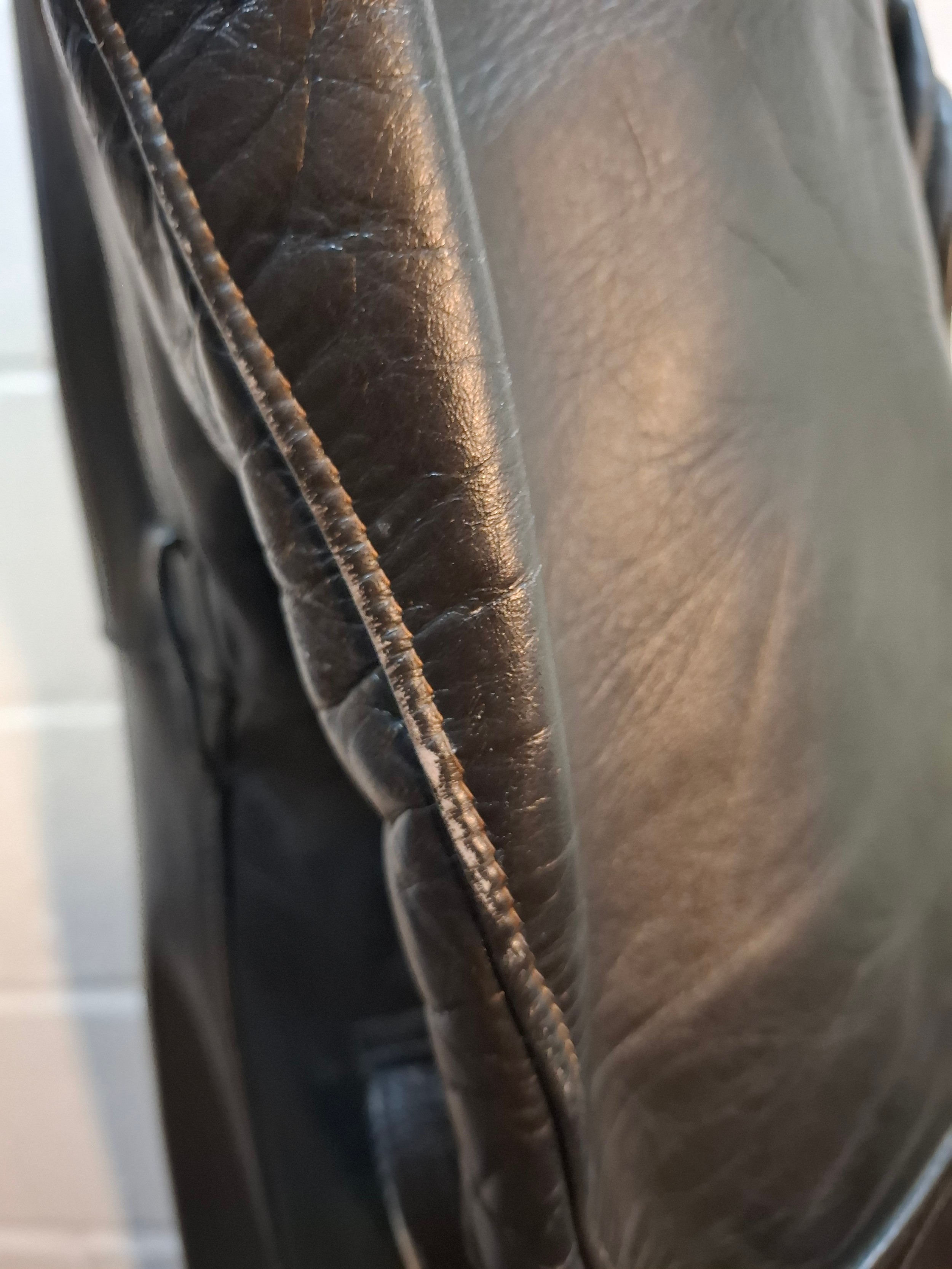 Slight wear to leather seams at cuffs, shoulders, sleeves and collar and an area along back seam requires a few stitches-see additional photos