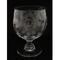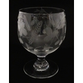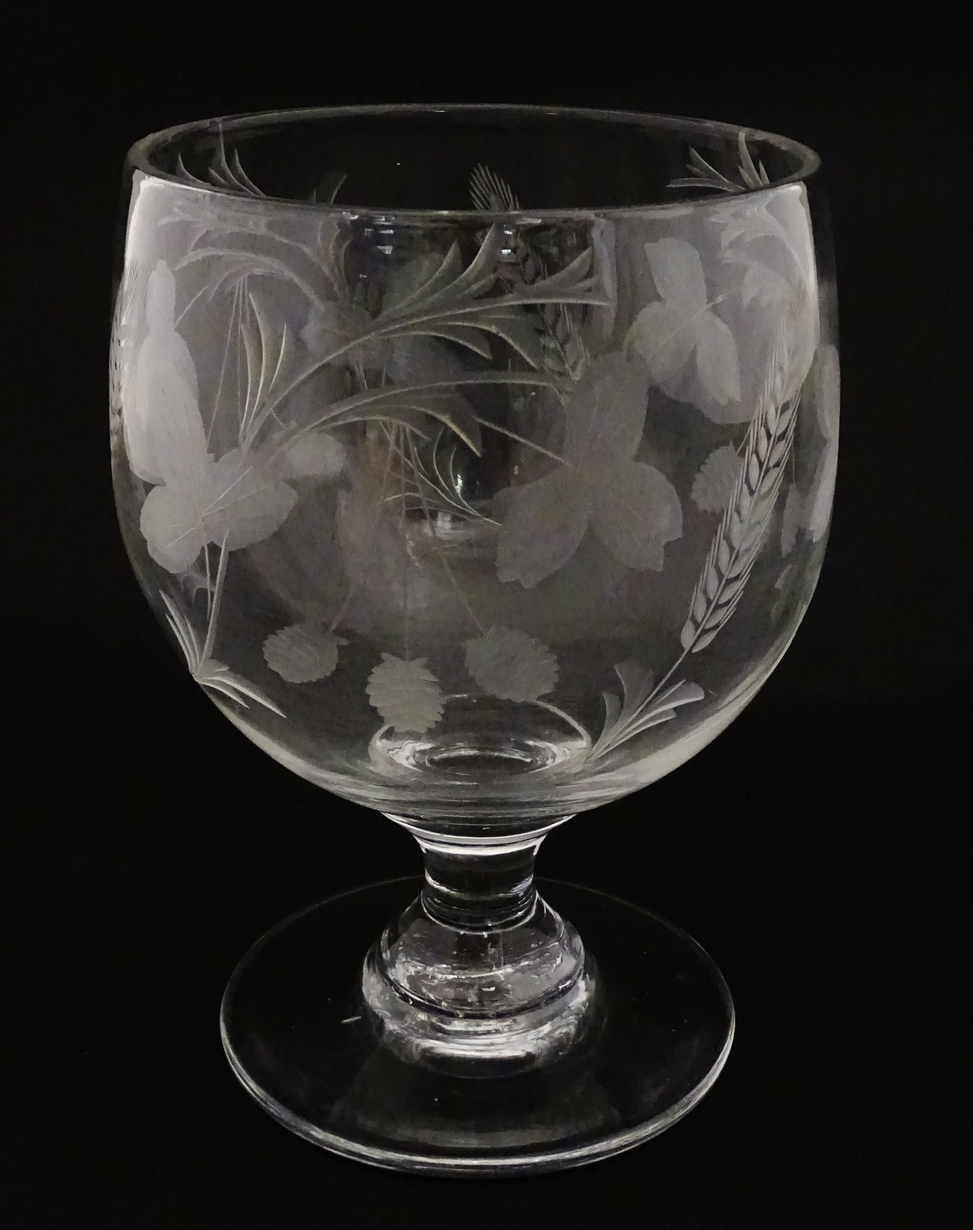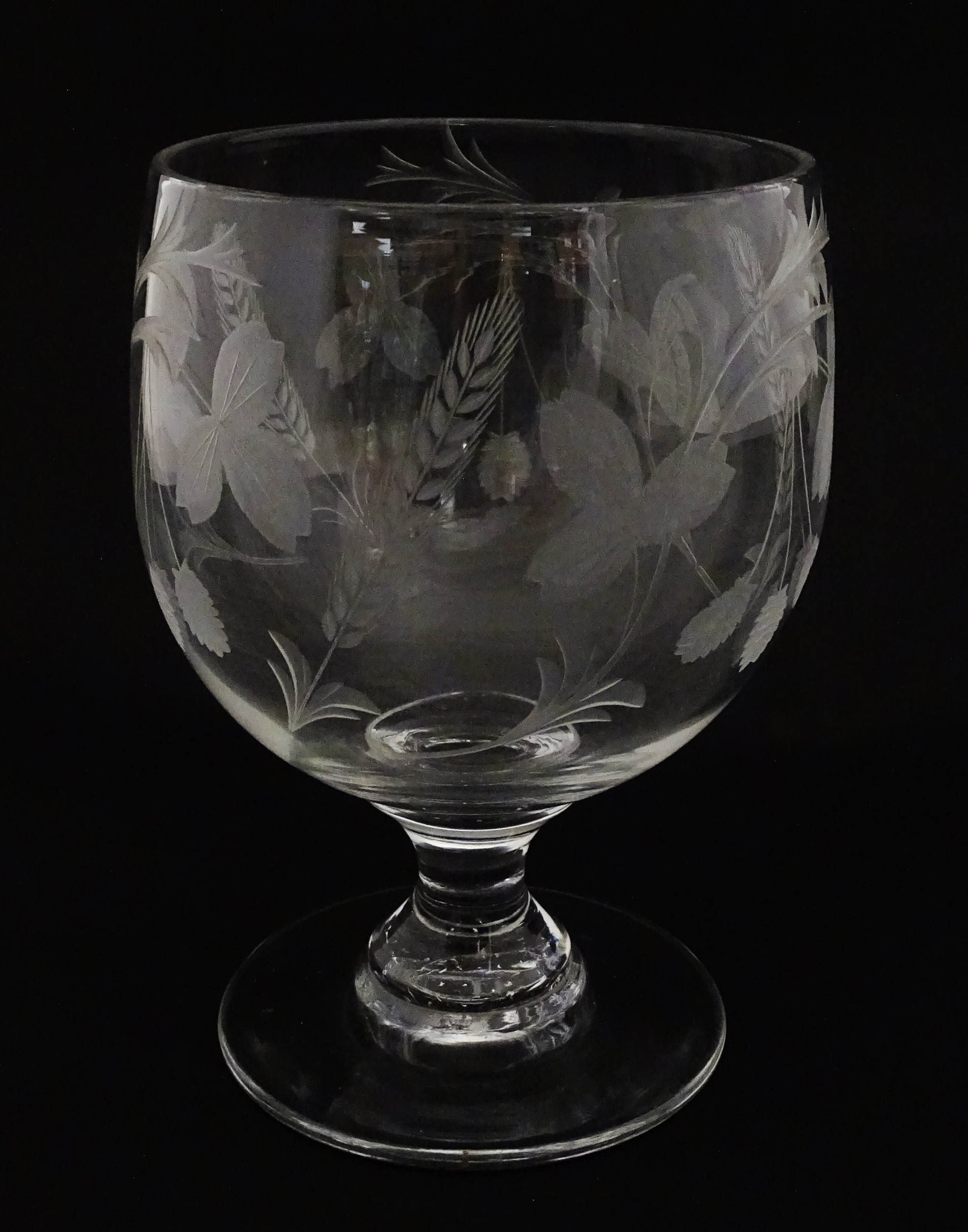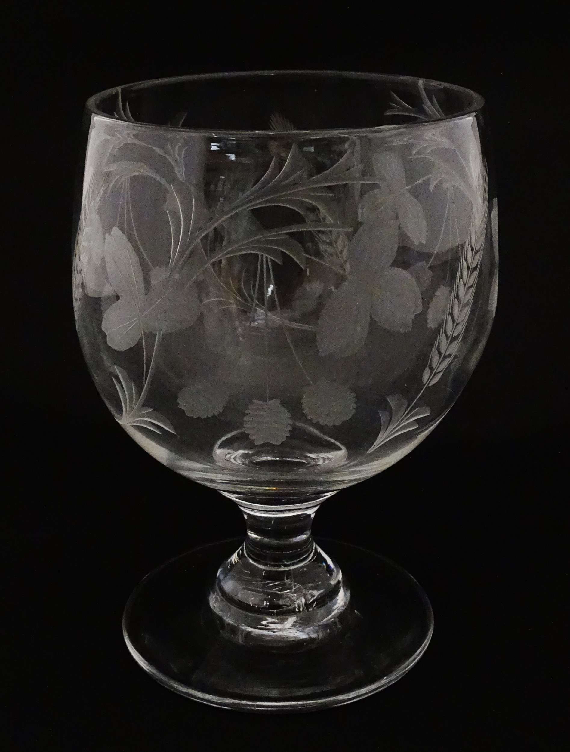 A exceptionally large pedestal glass decorated with etched hops and barley detail. Approx 8 1/2" high