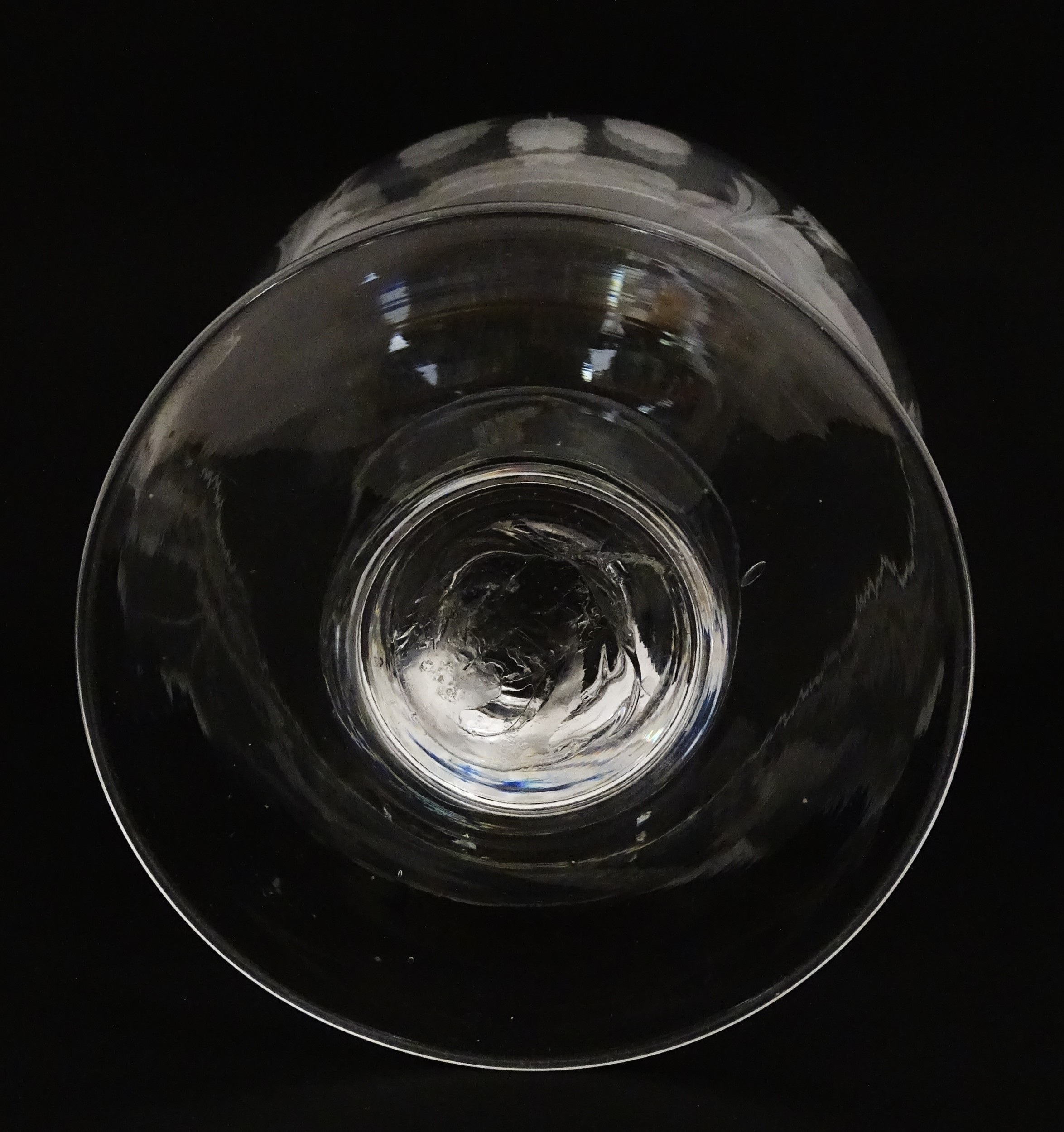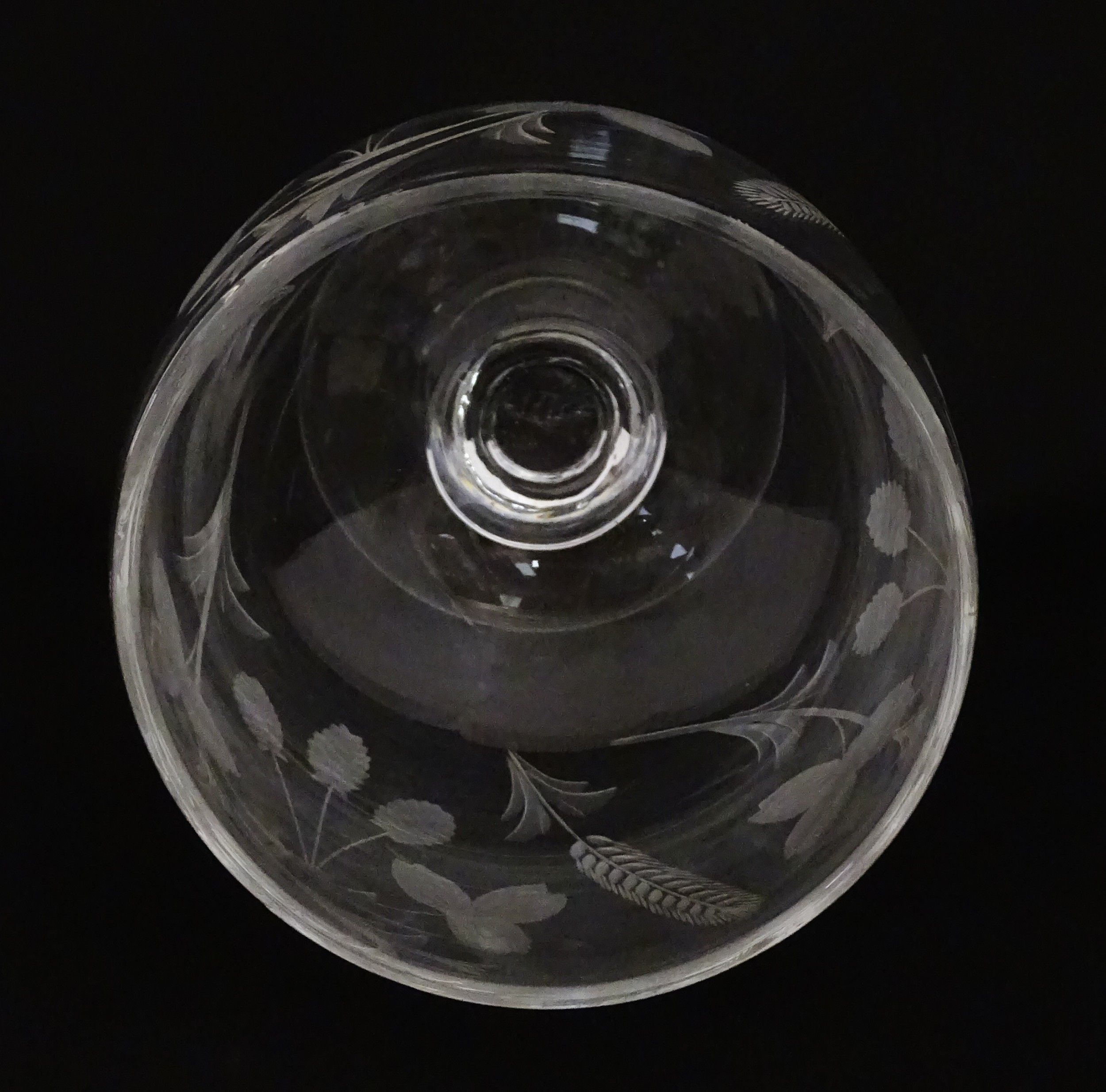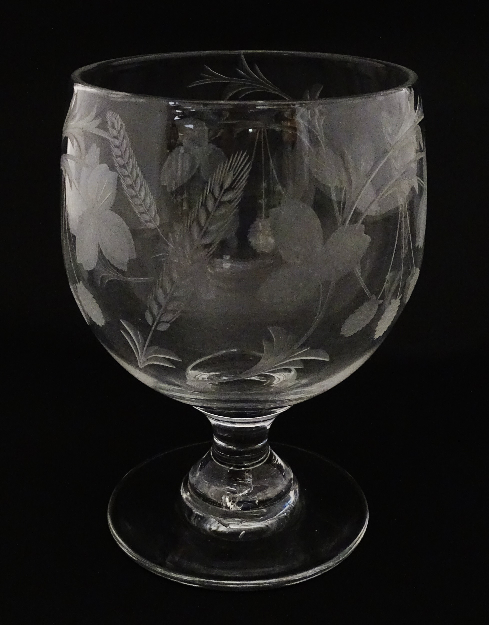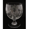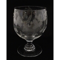 A exceptionally large pedestal glass decorated with etched hops and barley detail. Approx 8 1/2" high