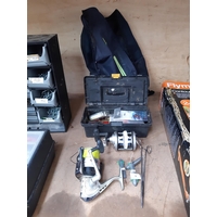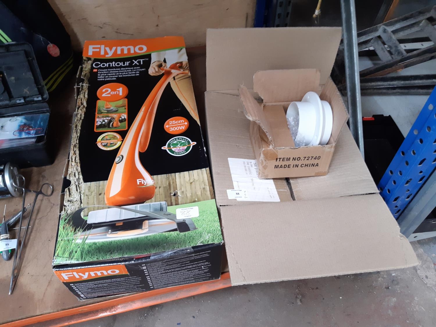 TWO ITEMS TO INCLUDE A BOXED FLYMO CONTOUR XT ELECTRIC STRIMMER AND A BOX CONTAINING LED LIGHTS, DOUBLE ADAPTORS ETC.
