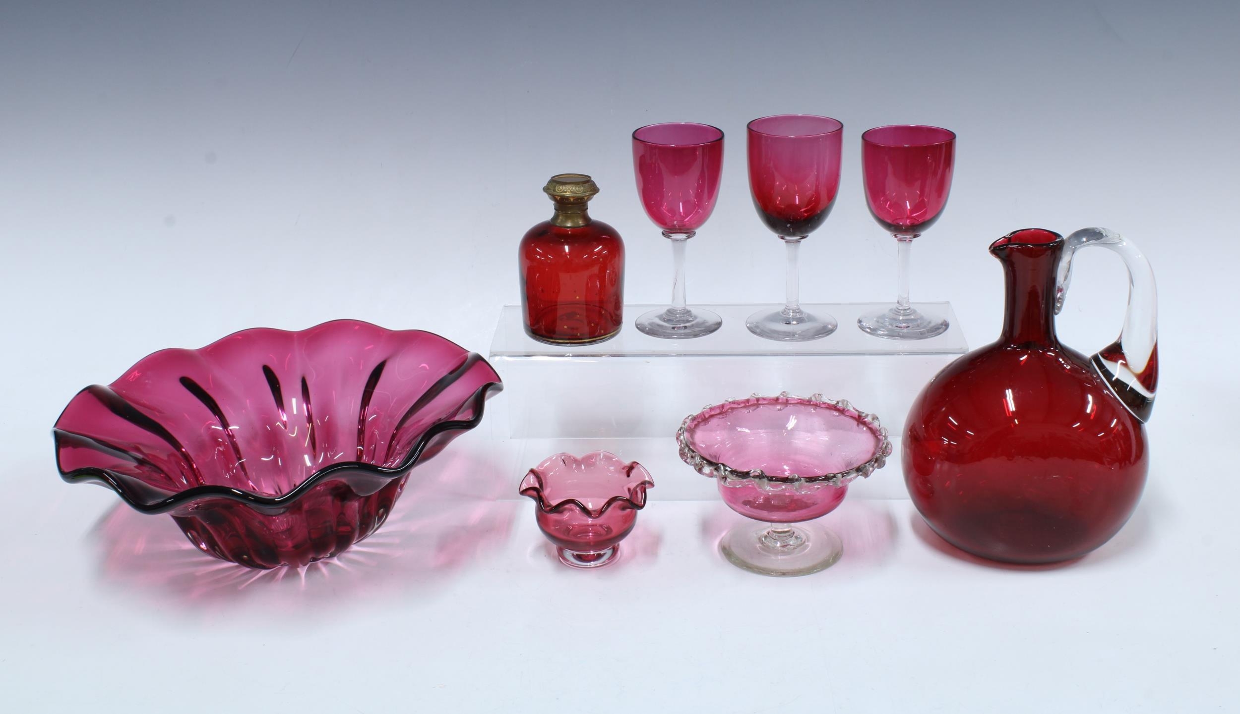 Collection of cranberry glass, including a large frilled bowl 26cm diameter, three glasses, a jug, a scent bottle etc (8)