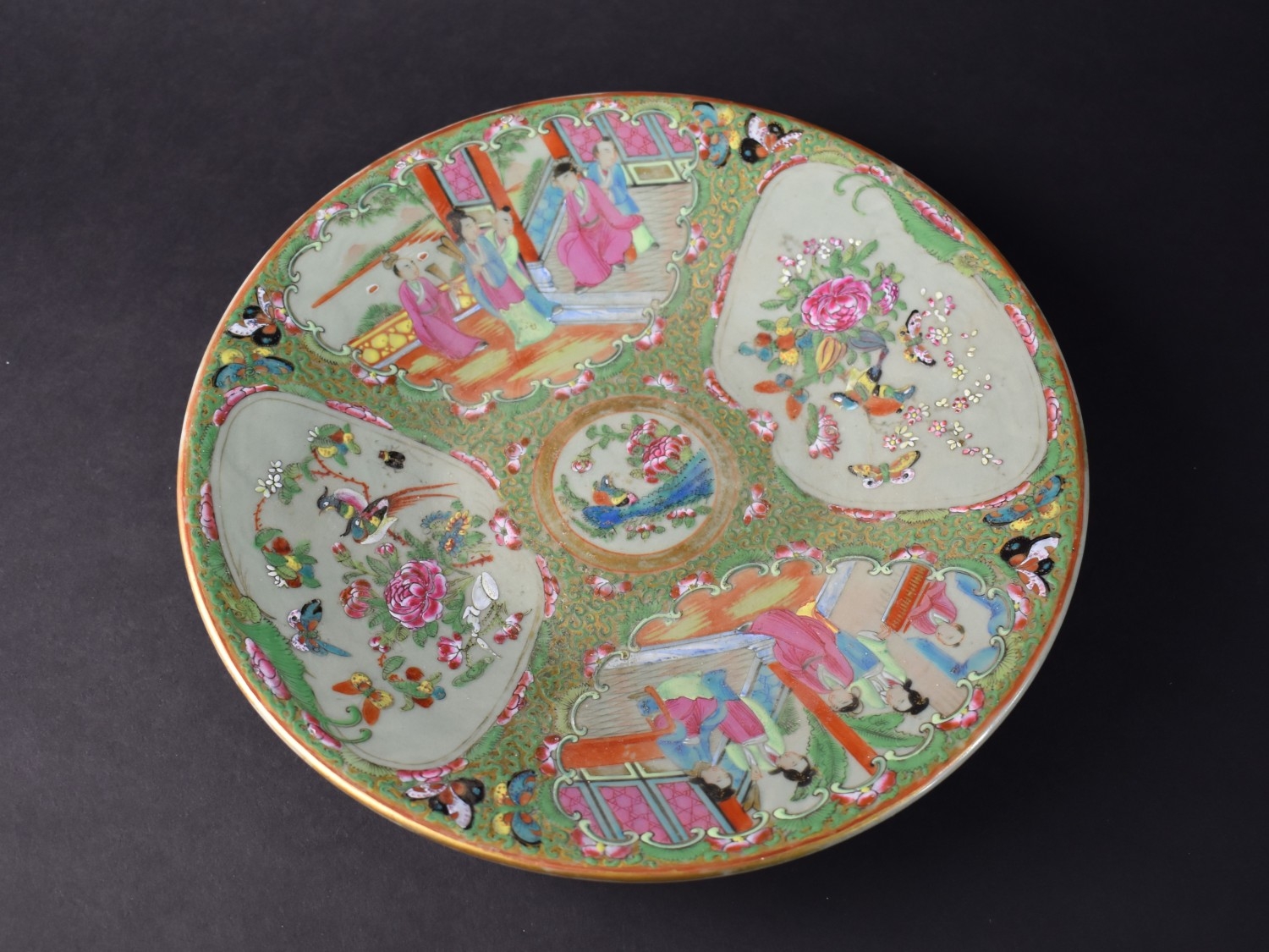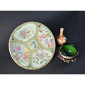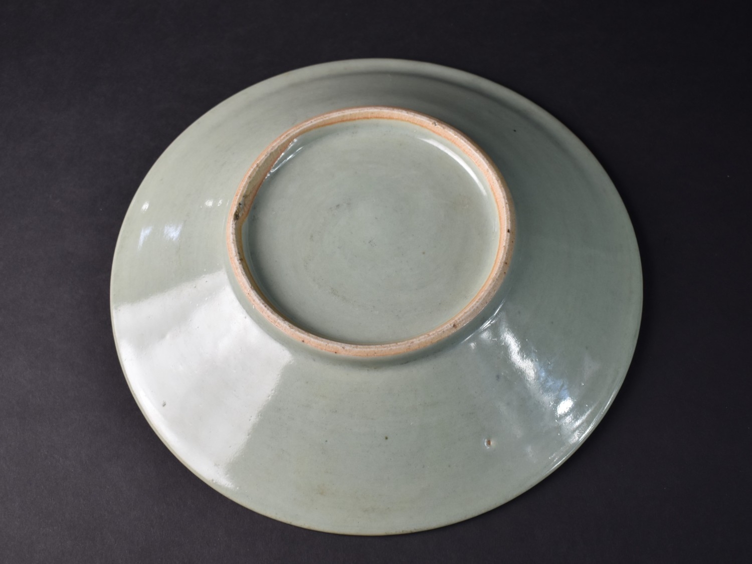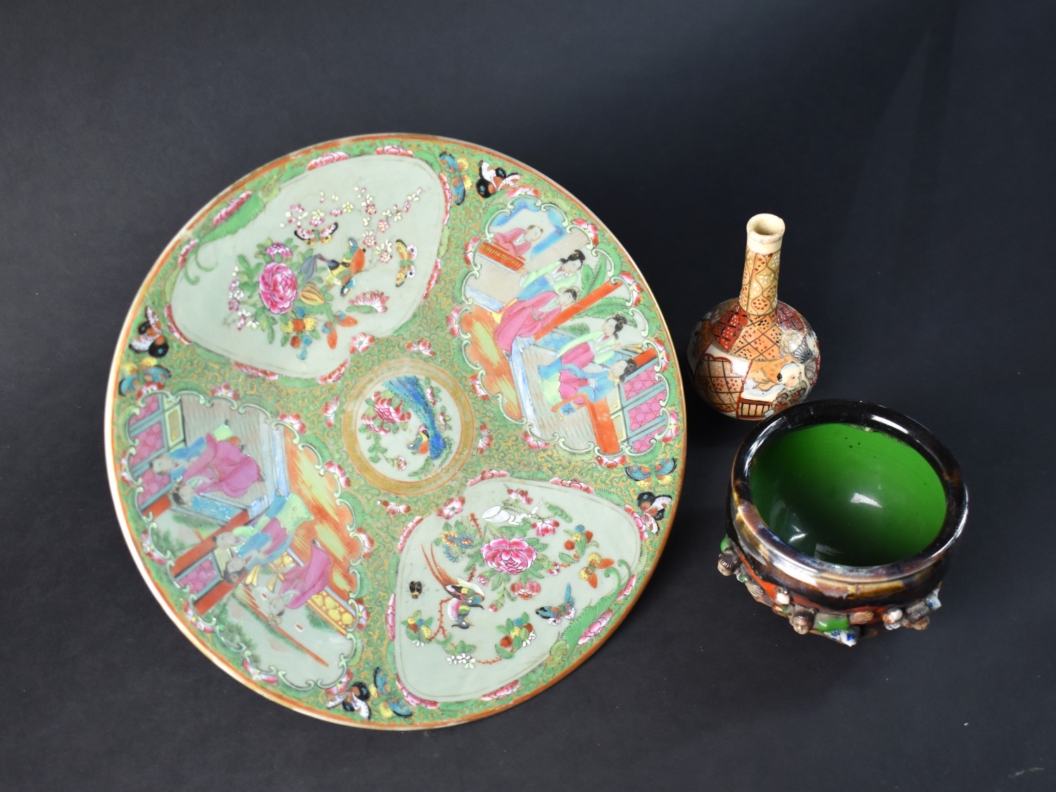 A Collection of Oriental Ceramics to Comprise Chinese Celadon Glazed Famille Rose Decoration Dish, 28cm Diameter, Japanese Satsuma Bottle Vase and a Japanese Sumida Gawa Pottery Bowl (Some Condition Issues)