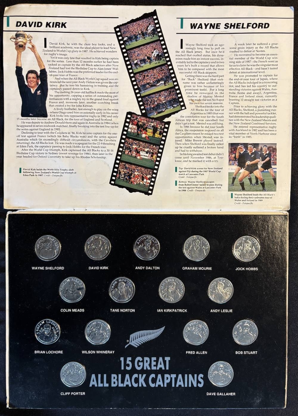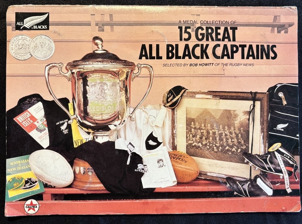 c1990 NZ All Blacks’ Rugby Captains Medal Collection in Album: Full set of captain’s heads medals from 1905 D Gallaher to Buck Shelford in 1989 with full descriptions in special colourfully memorabilia-decorated fold over A4 album. G