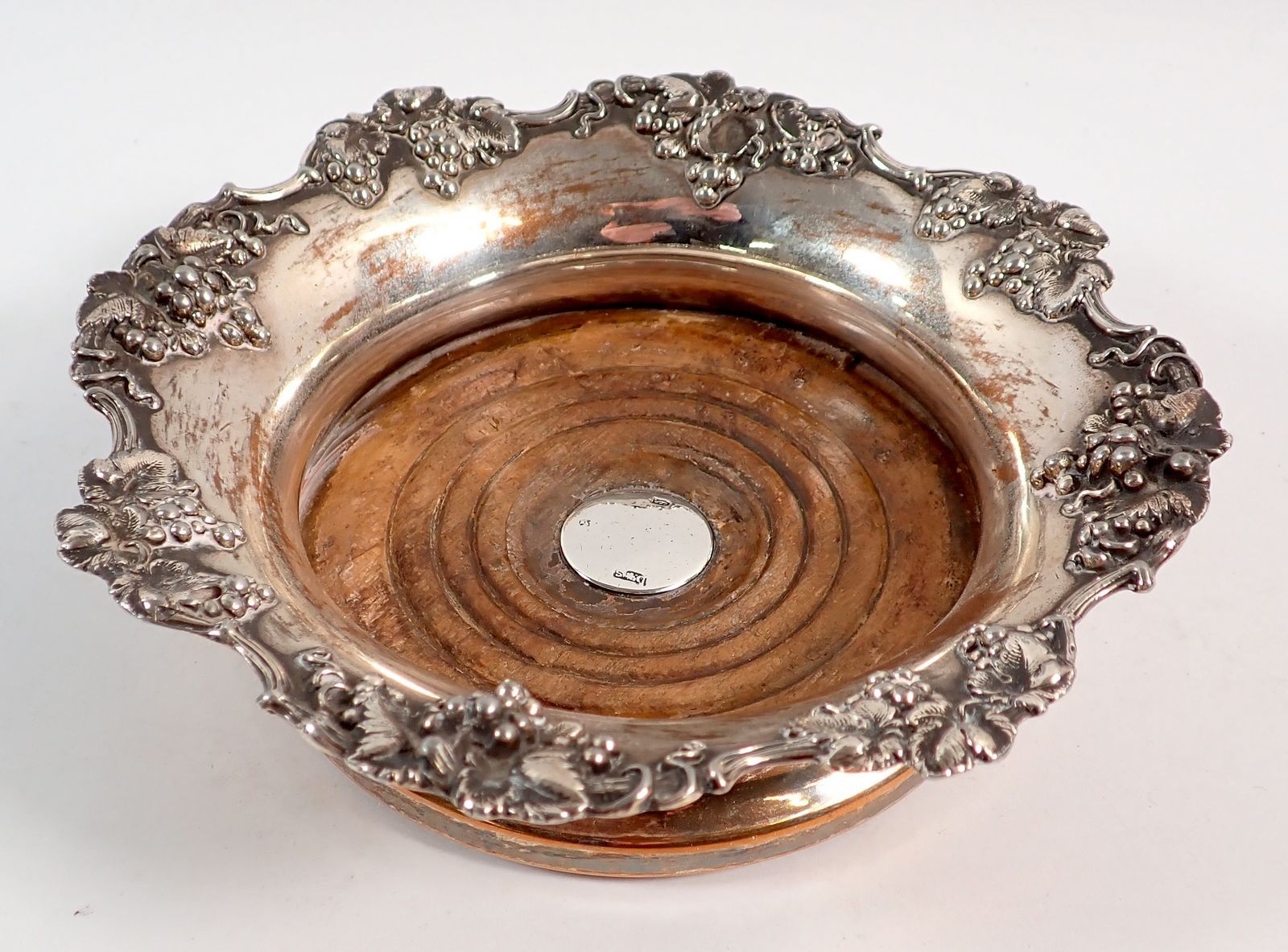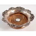 A Victorian Sheffield plated bottle coaster with vine decoration and silver insert to wooden base, 17cm diameter