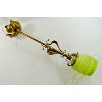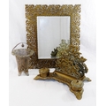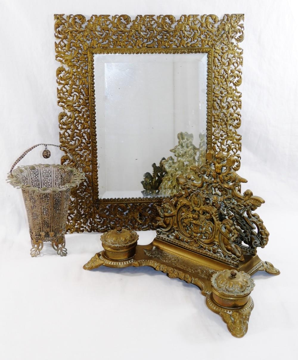 A late Victorian ornate brass desk stand, 30cm wide, a rectangular brass framed table top bevelled edge mirror, 38.5cm x 33cm and a filigree basket raised on four feet with plaited wire handle, 19cm high