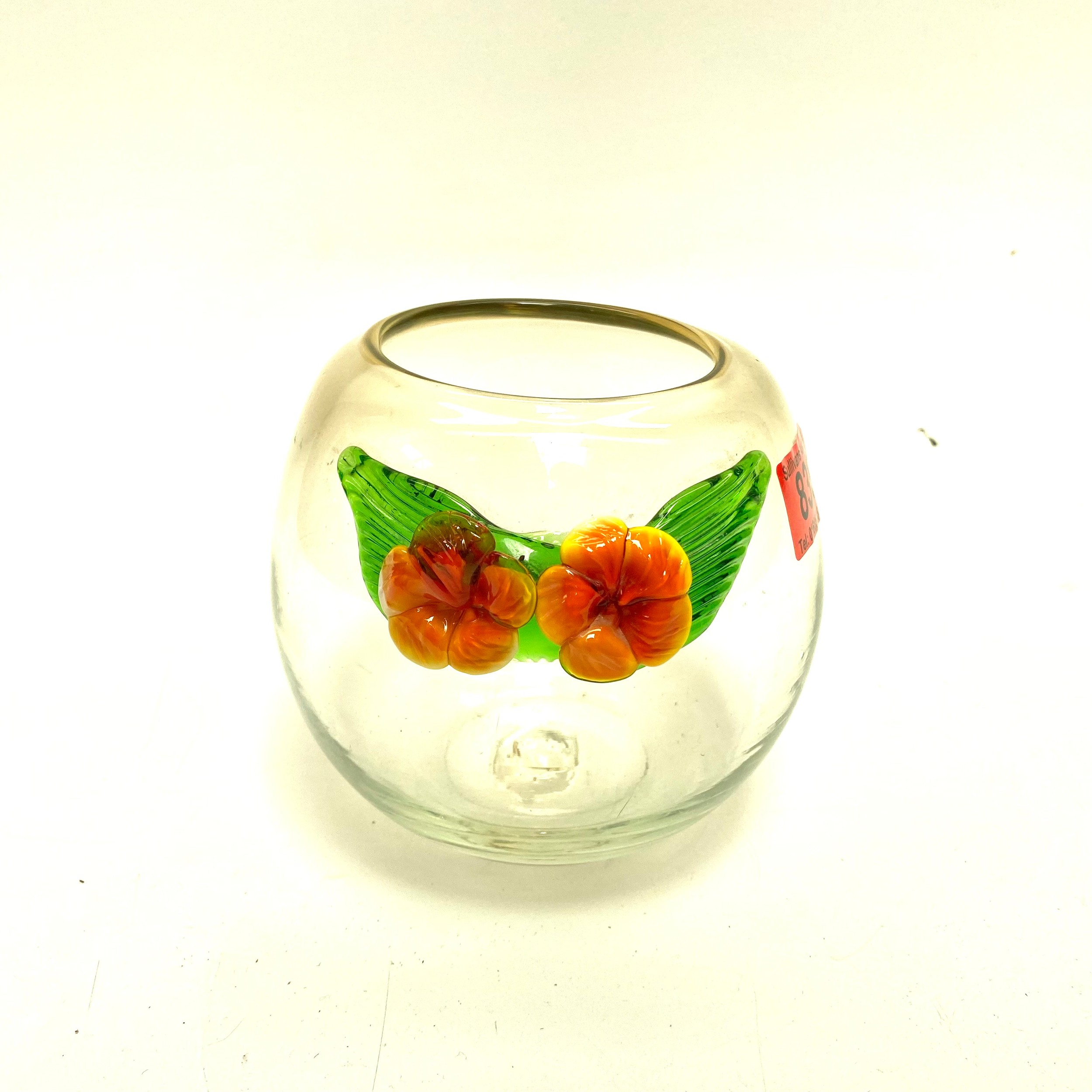 A hand blown retro glass fishbowl / rose bowl with applied Murano style flowers, green tinge to glass.