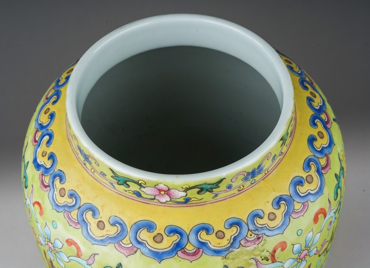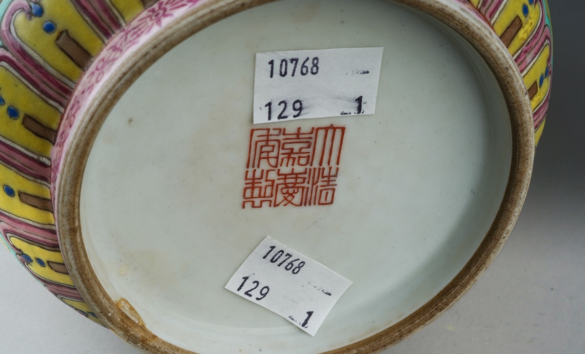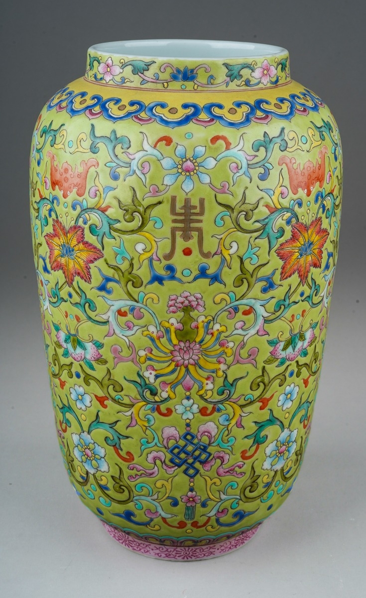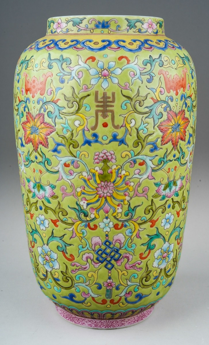 A Chinese Famille Rose baluster vase polychrome enamelled on a light green ground, decorated with bats, foliate motifs and archaic symbols, seal mark to underside, height 27.5cm