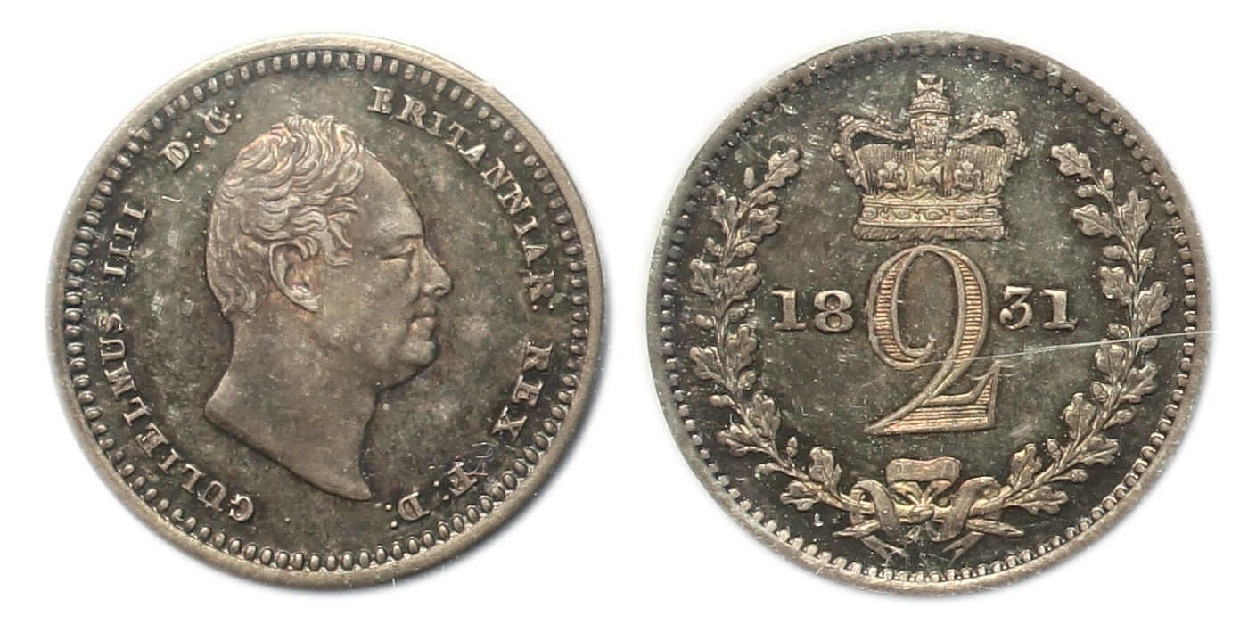 William IV (1830-1837) Maundy Twopence, 1831 Bare head right, rev. crowned value in wreath, (SCBC 3843). Graded by NGC (8534312-010) as PF65