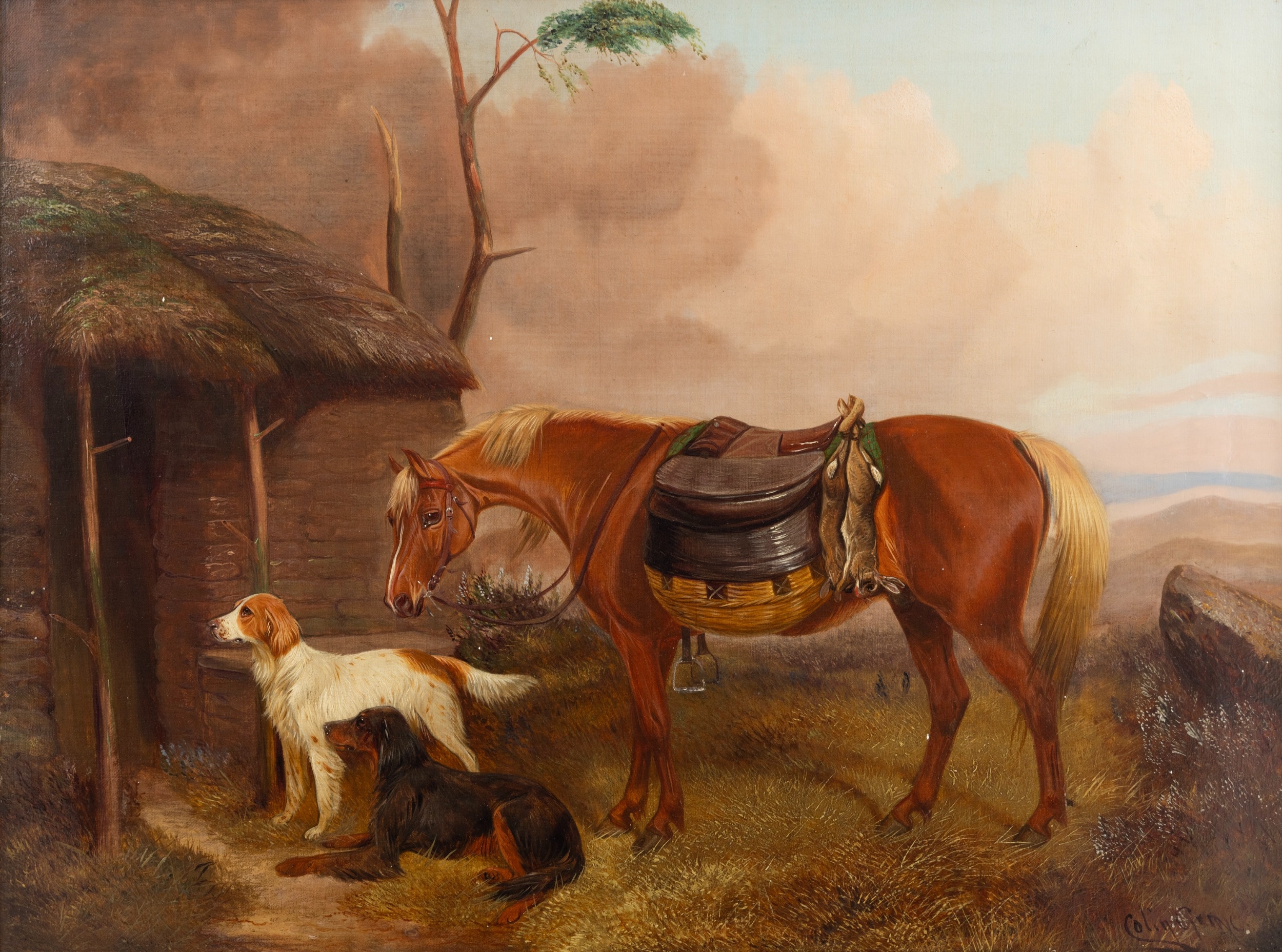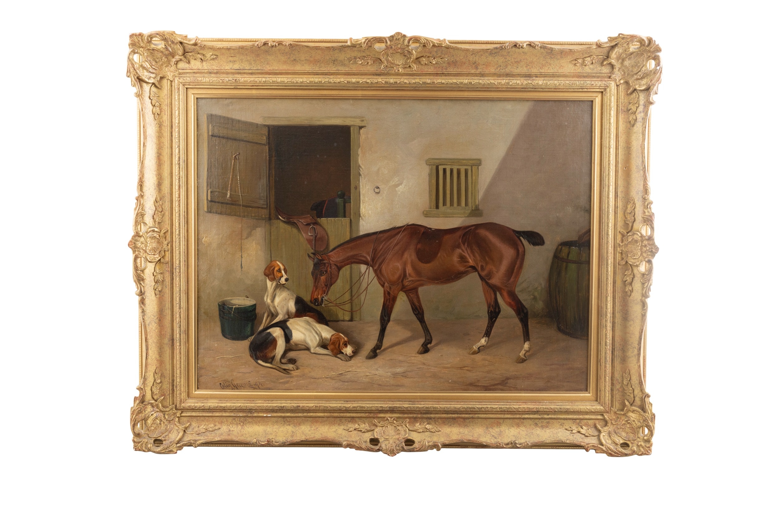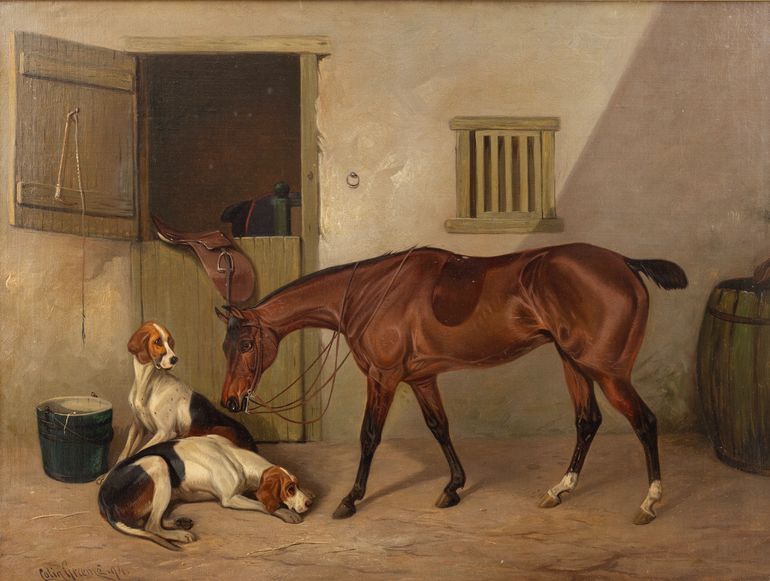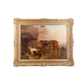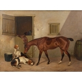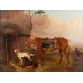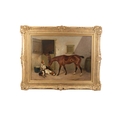 COLIN GRAEME ROE (1858-1910) Bay Hunter with Hounds in a Stable Yard Game Hunter's Piny with Setters A Pair, oil on canvas, 44 x 59cm One dated (18)'94