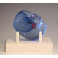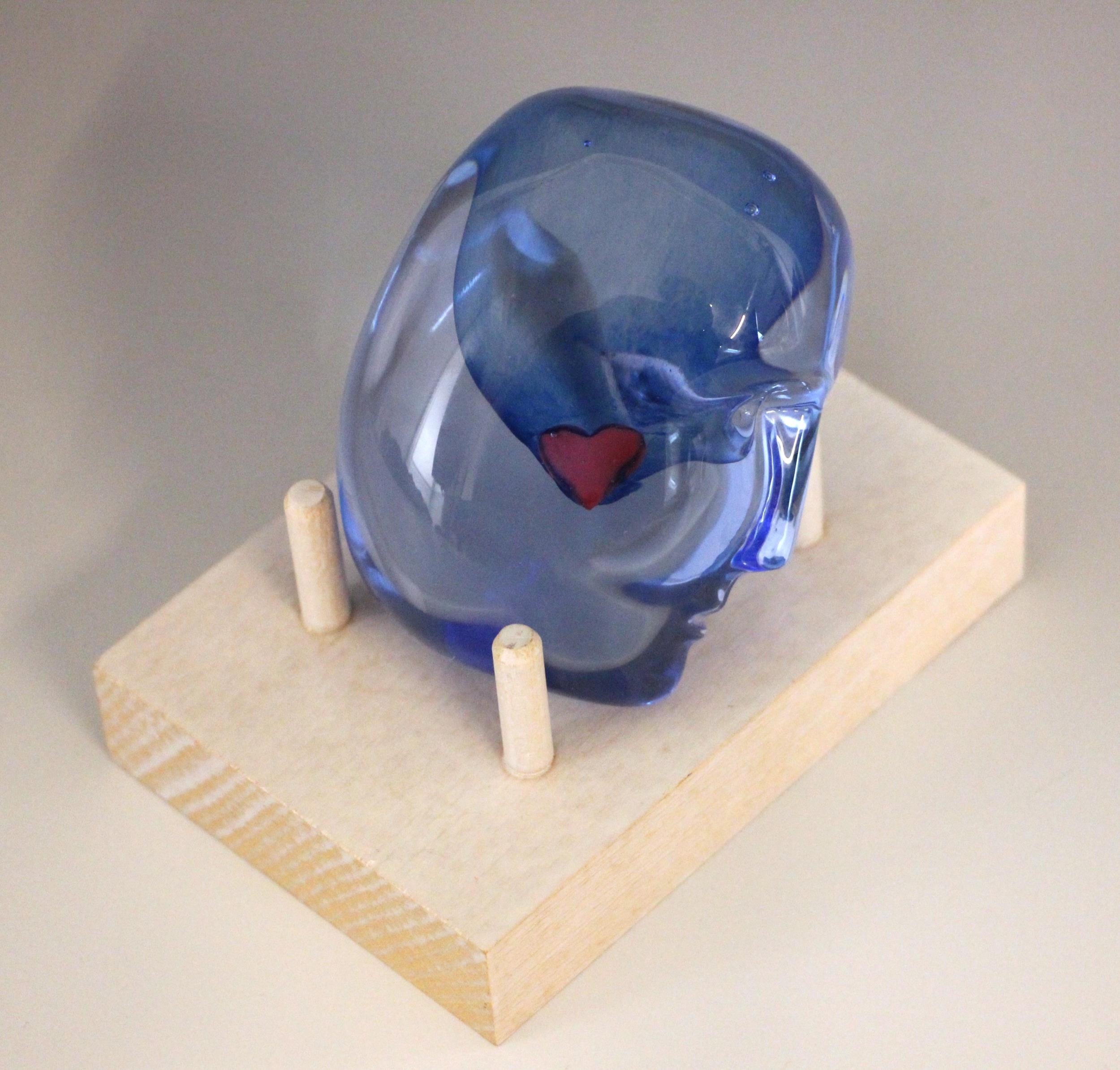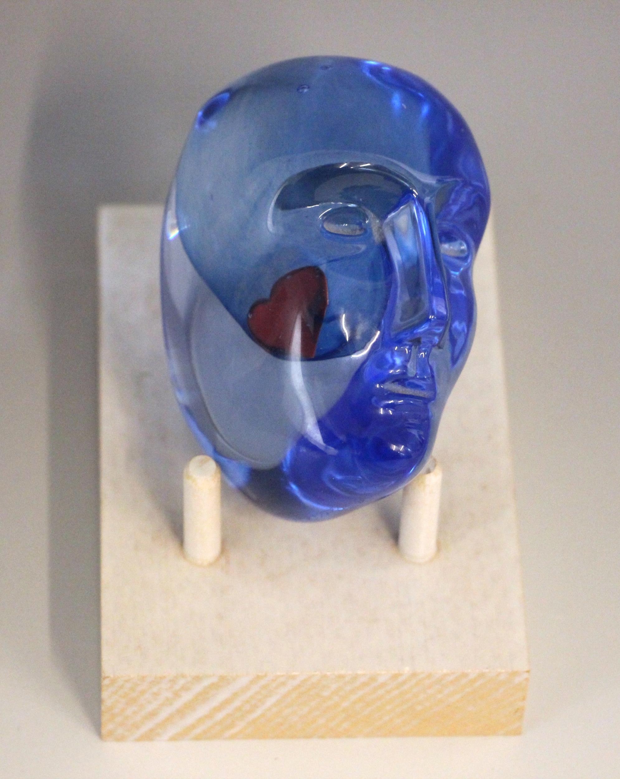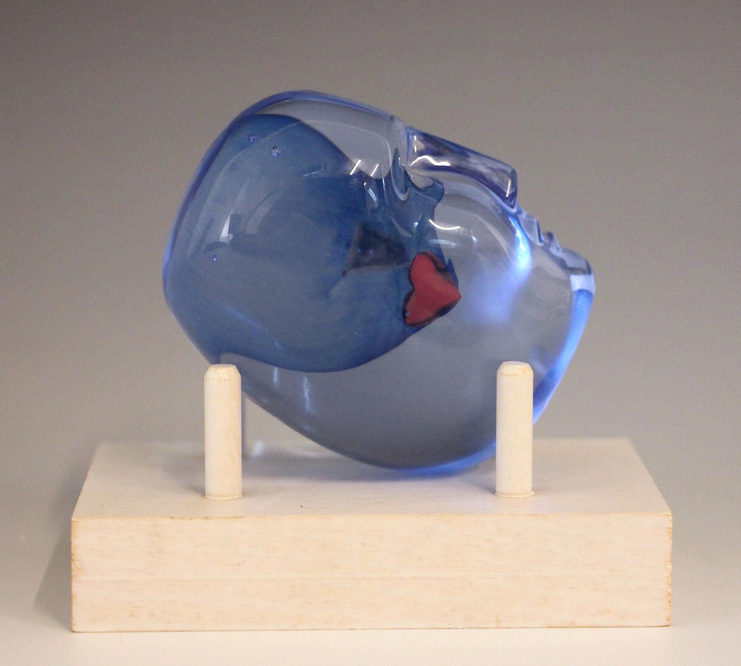A Bertil Vallien (Swedish, b. 1938) for Kosta Boda, a glass 'Brains Heart' sculpture from the 'Brains' series, modelled as a blue glass head inset with a red heart, engraved signature below chin, 7.5cm high overall, on a conforming Kosta Boda peg stand,