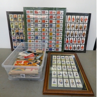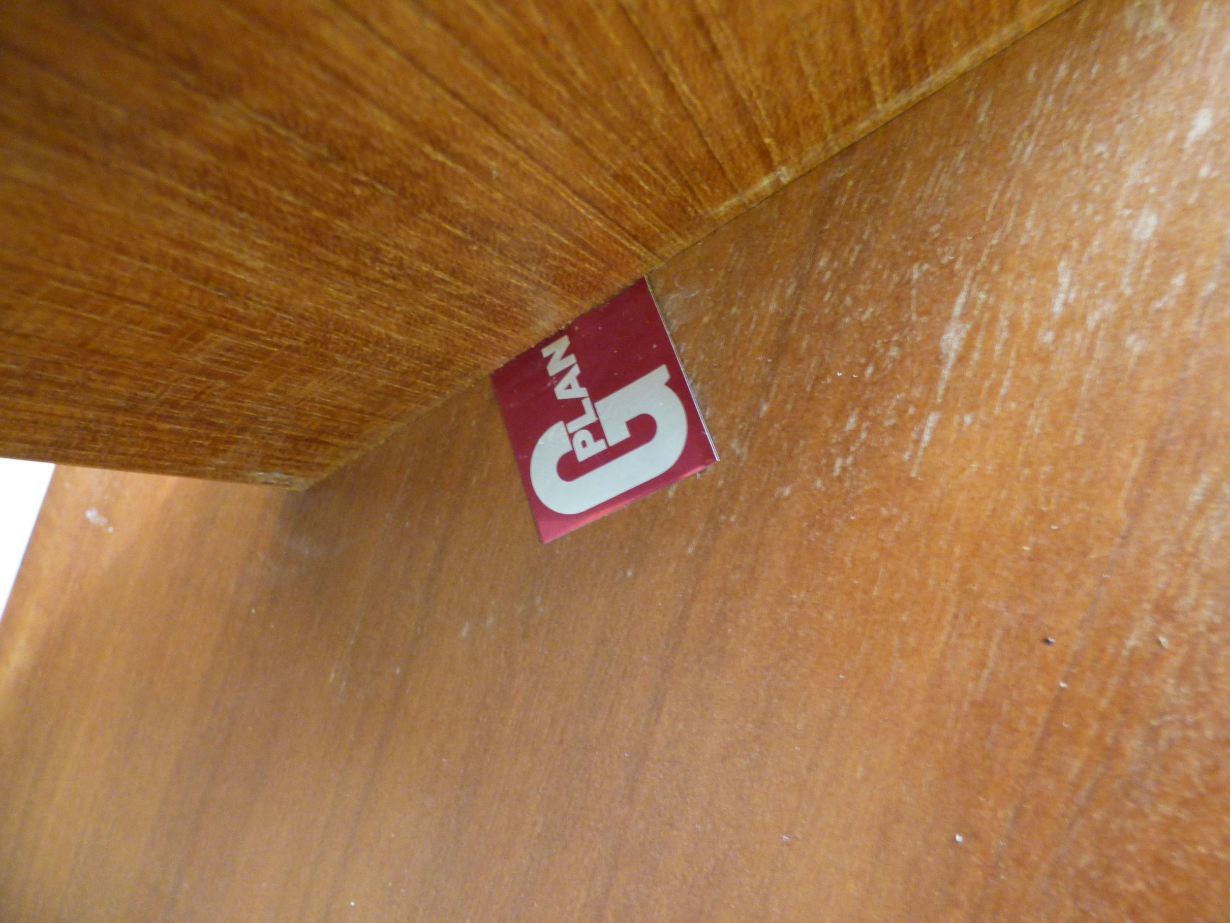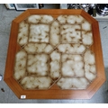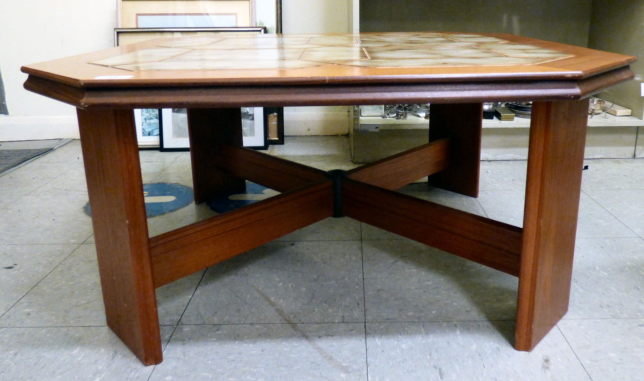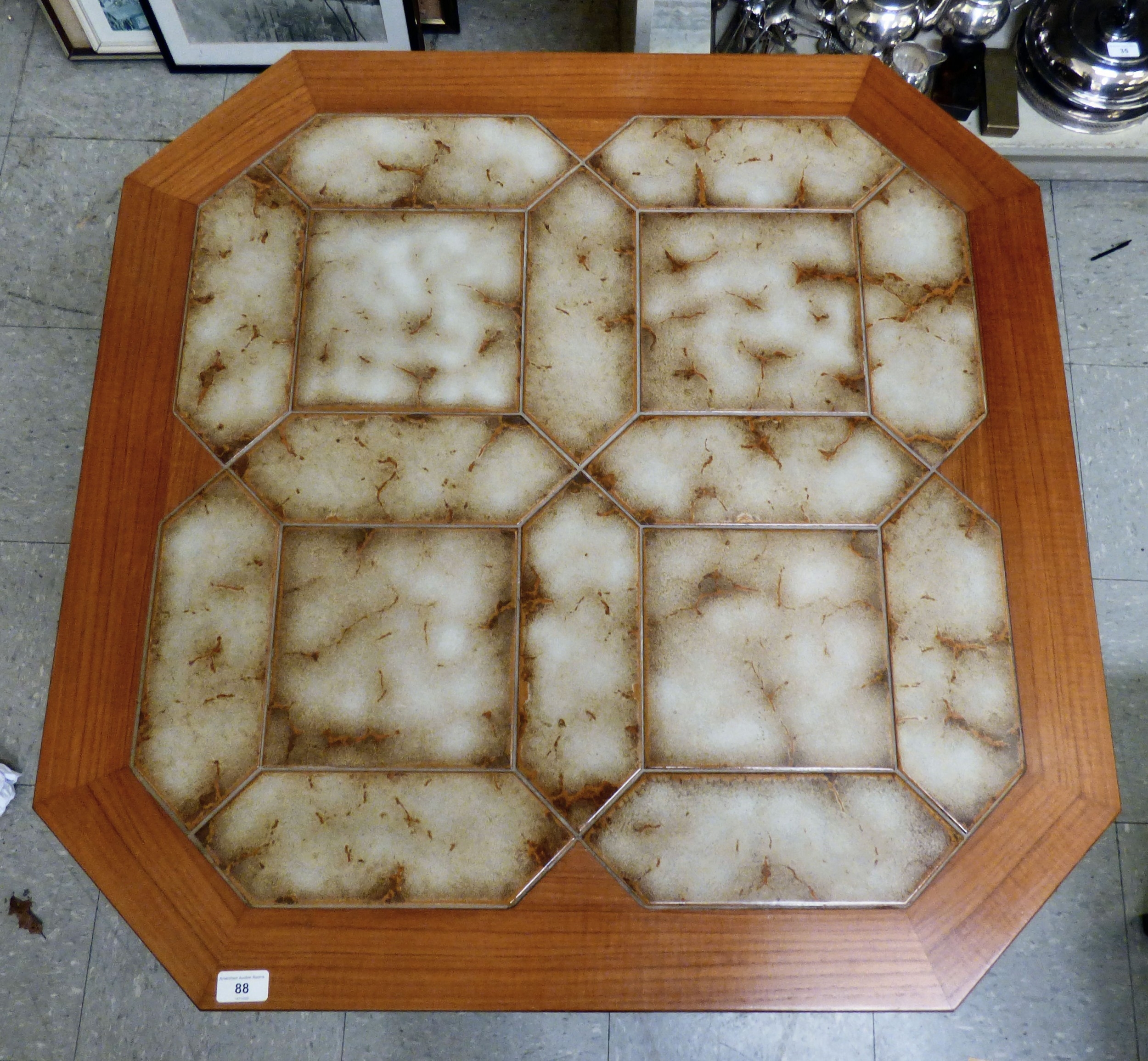 A G-Plan teak framed coffee table with canted corners and tile top, raised on planked supports 17"h 34"w