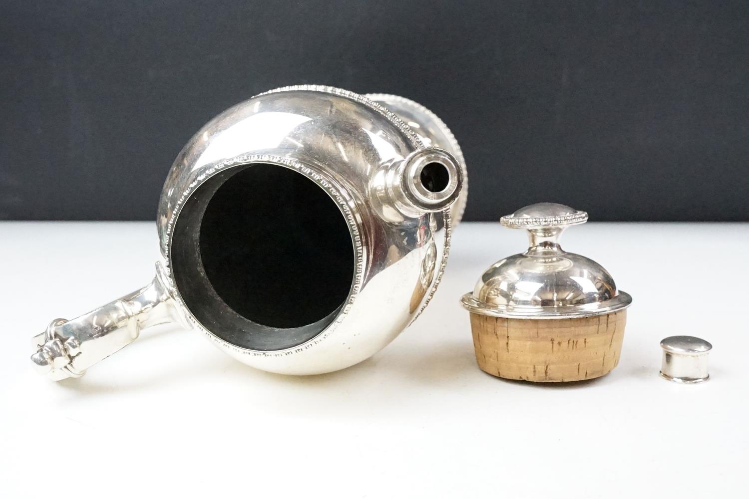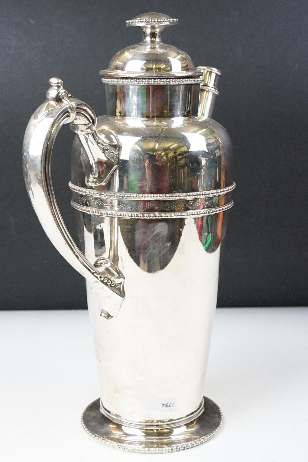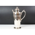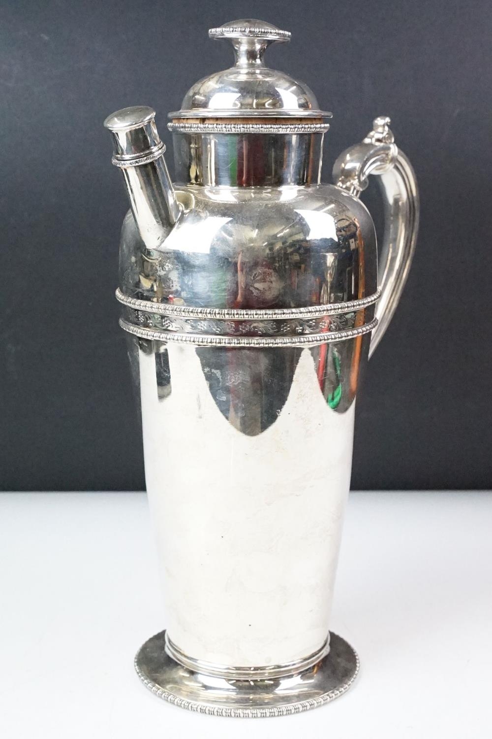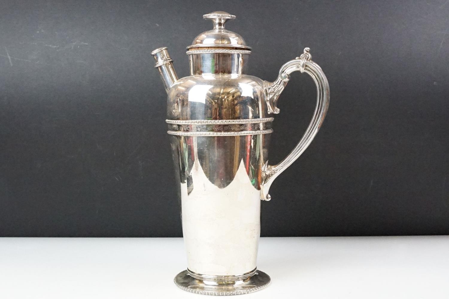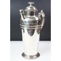 A large silver plated prohibition coffee pot cocktail shaker, markings to base.