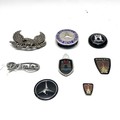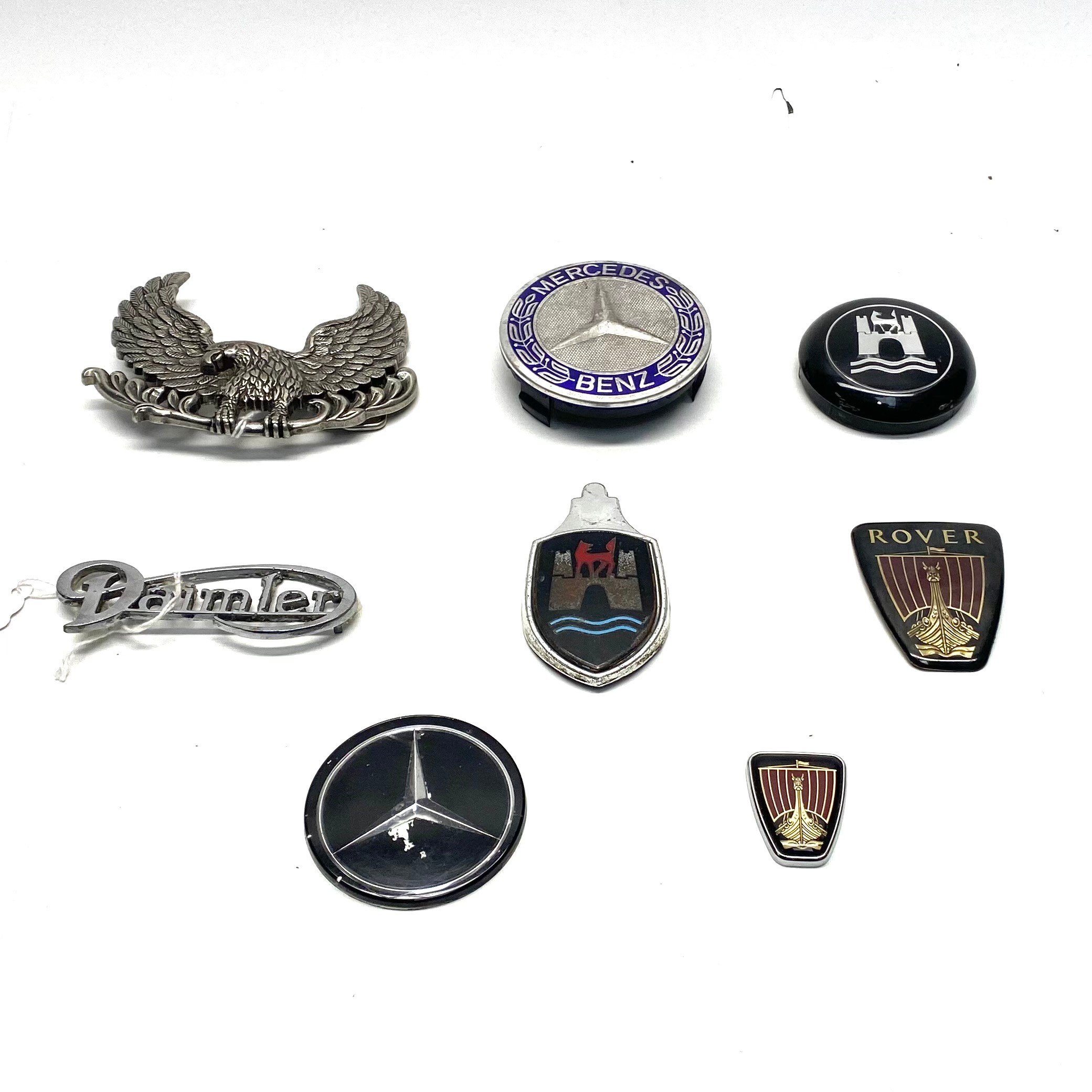 collection of car badges including: Mercedes Benz, Daimler and Rover.