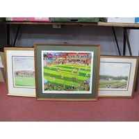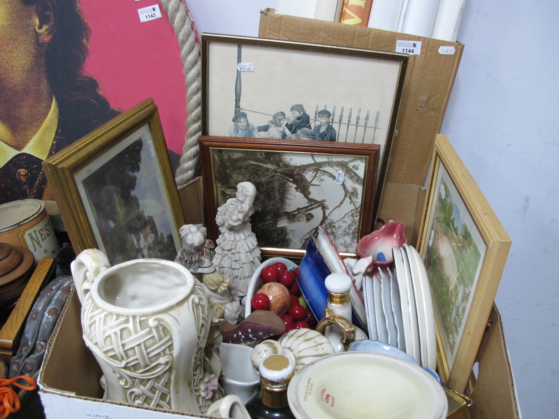 An oversized novelty Capodimonte teapot, three empty Bells decanters, two Staffordshire jug and bowl sets one pink one blue, two figures of ladies, various display plates and four framed prints. 1 Box.