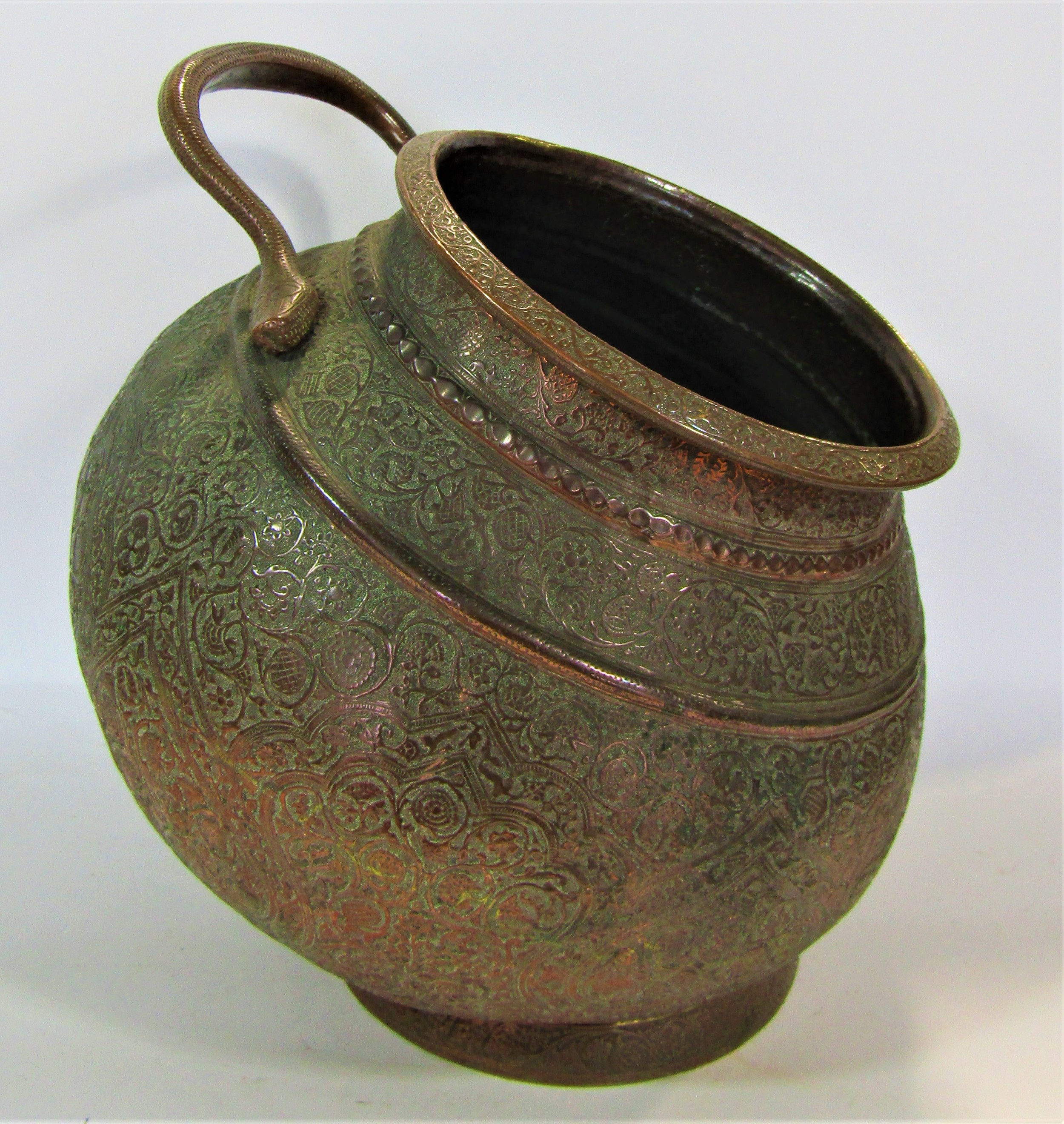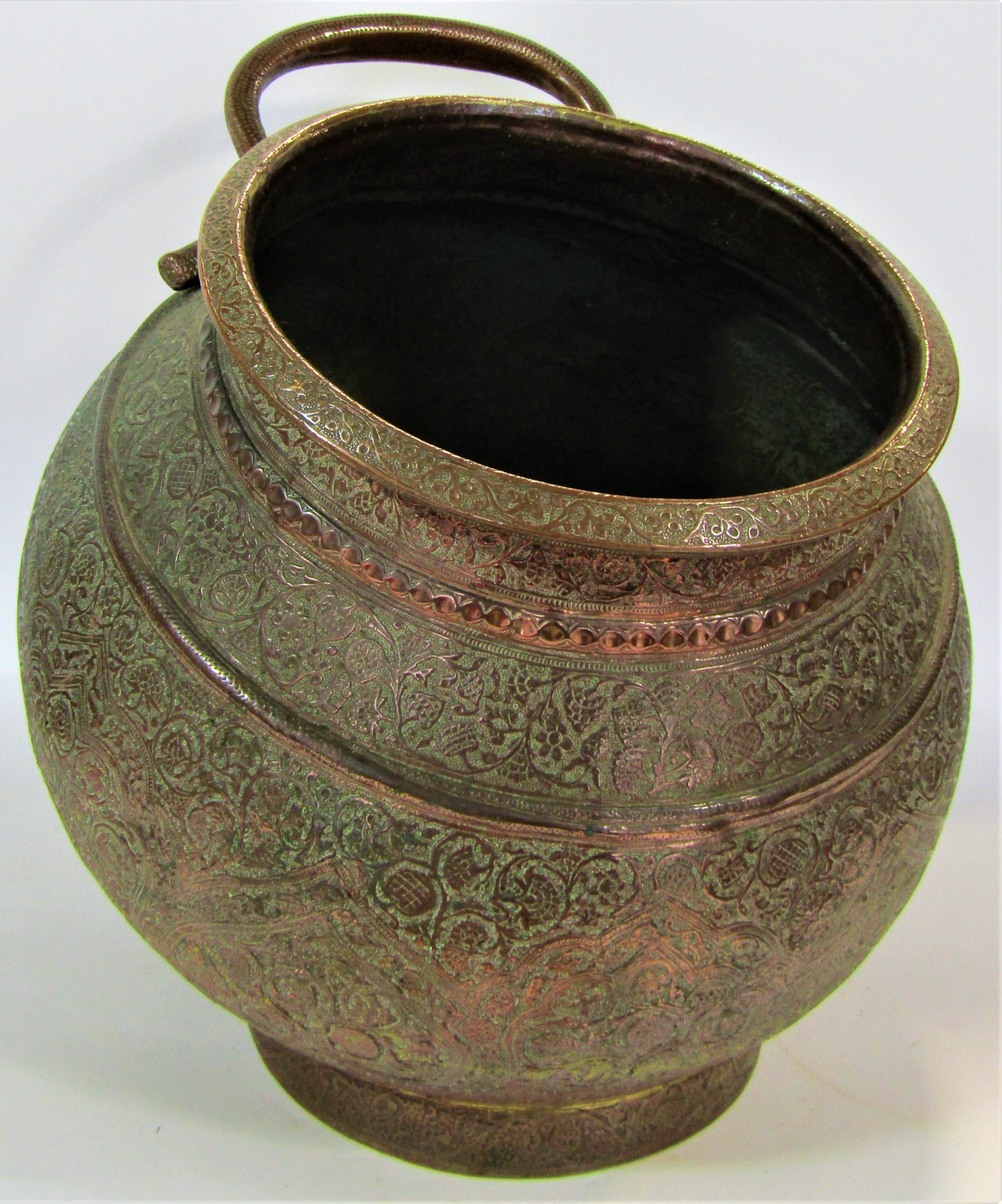 Good quality 19th century Indian copper cauldron with finely worked repeating detail, the loop handle in the form of a snake