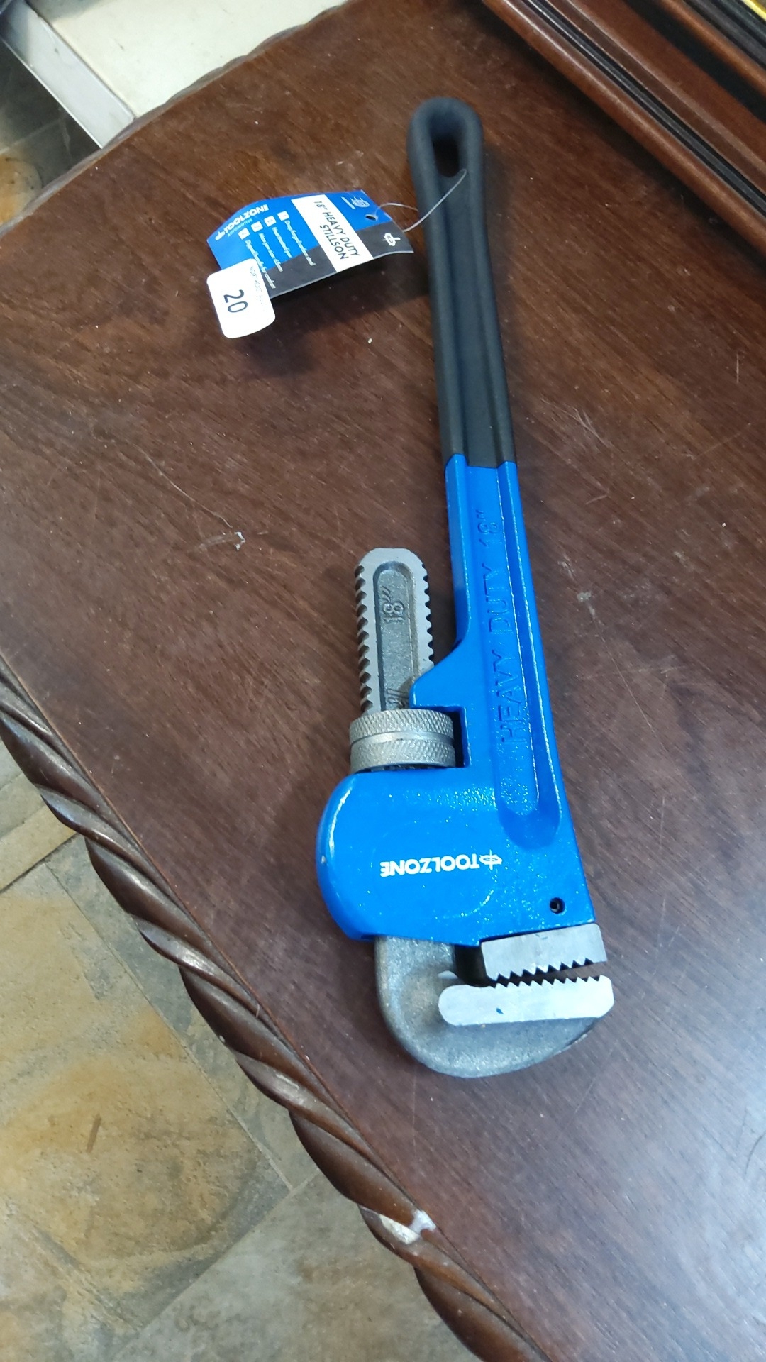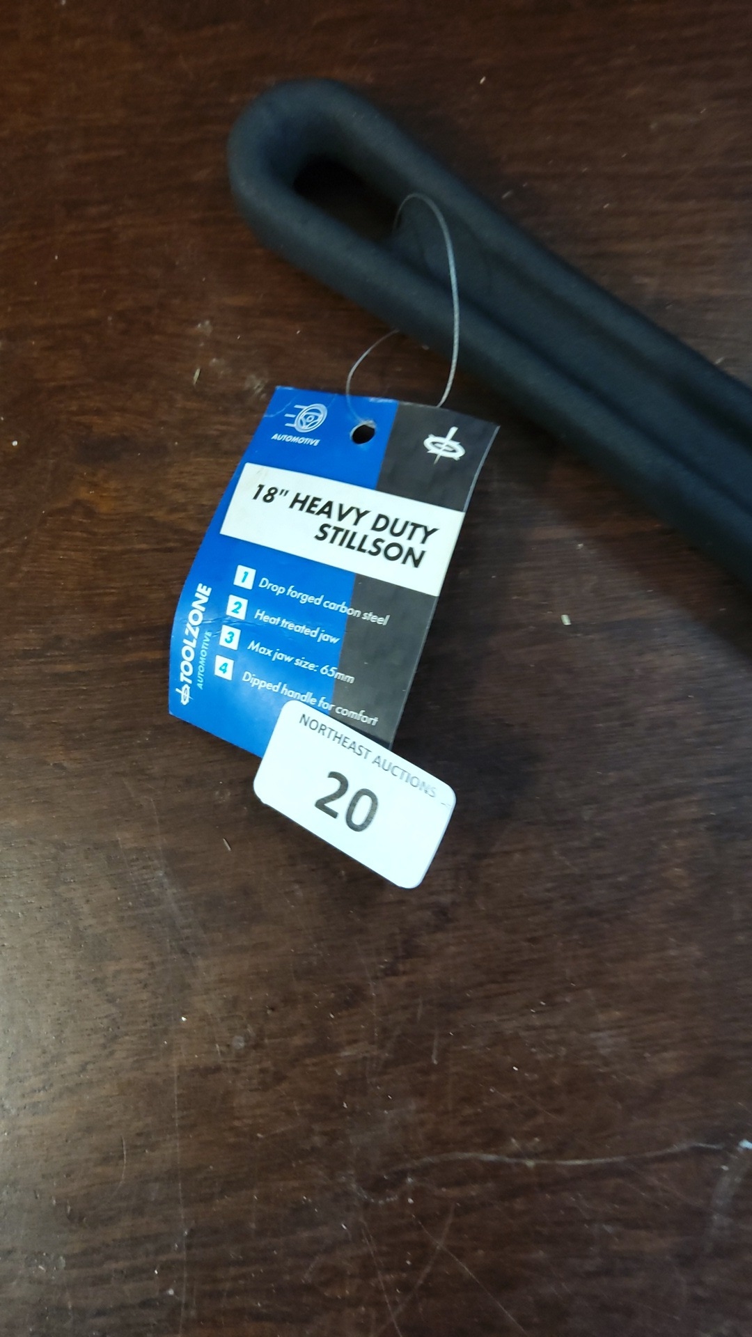 Toolzone Automotiv 18-inch heavy duty Stillson pattern pipe wrench—drop-forged carbon steel with heat-treated jaw, knurled adjusting nut and dipped handle; maximum jaw size stated 65mm, retaining original hang tag.