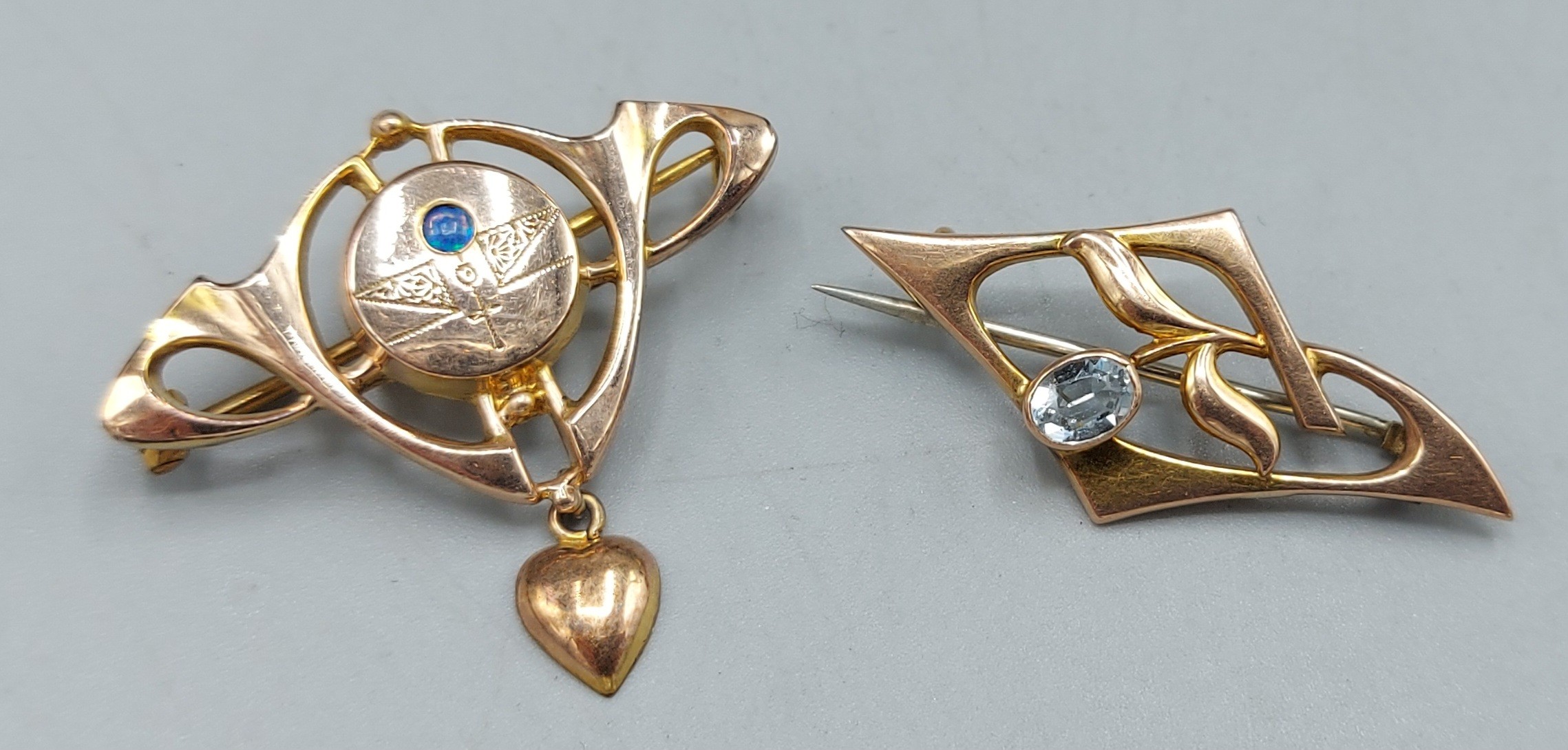 A 9ct gold brooch of pierced form together with an unmarked brooch, 3.6gms