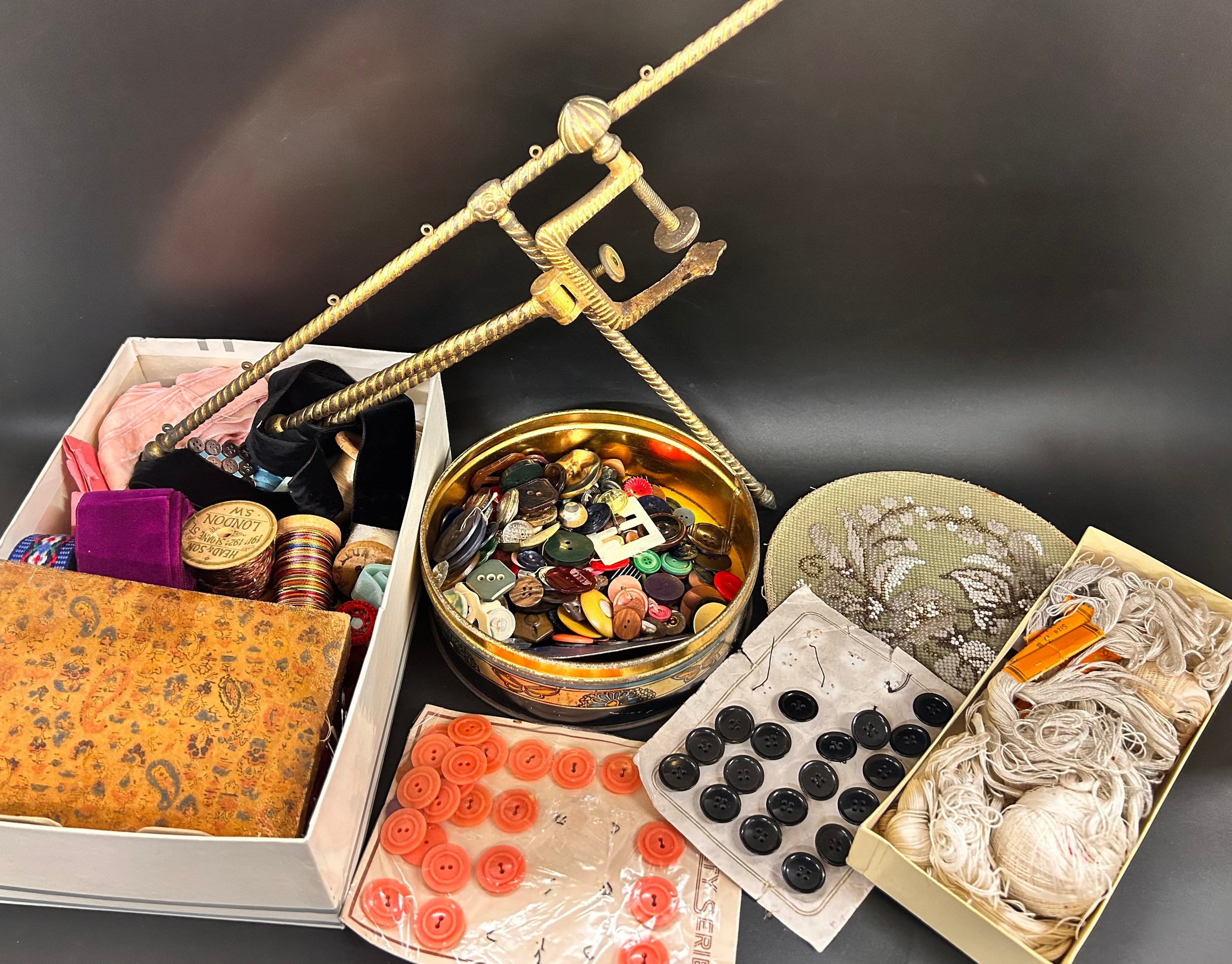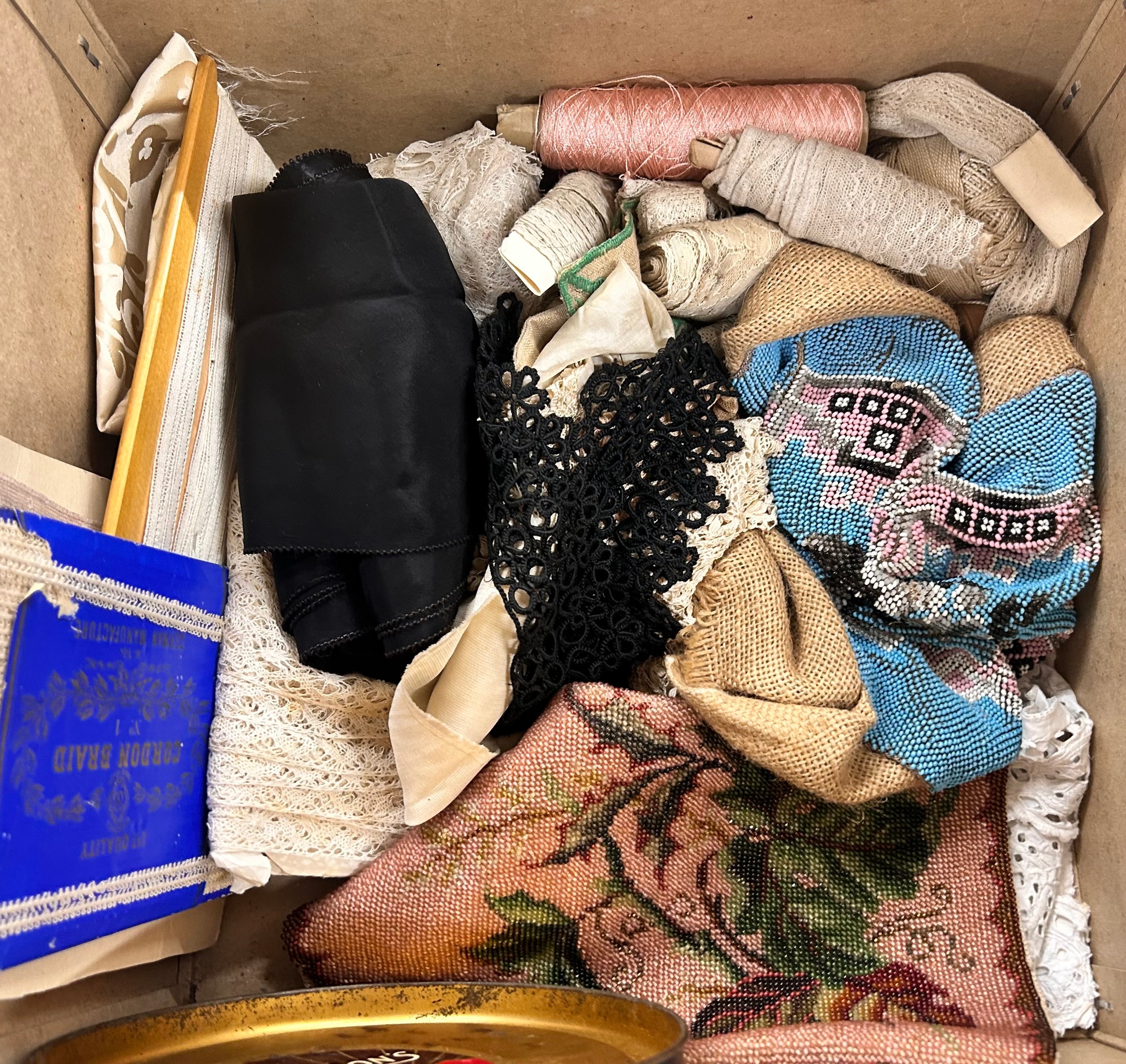 A collection of haberdashery, to include beadwork, lace, ribbons, thread, buttons, etc.