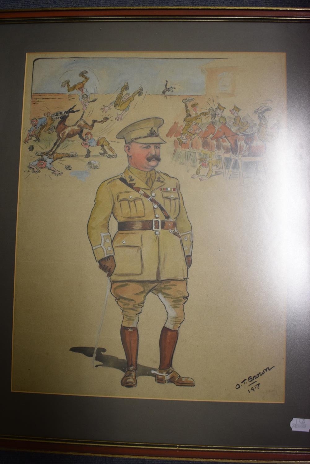 A T Brown, Lieutenant A Edmondson with his men learning to ride horses on barrels, watercolour heightened with bodycolour, signed and dated 1917, 54 x 41 cm, a group of Asterix books, an Asterix poster, and a Brazil Railway Company share certificate