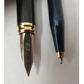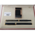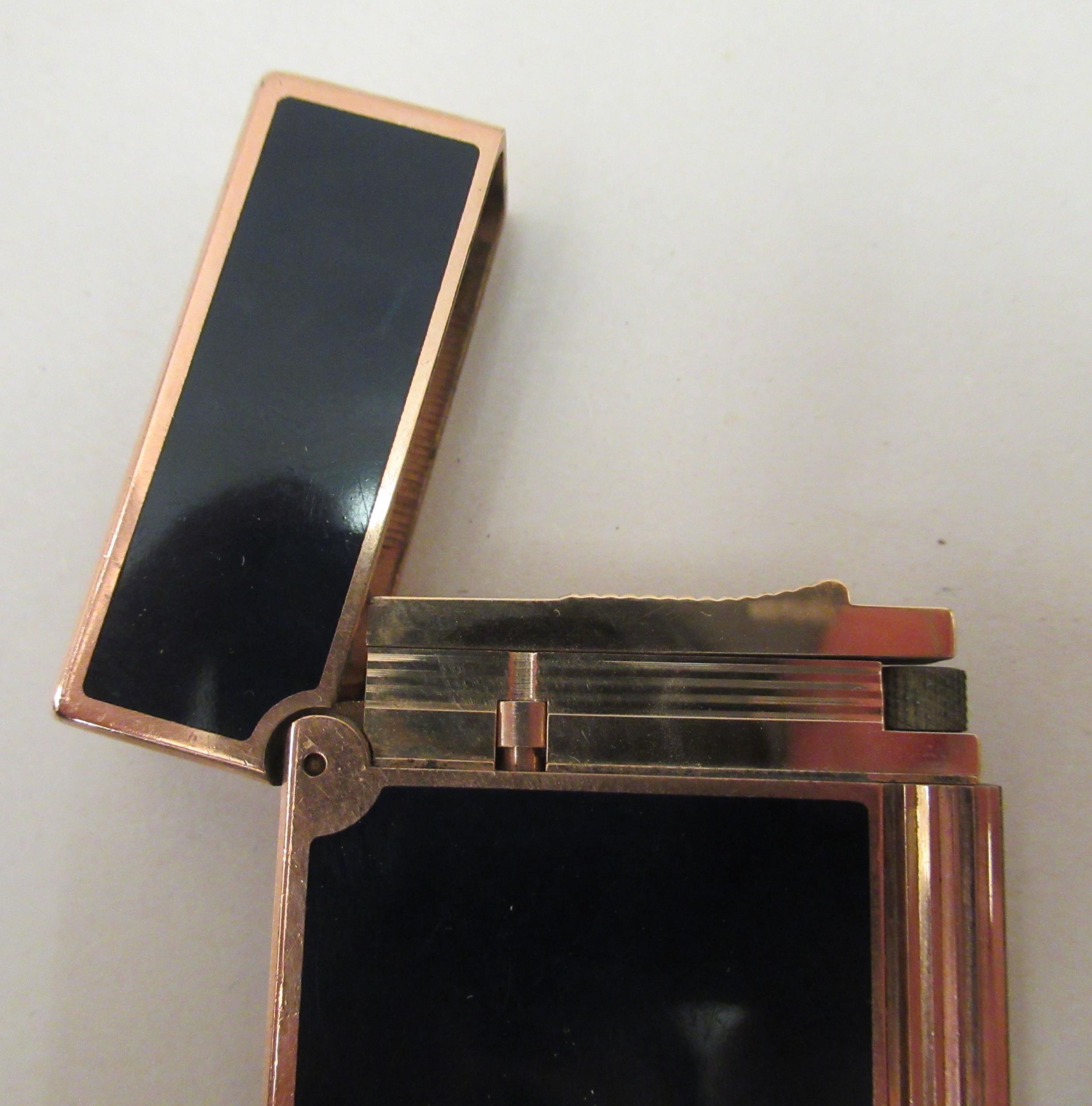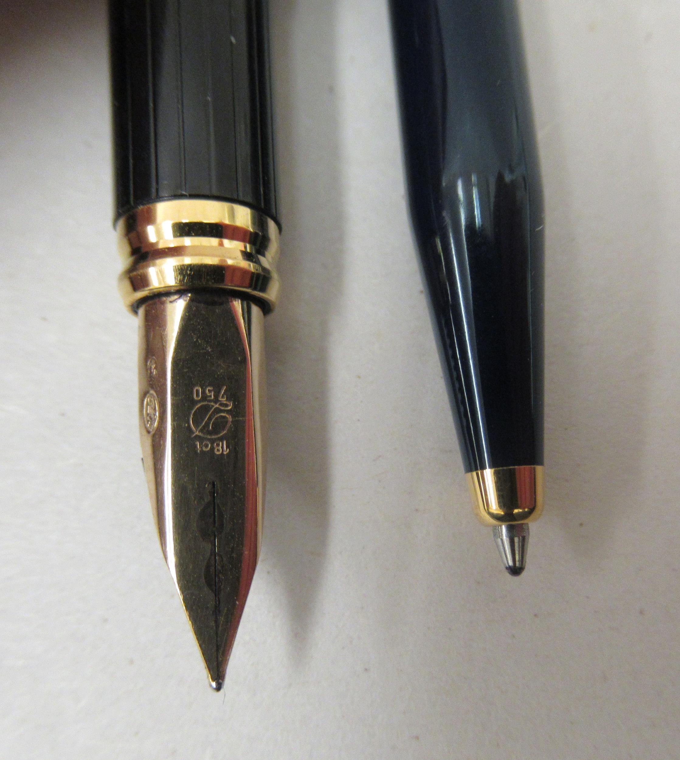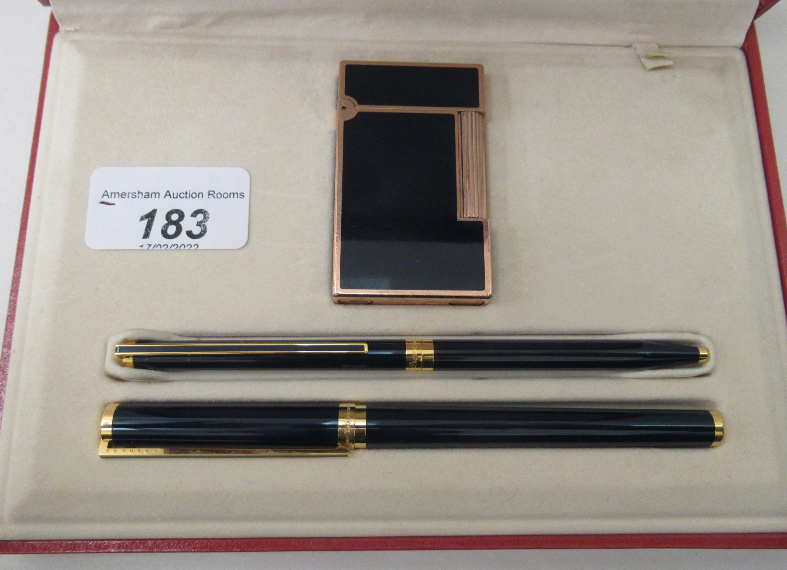A Dupont presentation set comprising a gilt metal and blue/black enamelled Laque De Chine cigarette lighter No.10AEU16, a ballpoint pen; and a fountain pen No.531D299 cased