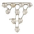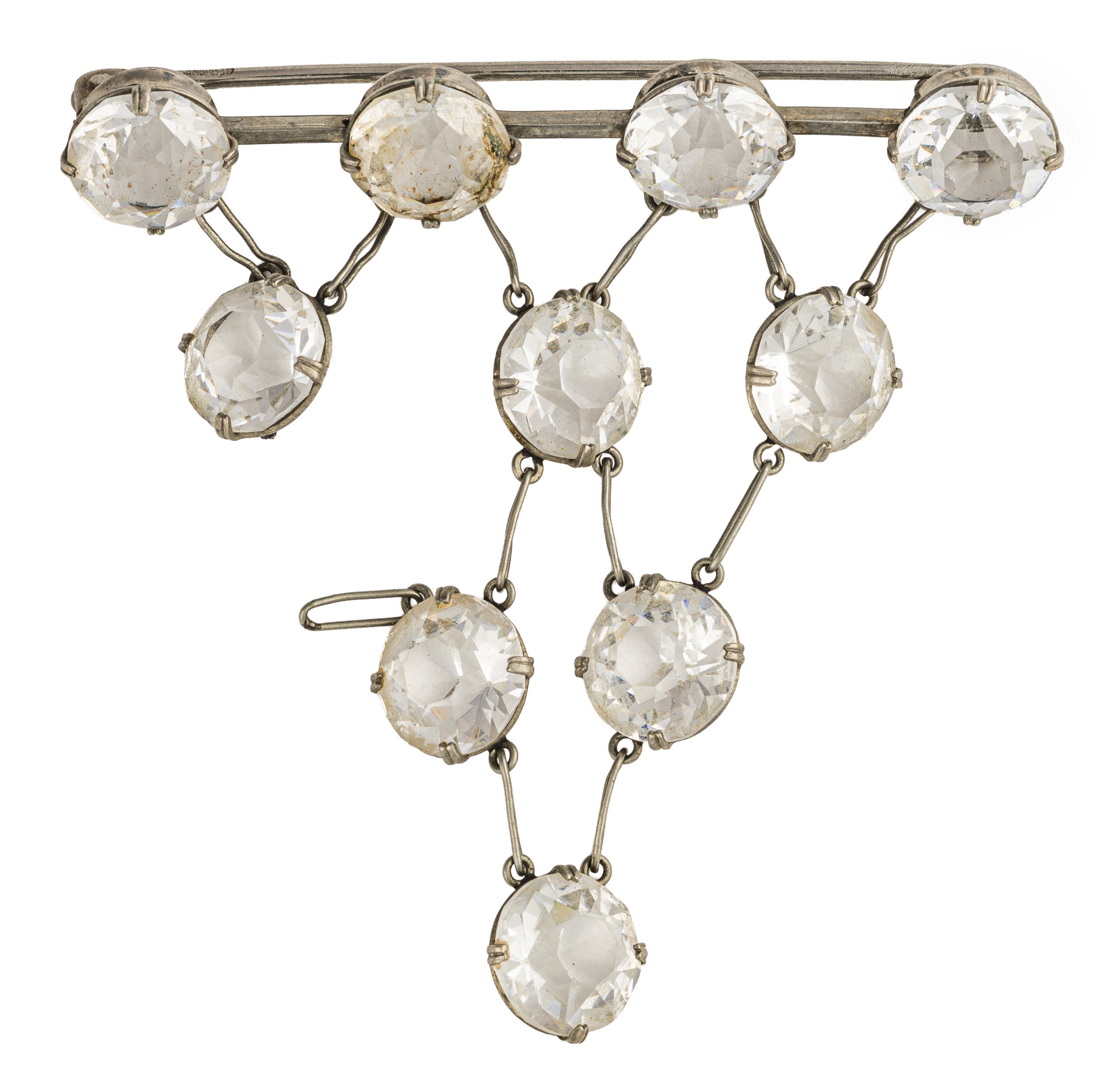 Claw set round brilliant cut white topaz with a combined weight of approximately 25 carats, silver lattice link brooch, length 5cm