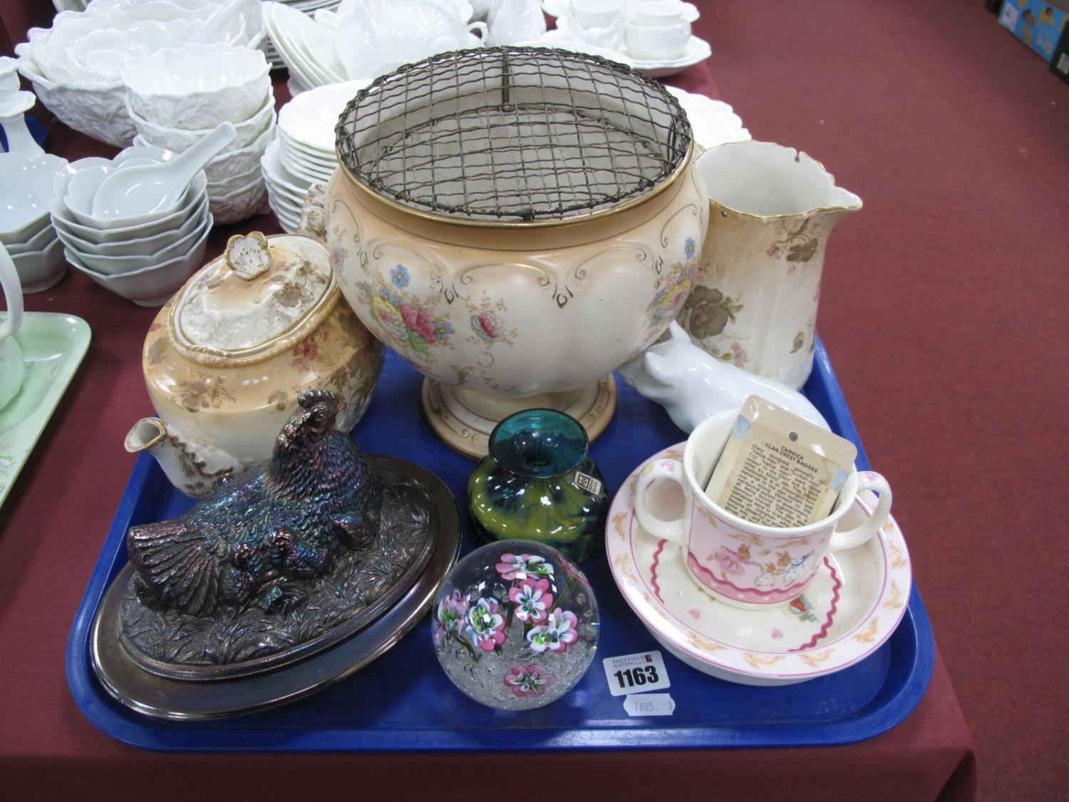 A Crown Devon Jardiniere, glass hen on nest, Mdina spill vase, Bunnykins, etc:- One Tray.