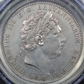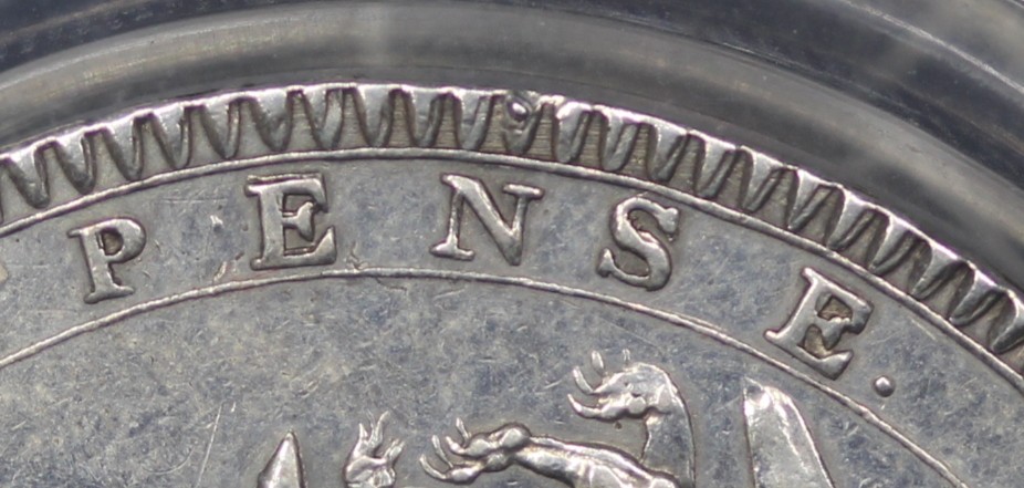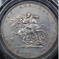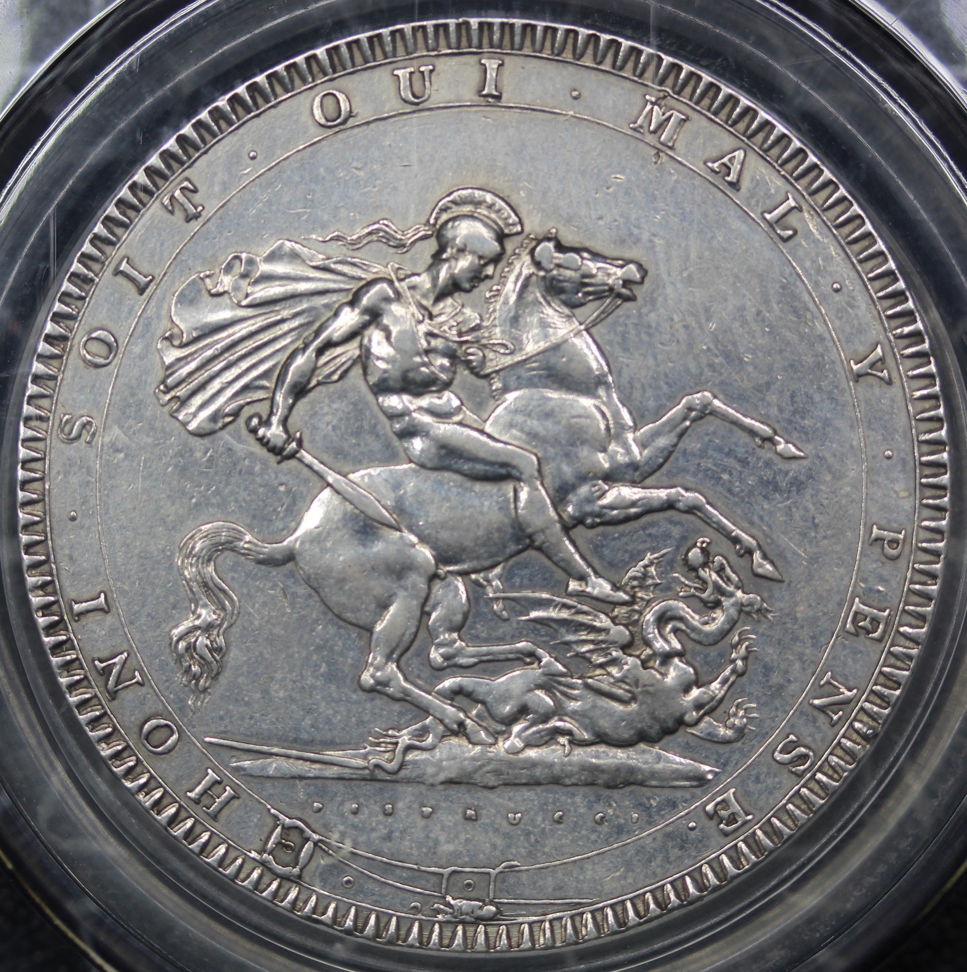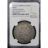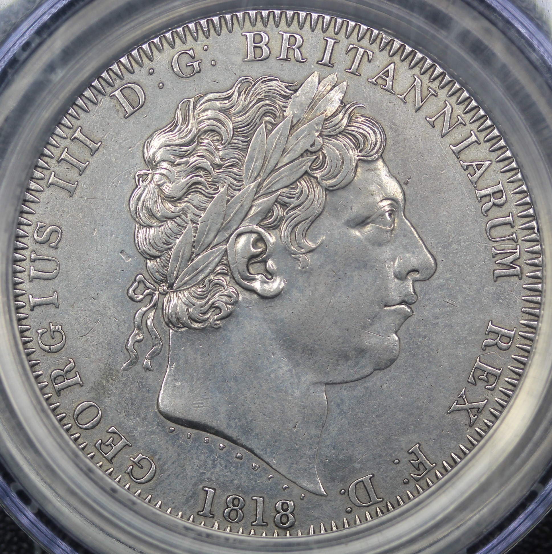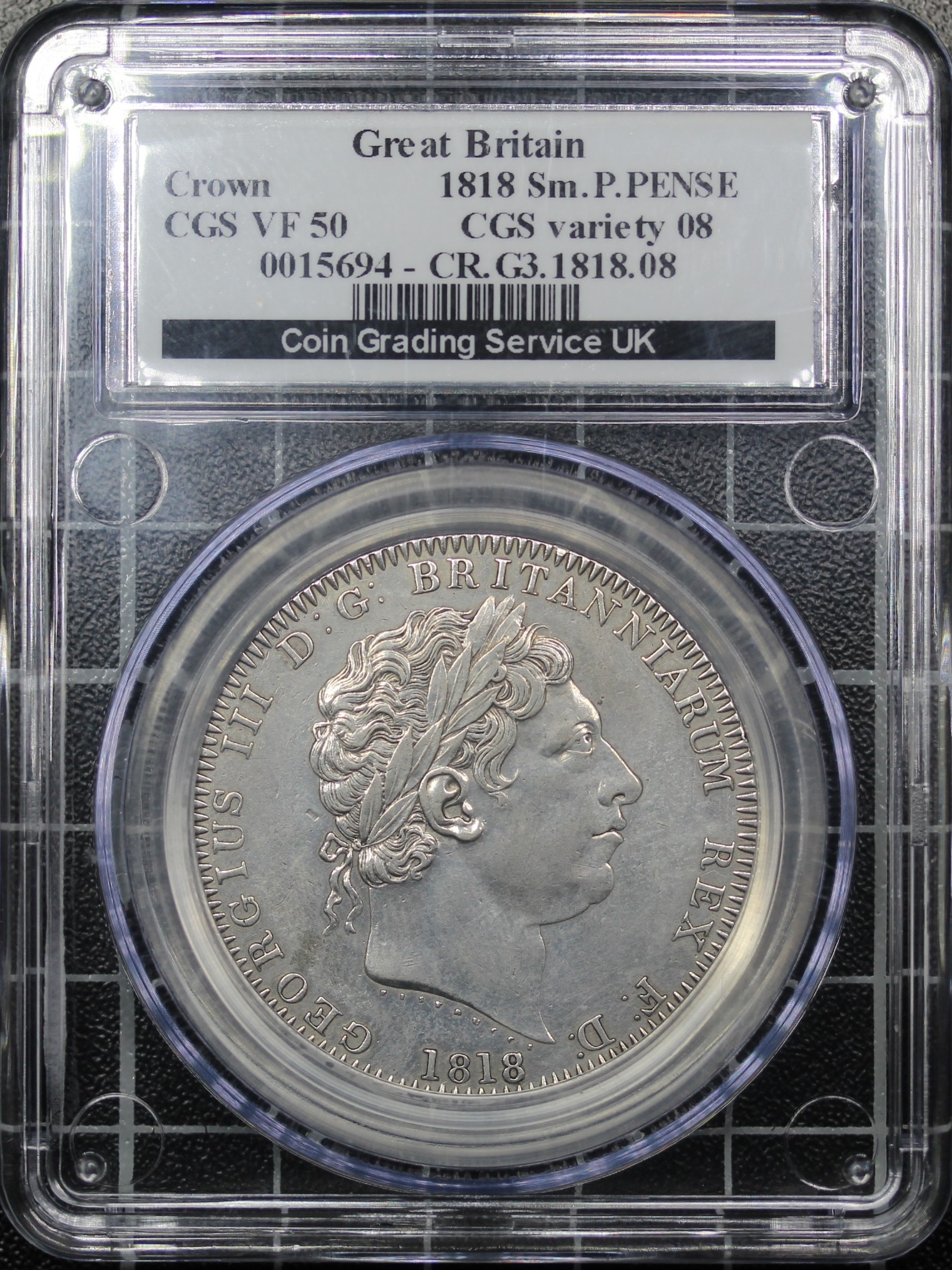 1818 Crown, Edge LIX, George III (ESC 214, Bull 2009, S.3787). Small P in PENSE and with trace last 8 over 8. Presented in a CGS holder and graded VF-50 though of bright appearance and sometime cleaned.